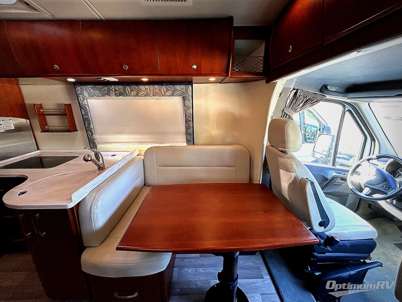 You will enjoy plenty of seating with a belted chair to the right of the door, the passenger and driver seats swivel to the back when parked, and there is an L-shaped bench behind the driver's seat for plenty of space to enjoy meals and conversation with a pedestal table between.