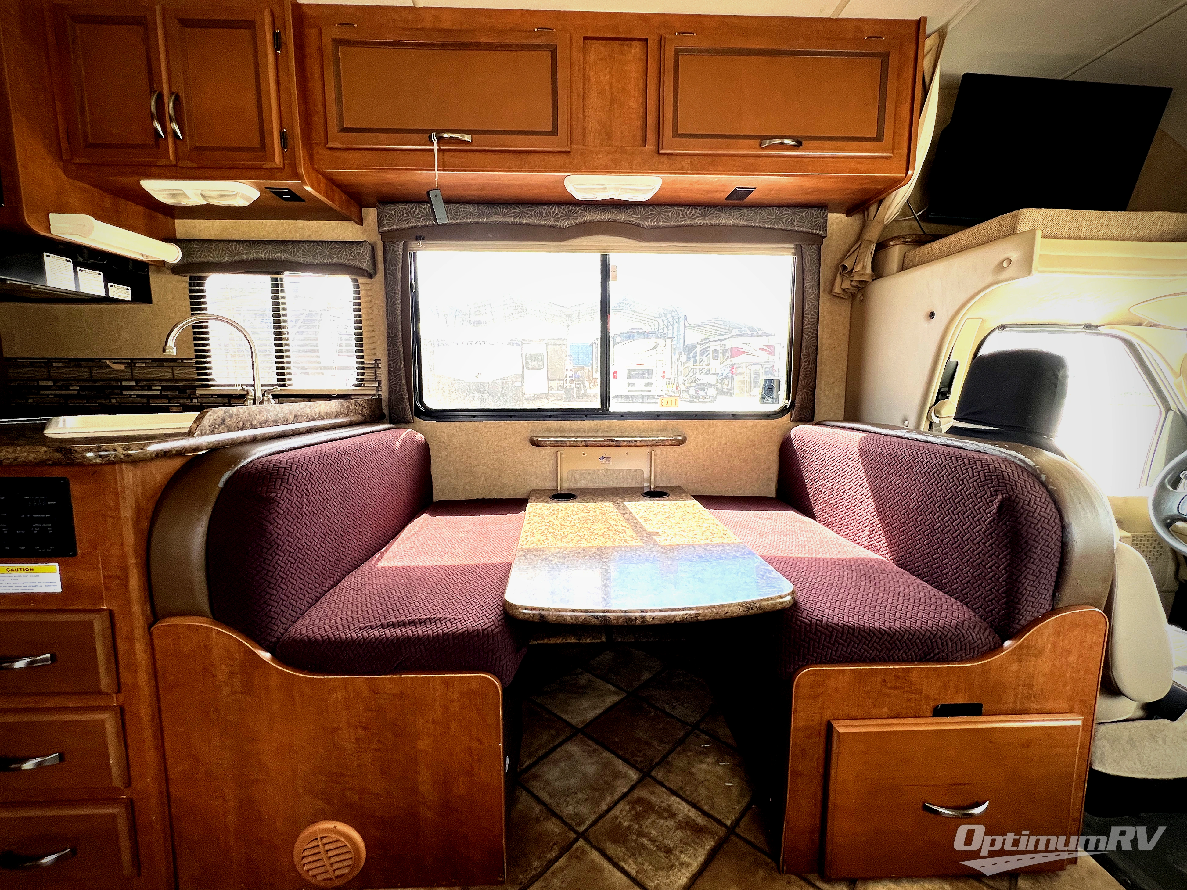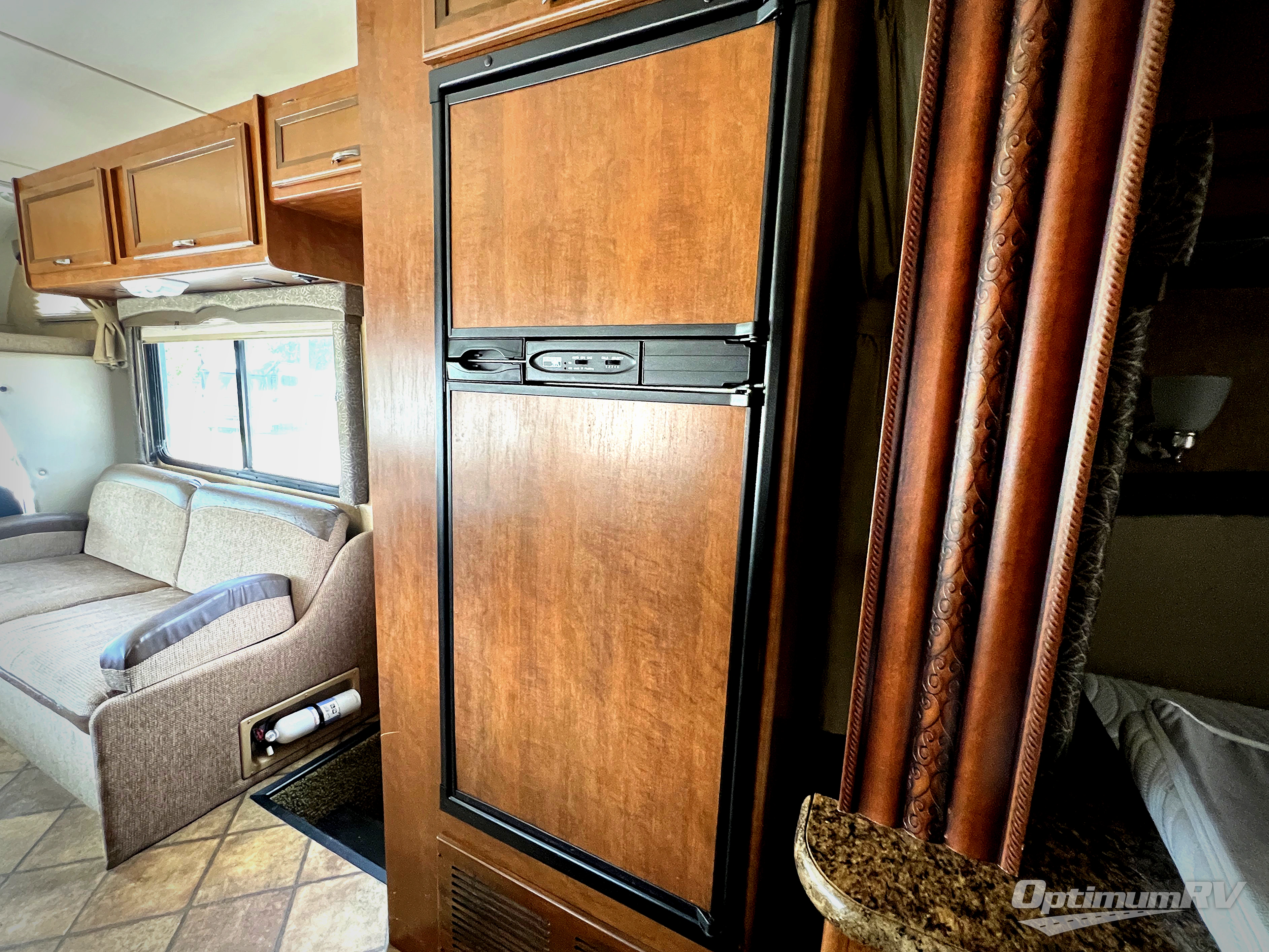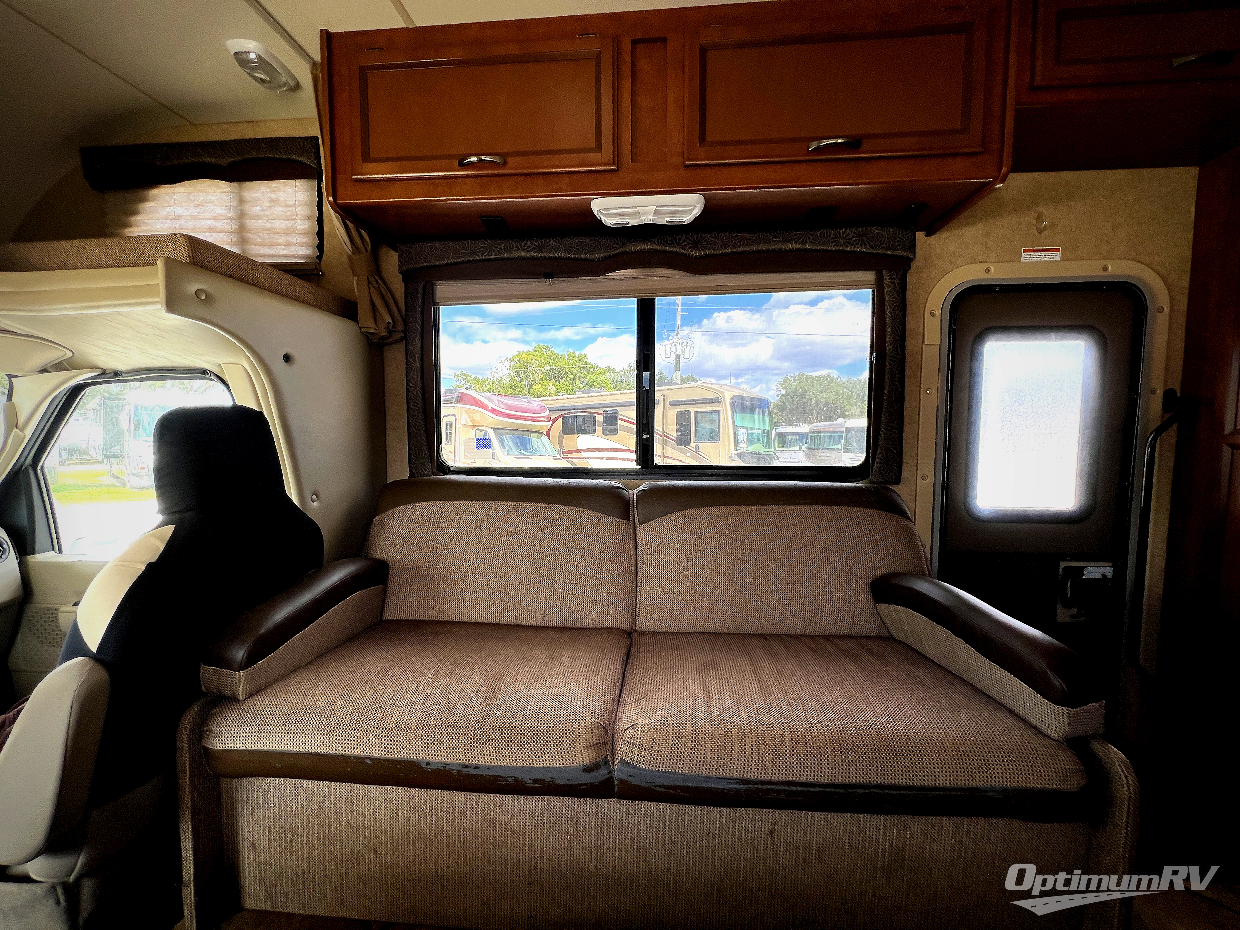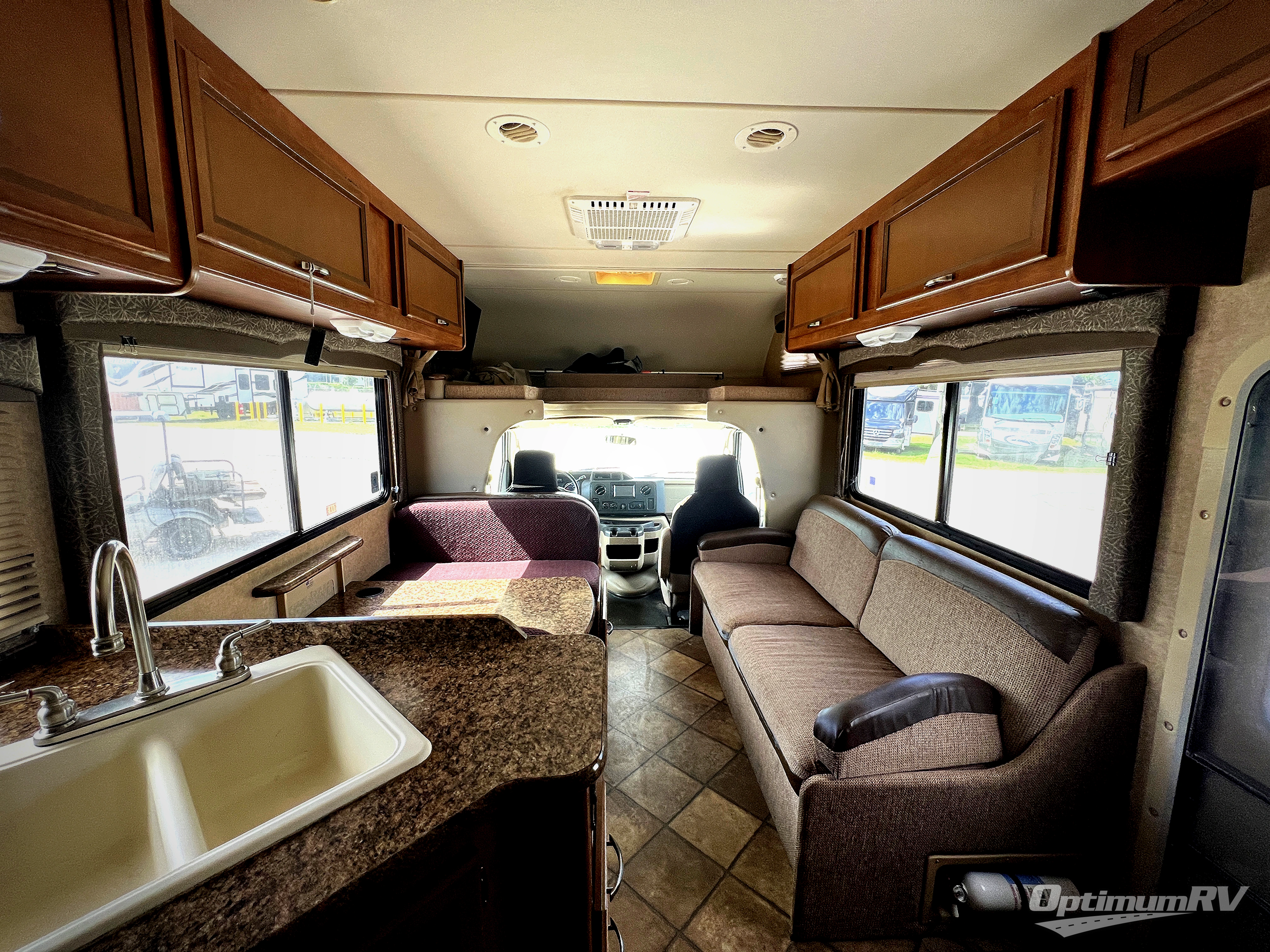 As you enter this class C motor home, a sofa is to your right. A cab over bunk runs across the front, with a 22" LCD TV on the driver's side. Continuing around, a booth dinette with overhead cabinets and the kitchen are along the driver's side. The kitchen includes an angled large bowl kitchen sink, overhead microwave, overhead cabinets and a three burner range. A closet is at the end of the counter. The refrigerator is on the opposite wall.