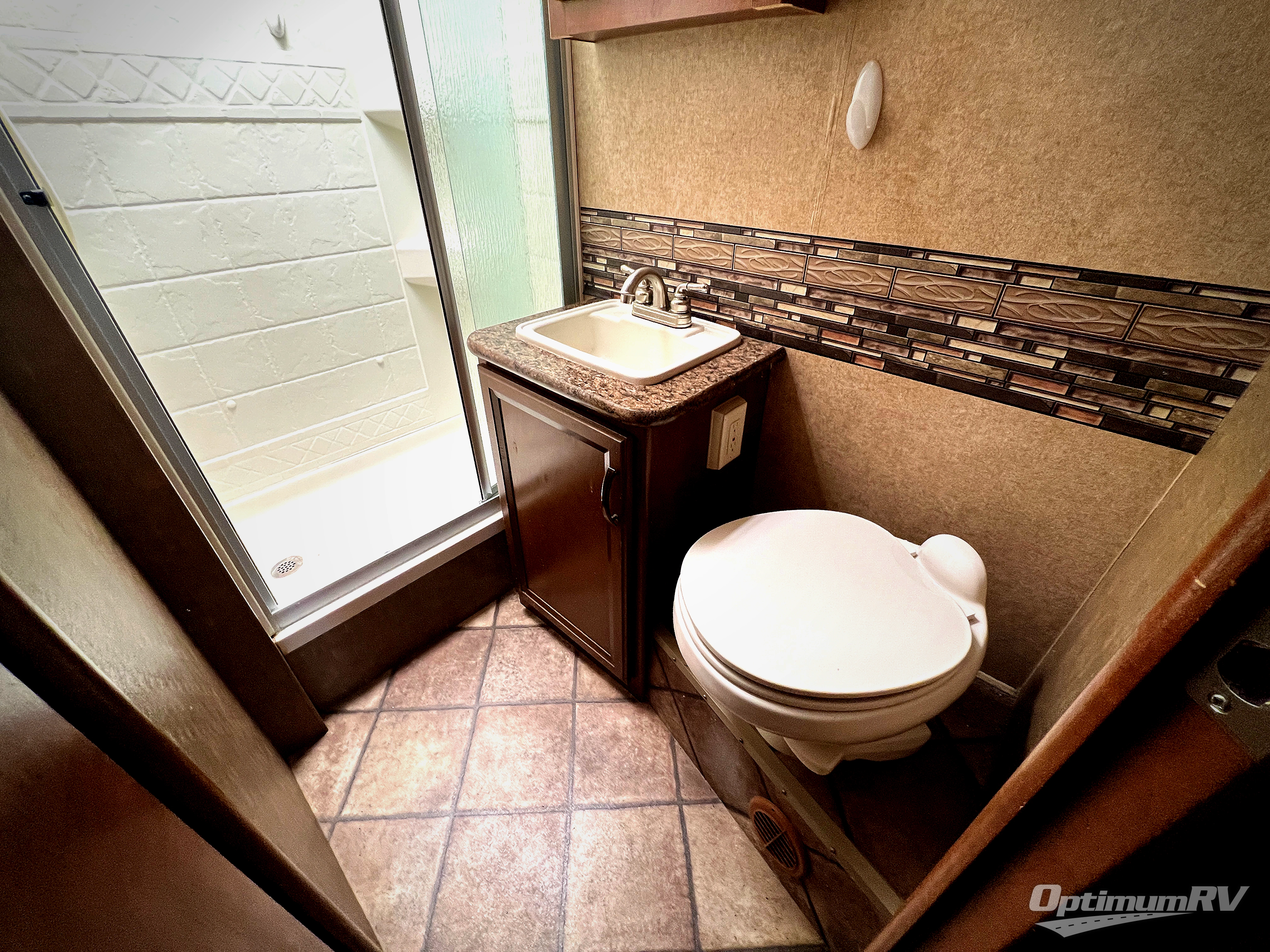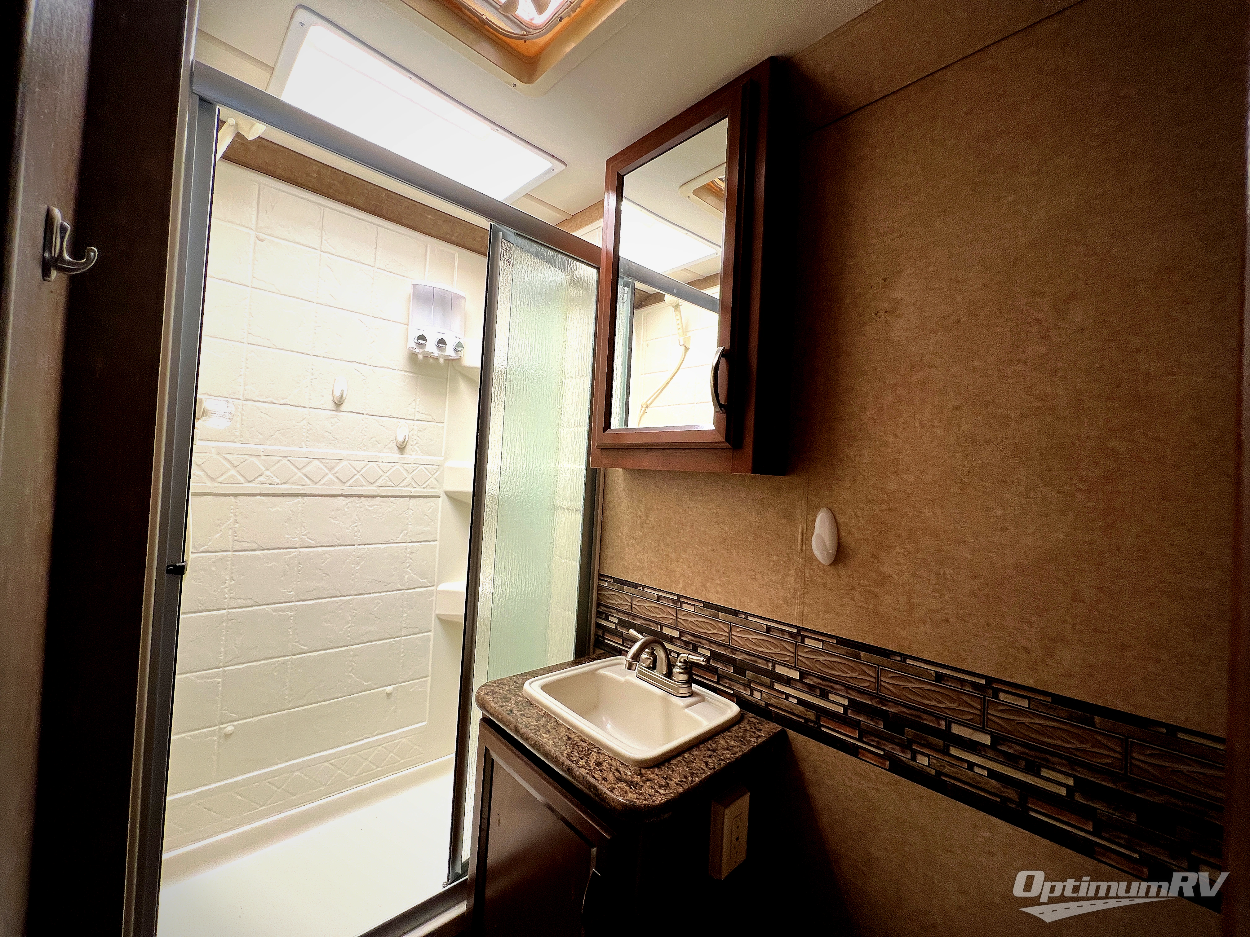 The rear corner bathroom provides a toilet, vanity sink, medicine cabinet and shower. A queen bed slide out is at the opposite rear side wall from the bath and includes overhead cabinets at the head of the bed.