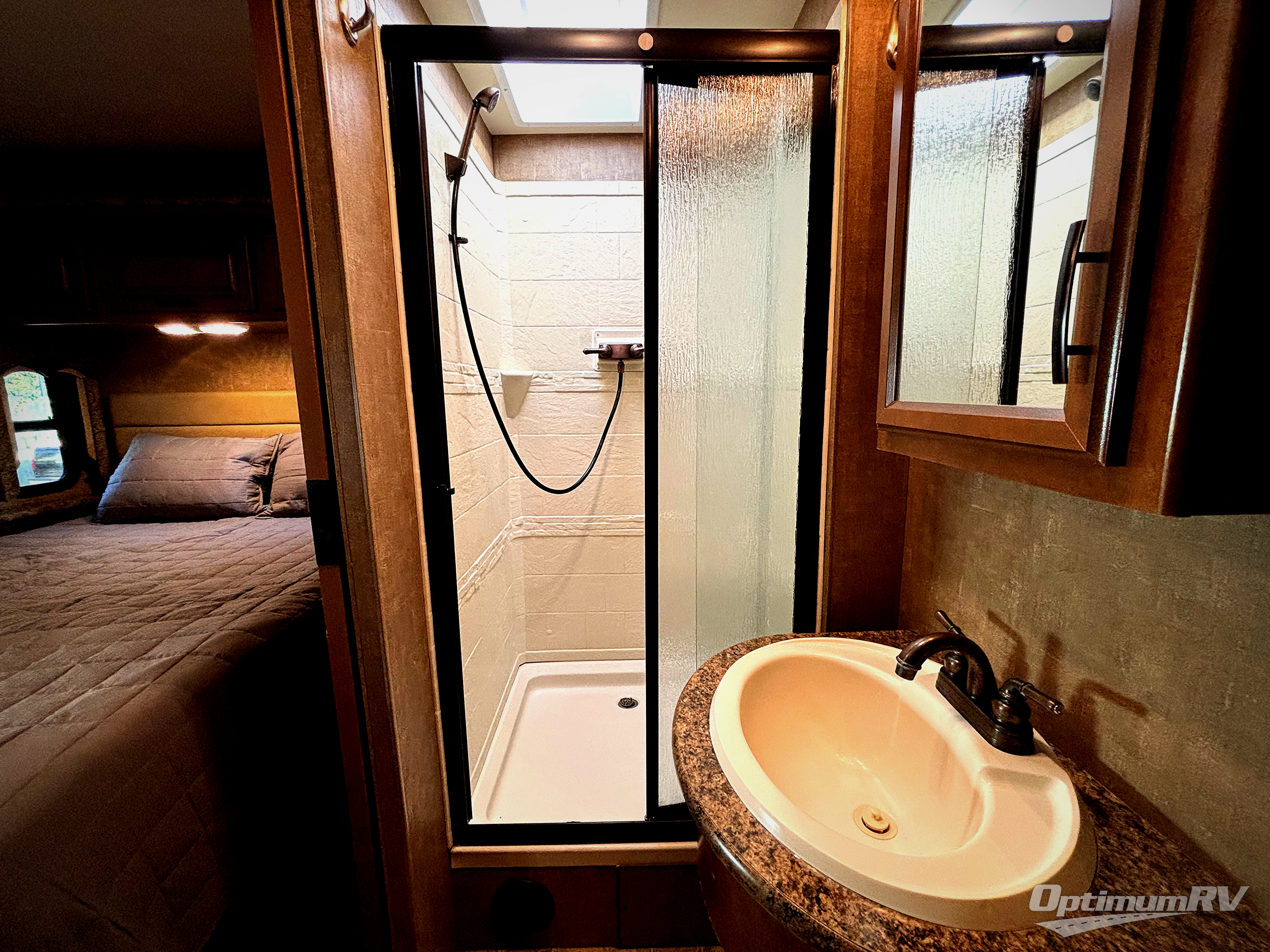 The rear of this motor home holds a full bathroom with shower, large vanity with sink, medicine cabinet, linen storage, overhead cabinets and toilet.