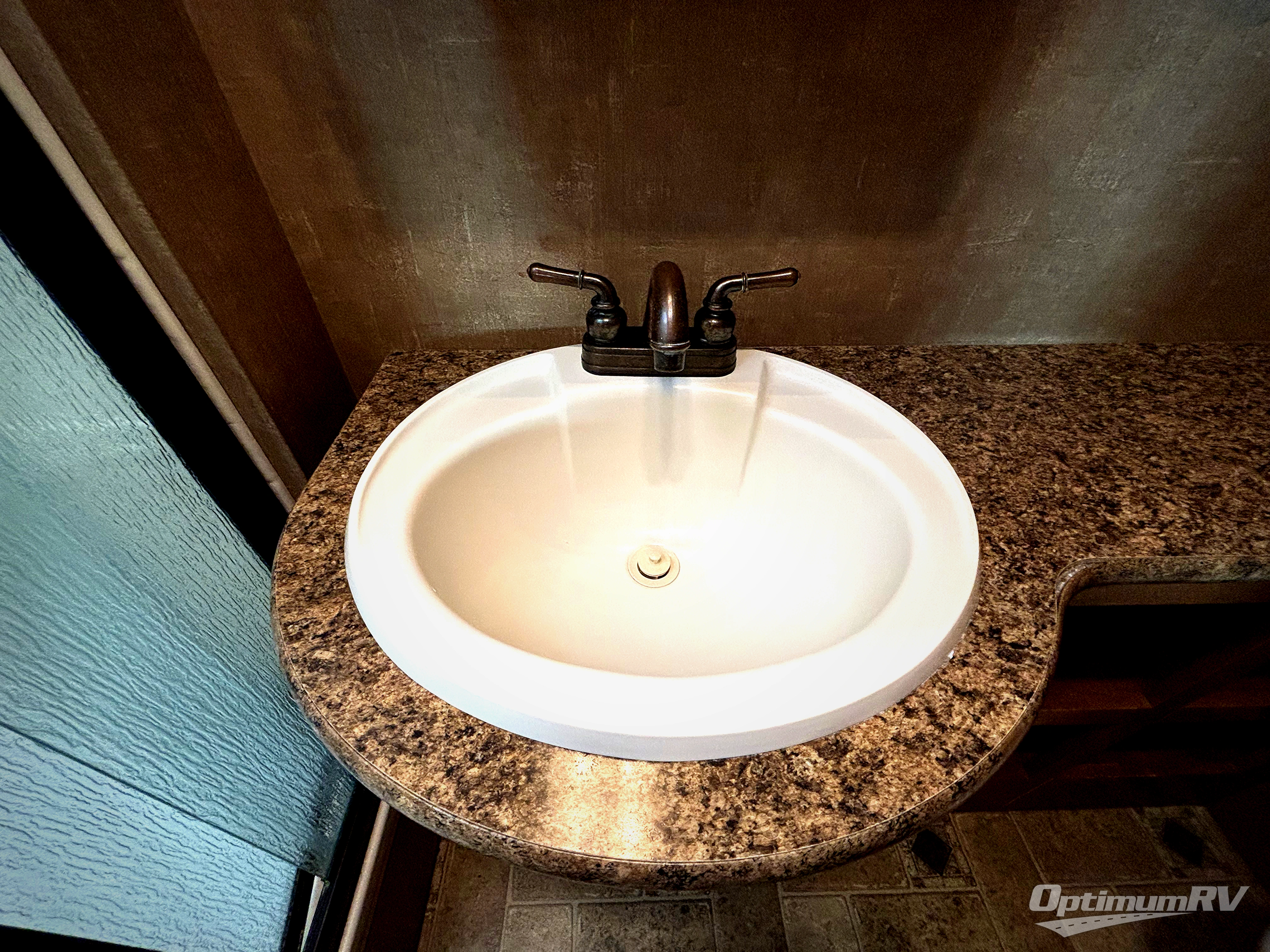 In the living/kitchen area a generous slide out houses a hide-a-bed sofa, u-shaped dinette and overhead cabinets. A 32" LCD TV is mounted on the angled outside wall of the half bath for convenient viewing from the slide out.