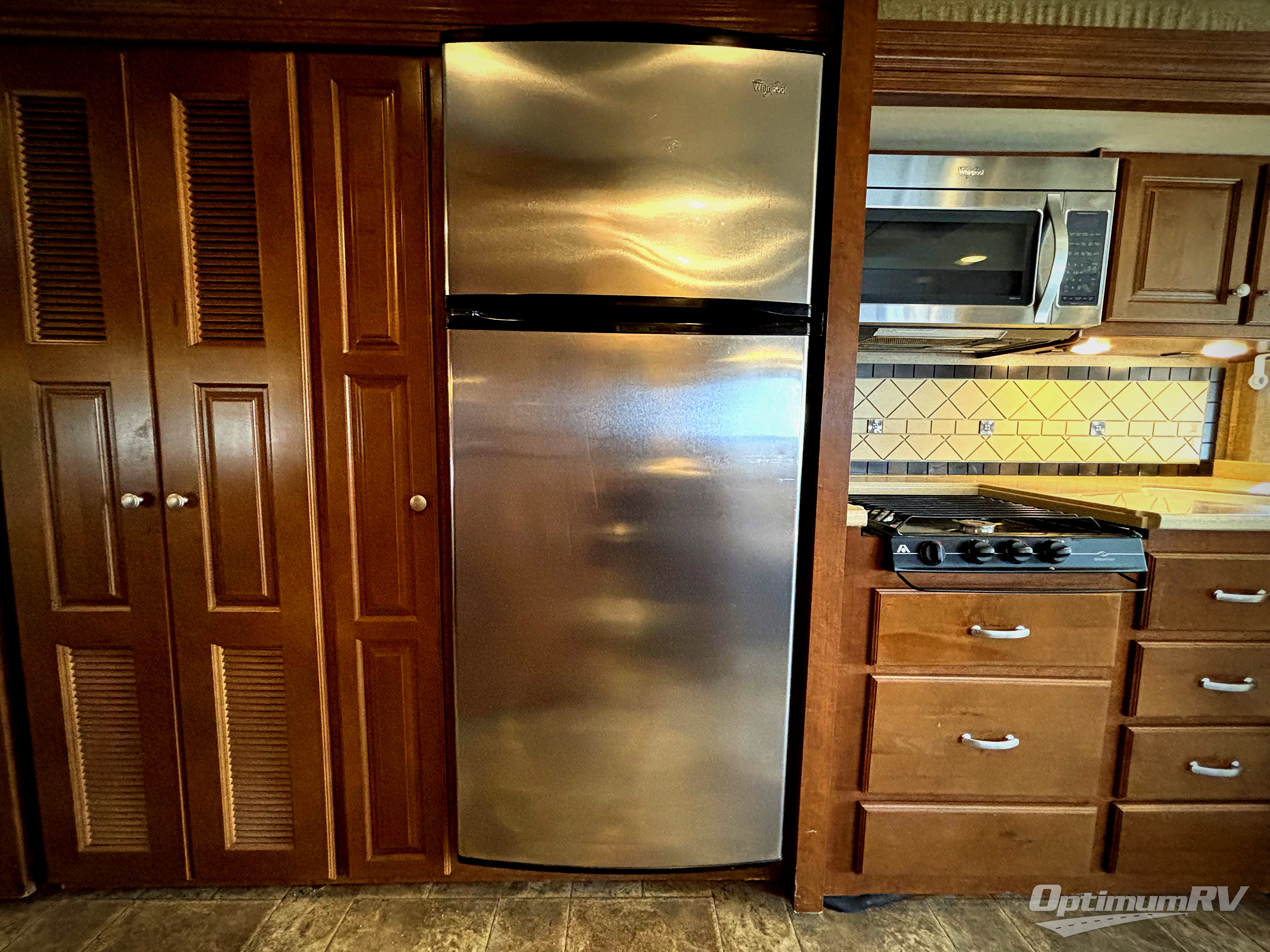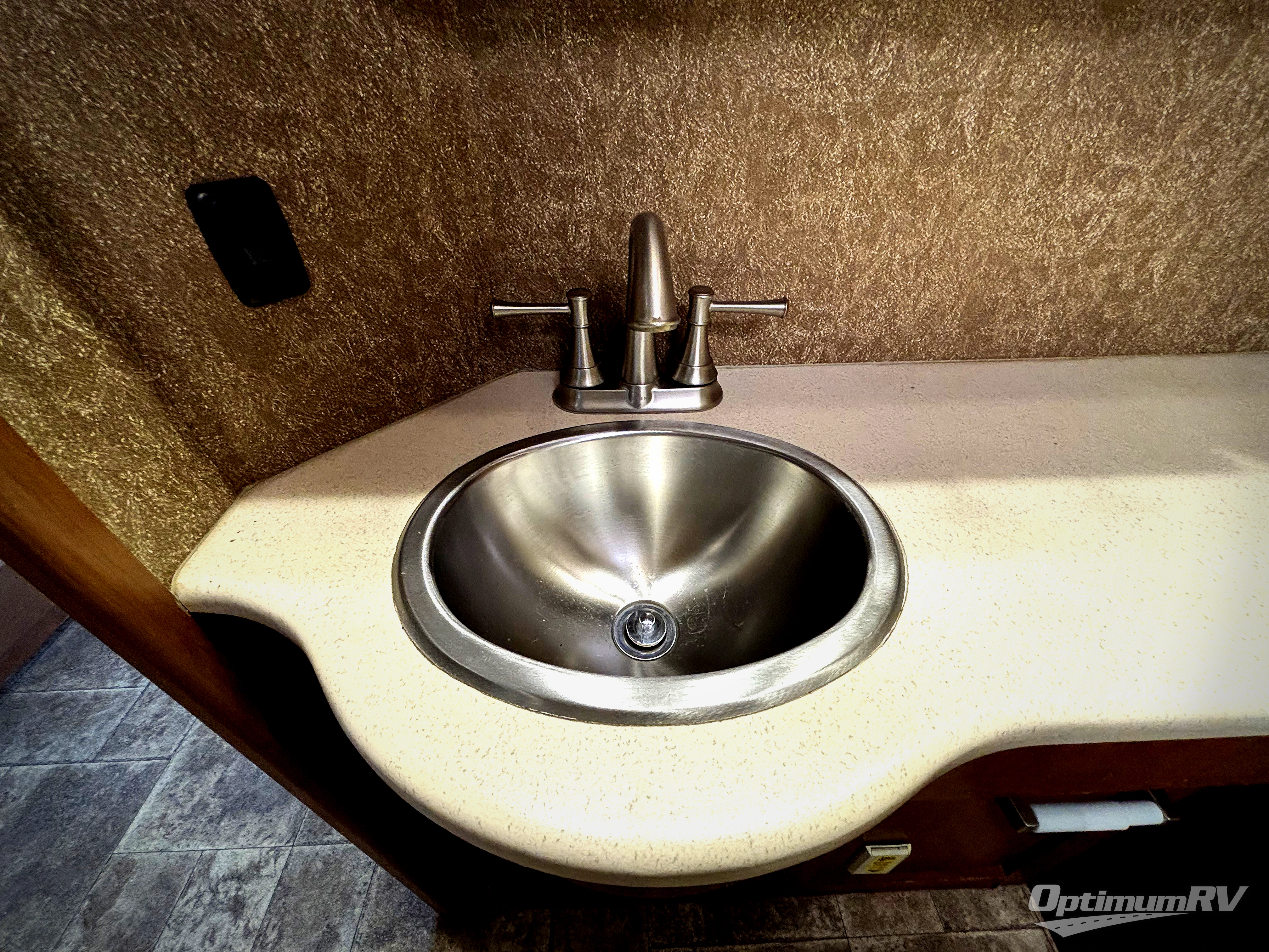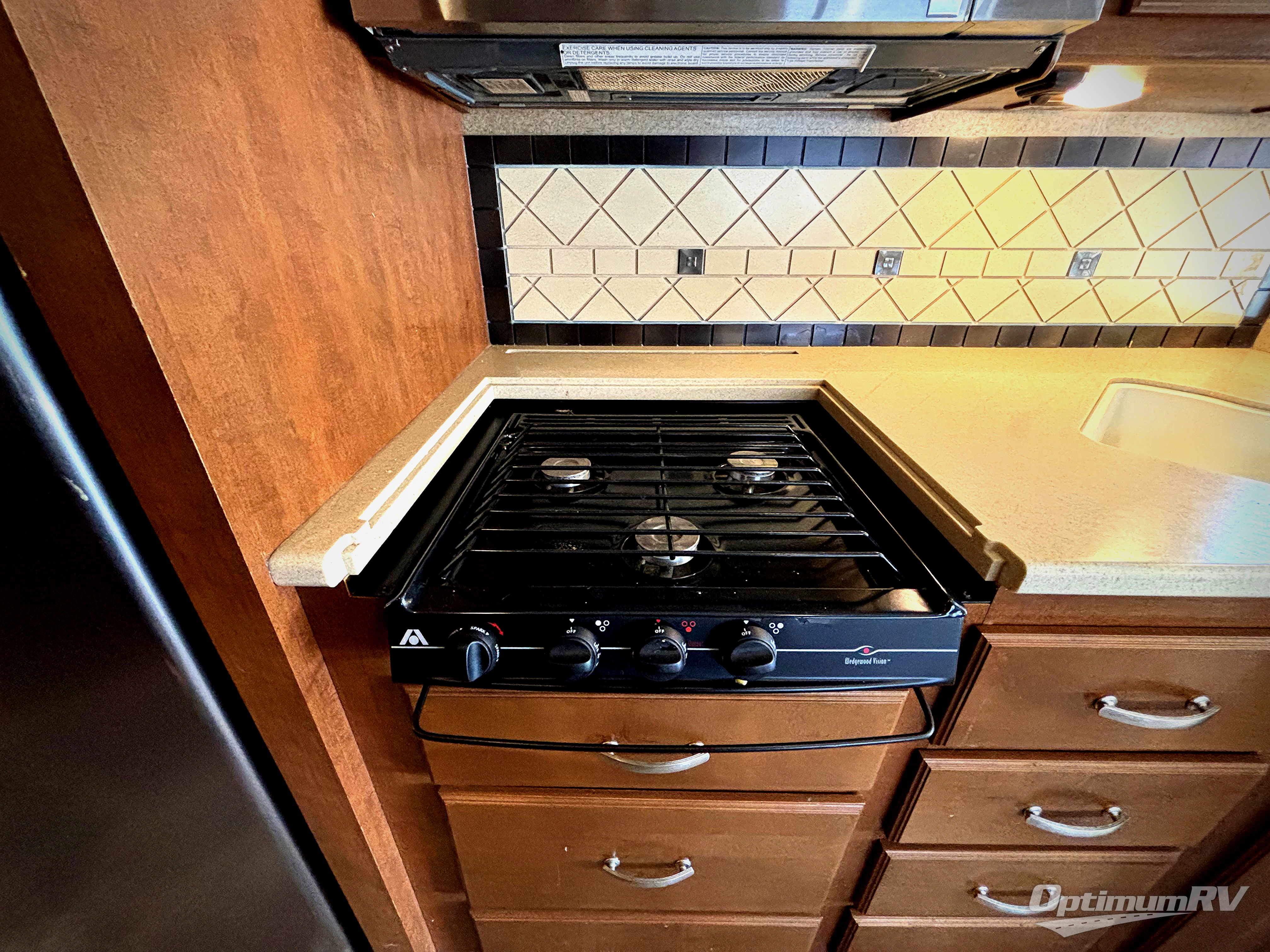 Along the road side, a generous slide out houses a dream dinette booth with a 32" TV mounted above it. There is also an angled double bowl sink, three burner range, overhead cabinets, a refrigerator, pantry, optional washer/dryer and a closet.