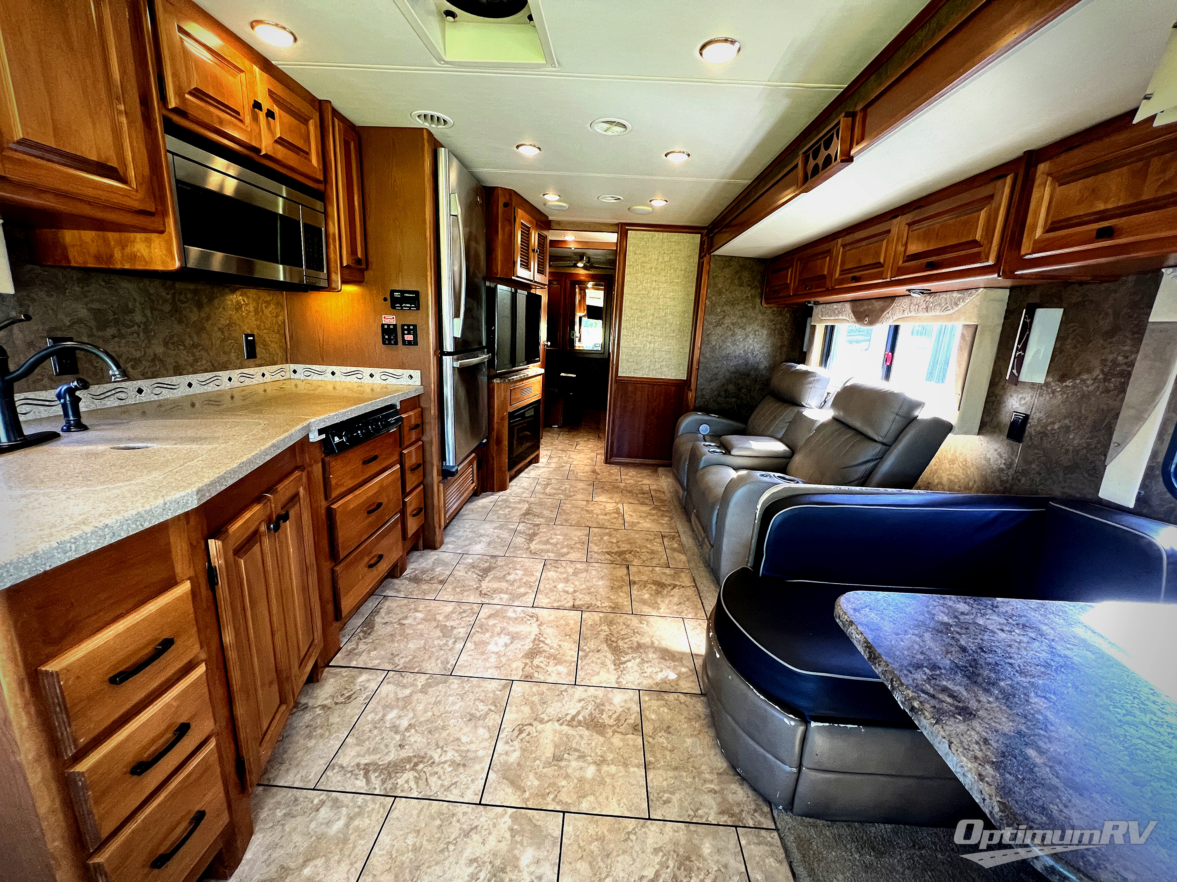 The living/dining slide houses a booth dinette and a chaise sofa bed with coffee table as well as overhead cabinets. You may choose a dinette with computer workstation and/or a recliner with ottoman and sofa/sleeper. A TV is mounted on the opposite wall for easy viewing from all of the seating. You many choose an optional fireplace below the TV in the entertainment center.