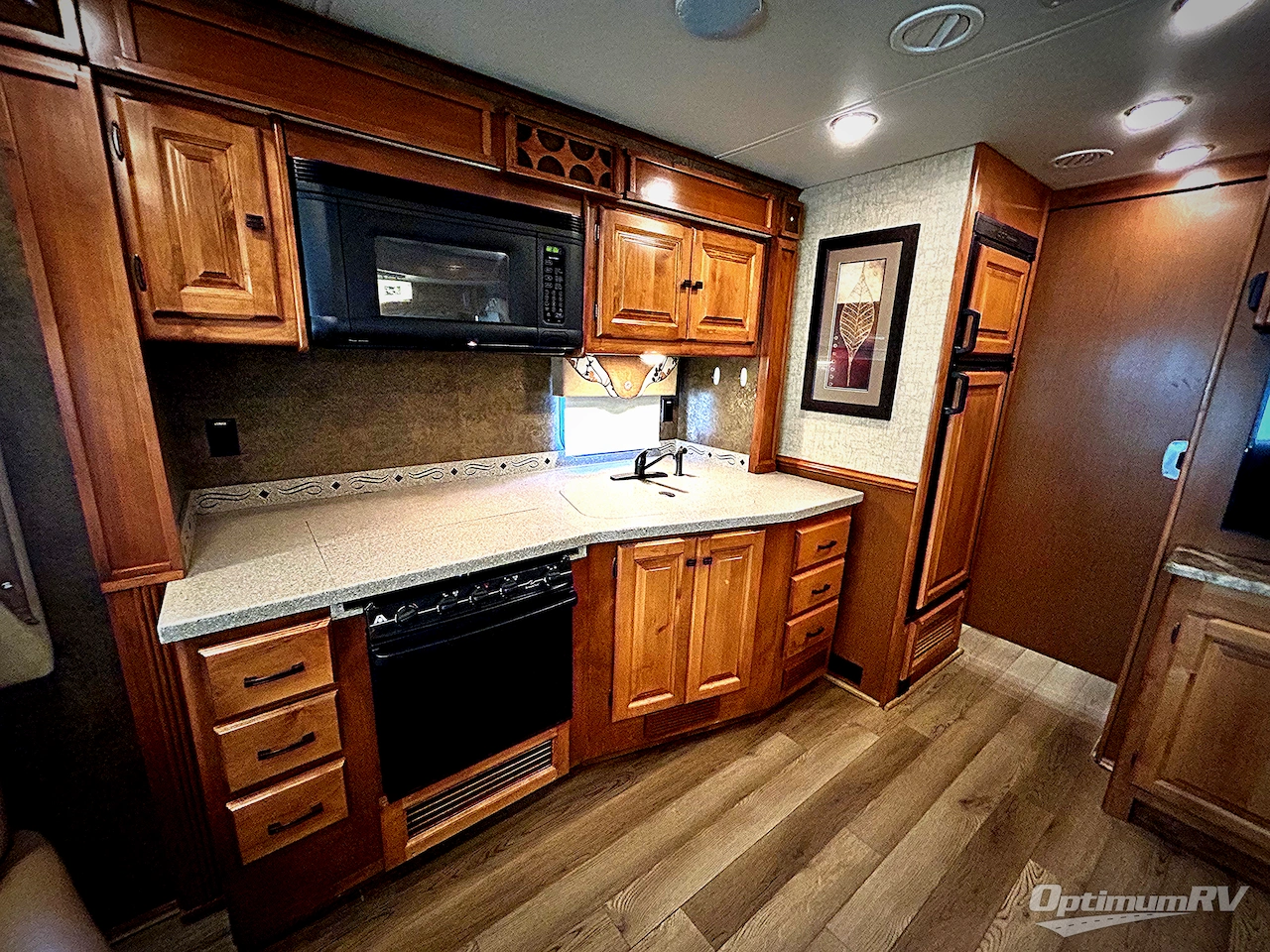 The road side offers a generous slide housing a sofa bed, booth dinette and overhead cabinets. You may choose a dinette with computer workstation in place of the booth dinette. A standard TV with a pantry below is on an inside wall that faces the front of the coach.