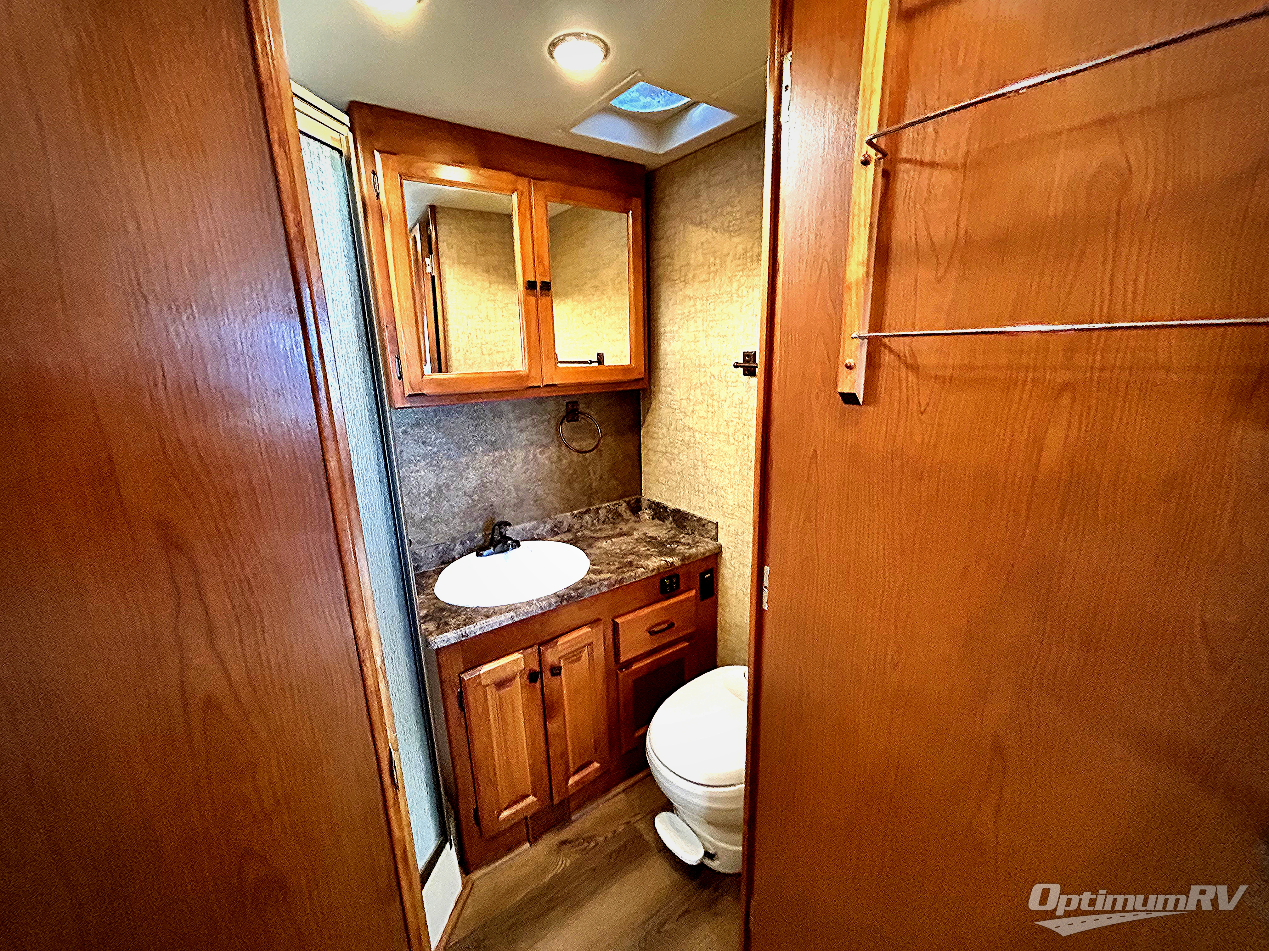 Bunk beds are along the curb side just outside the bedroom. Across the hall is a full bathroom with linen storage, a corner shower, a large vanity sink, overhead medicine cabinet and toilet.