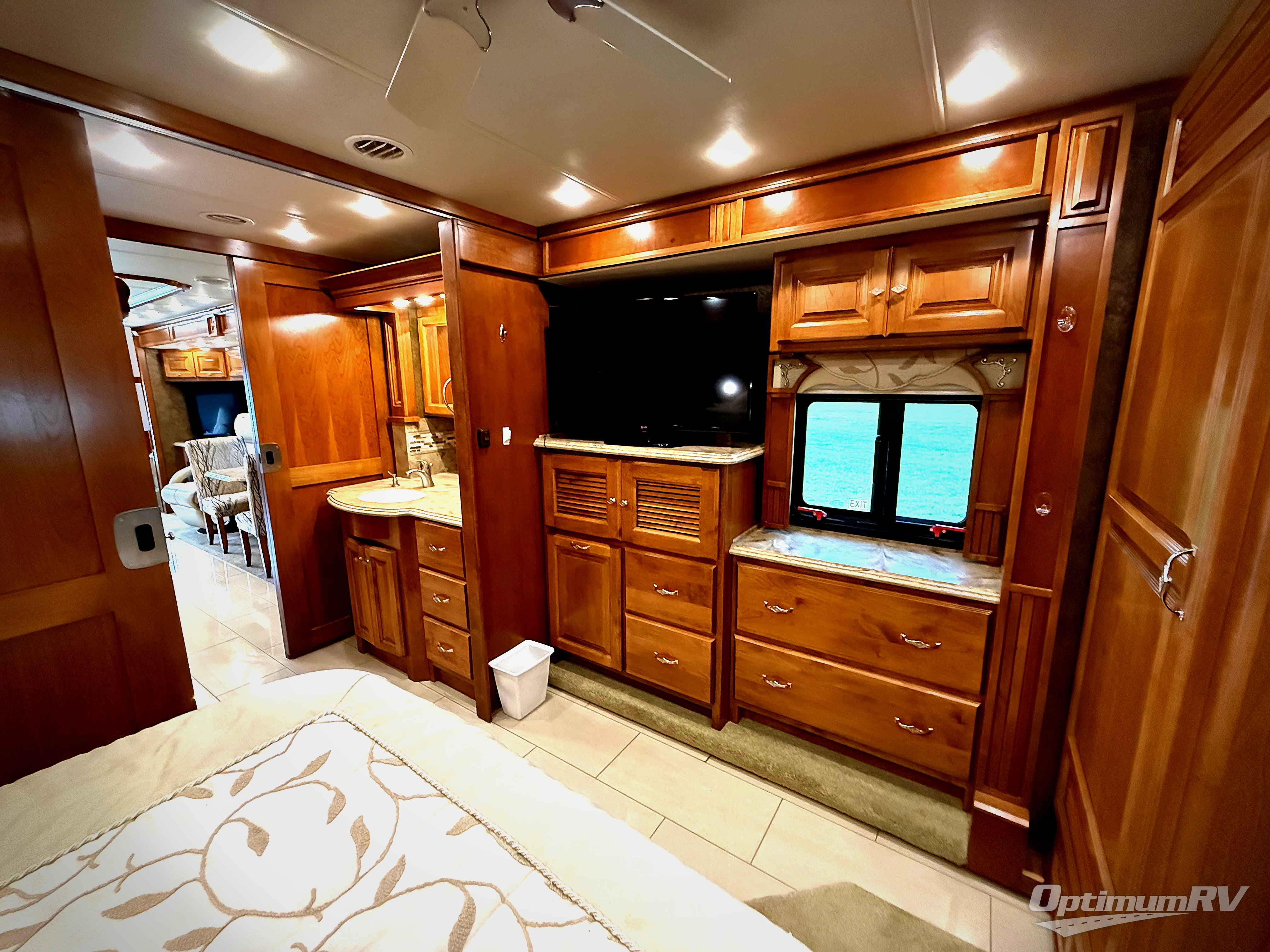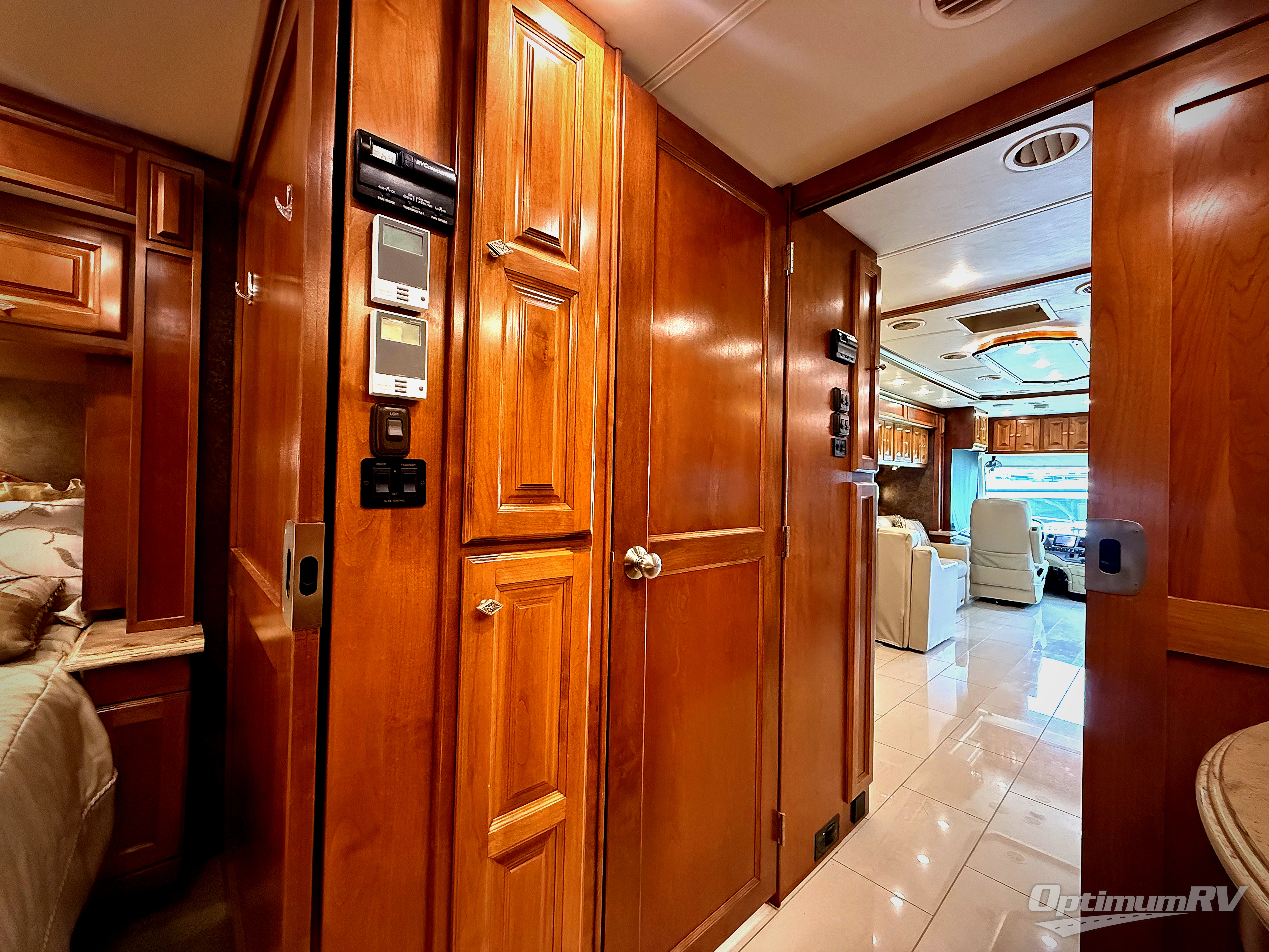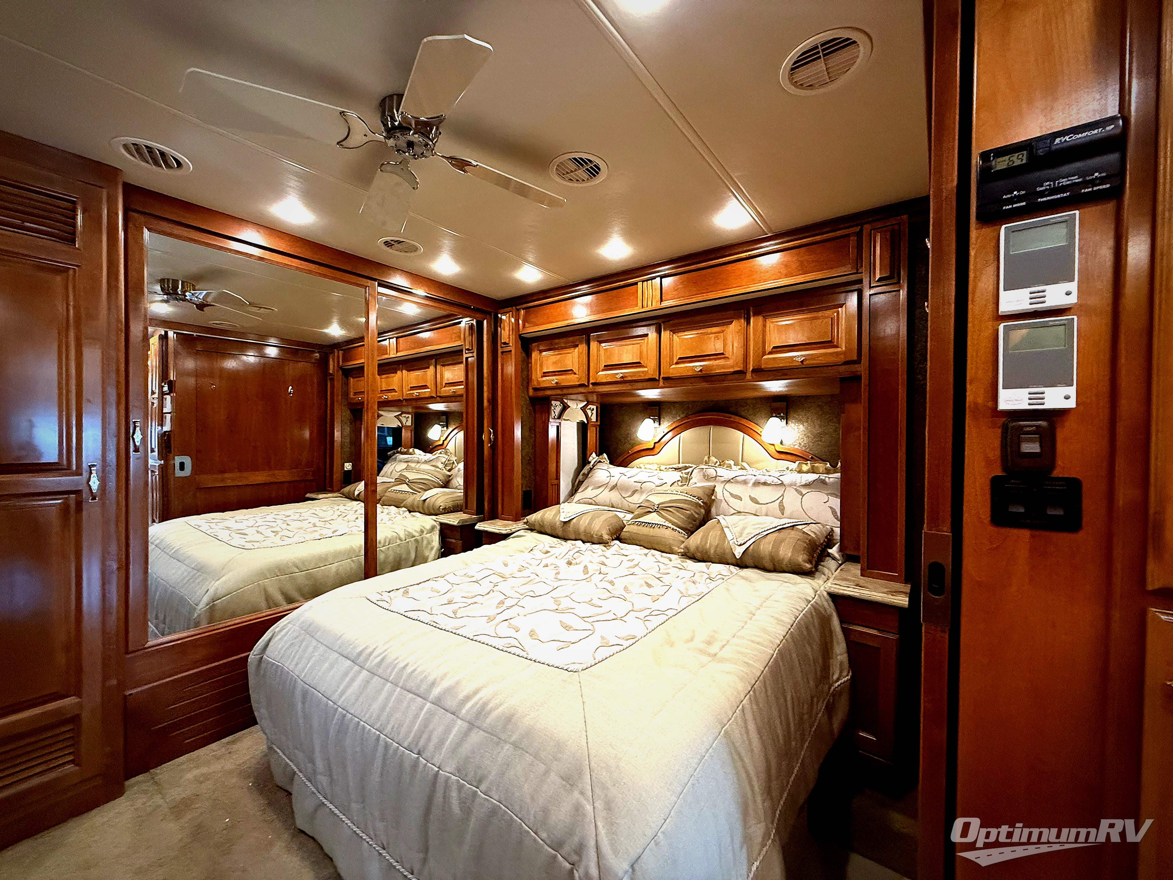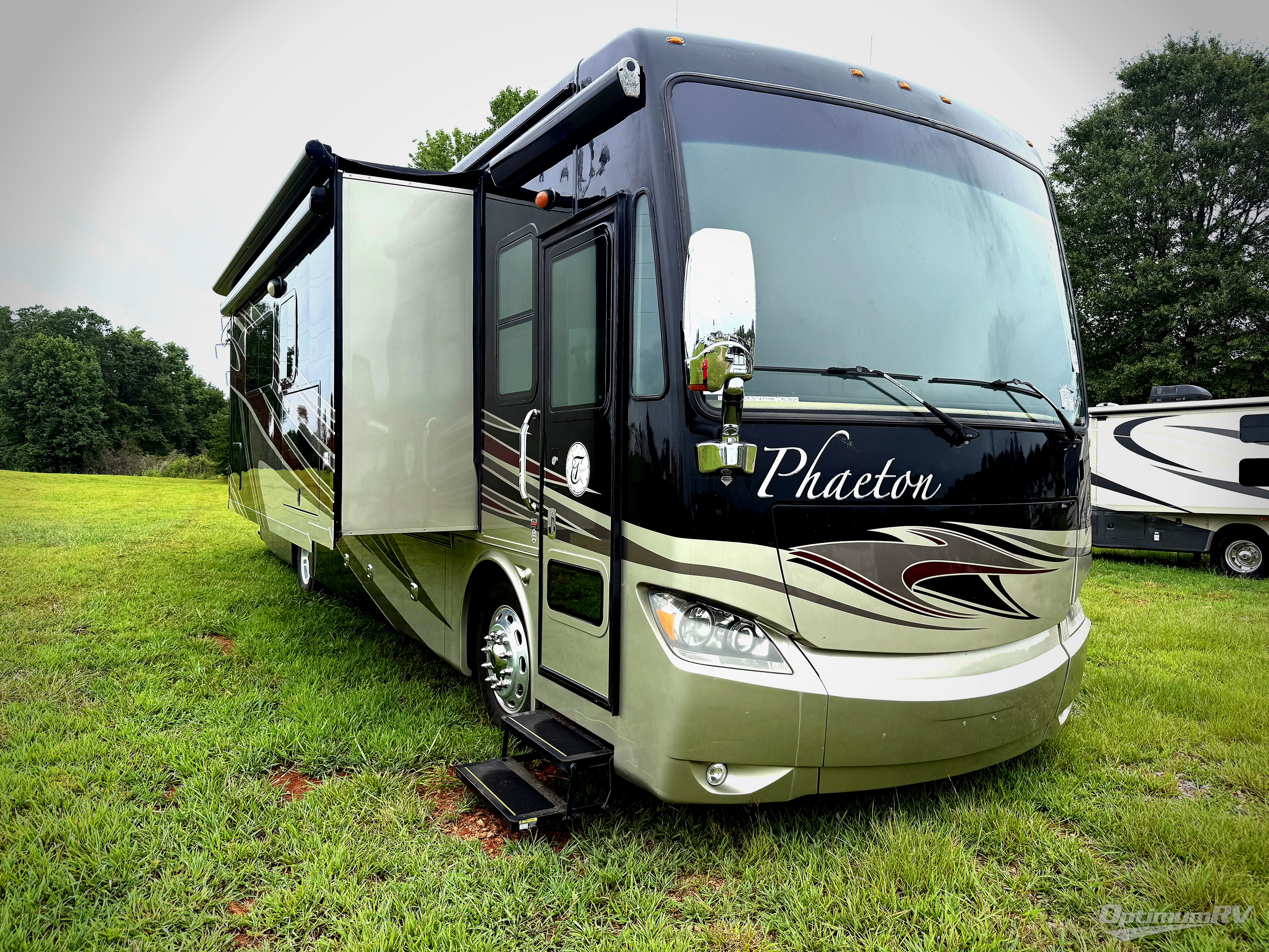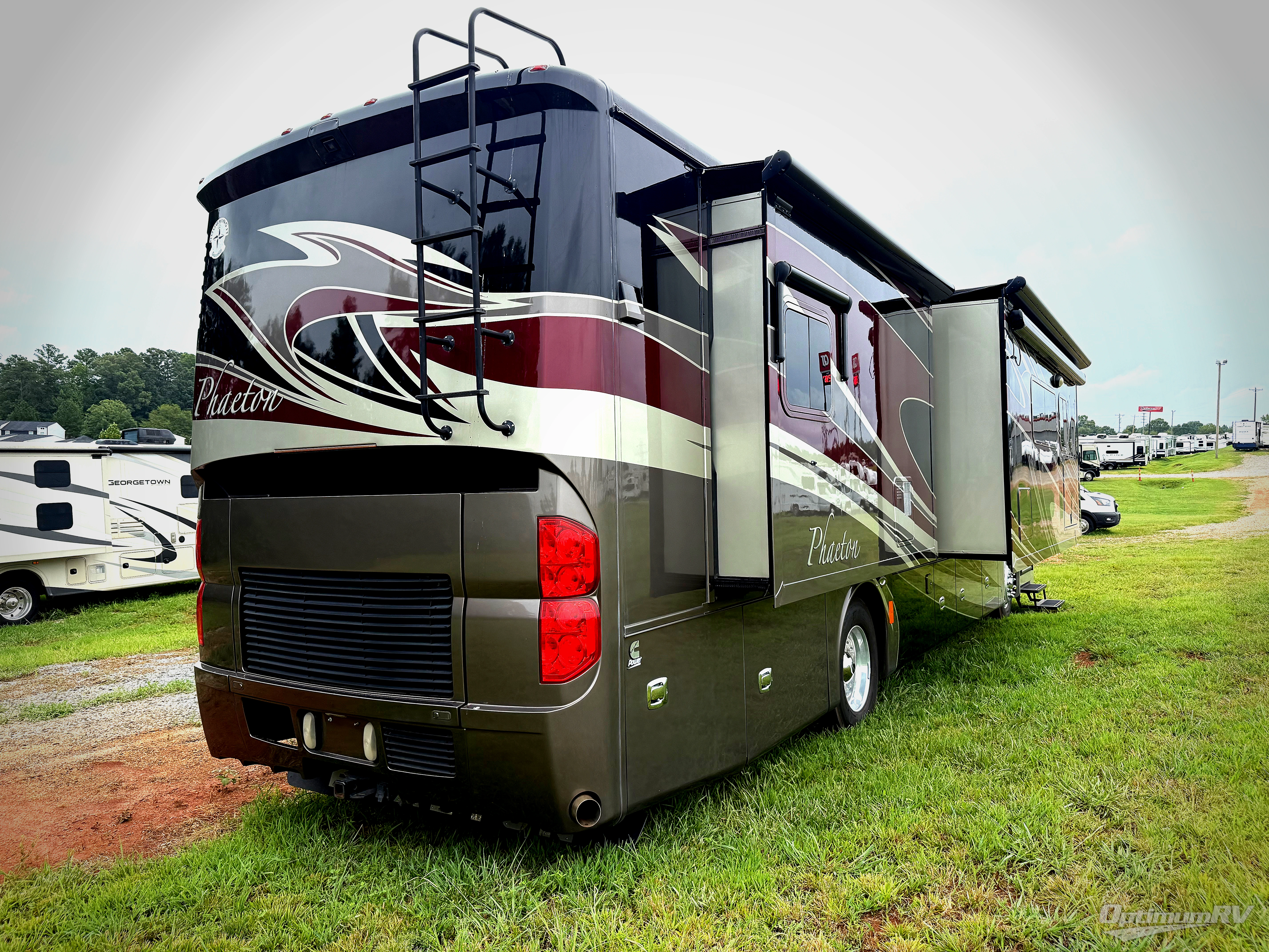 The Tiffin Phaeton 36 BH class A diesel motorhome offers a rear bedroom. The bed is within a slide out, has a nightstand at each side and has overhead cabinets above the head of the bed. The rear wall of the coach holds a large closet as well as a corner closet for an optional washer/dryer. The wall opposite the bed includes another slide housing overhead cabinets, a TV and a hamper and drawers below.
