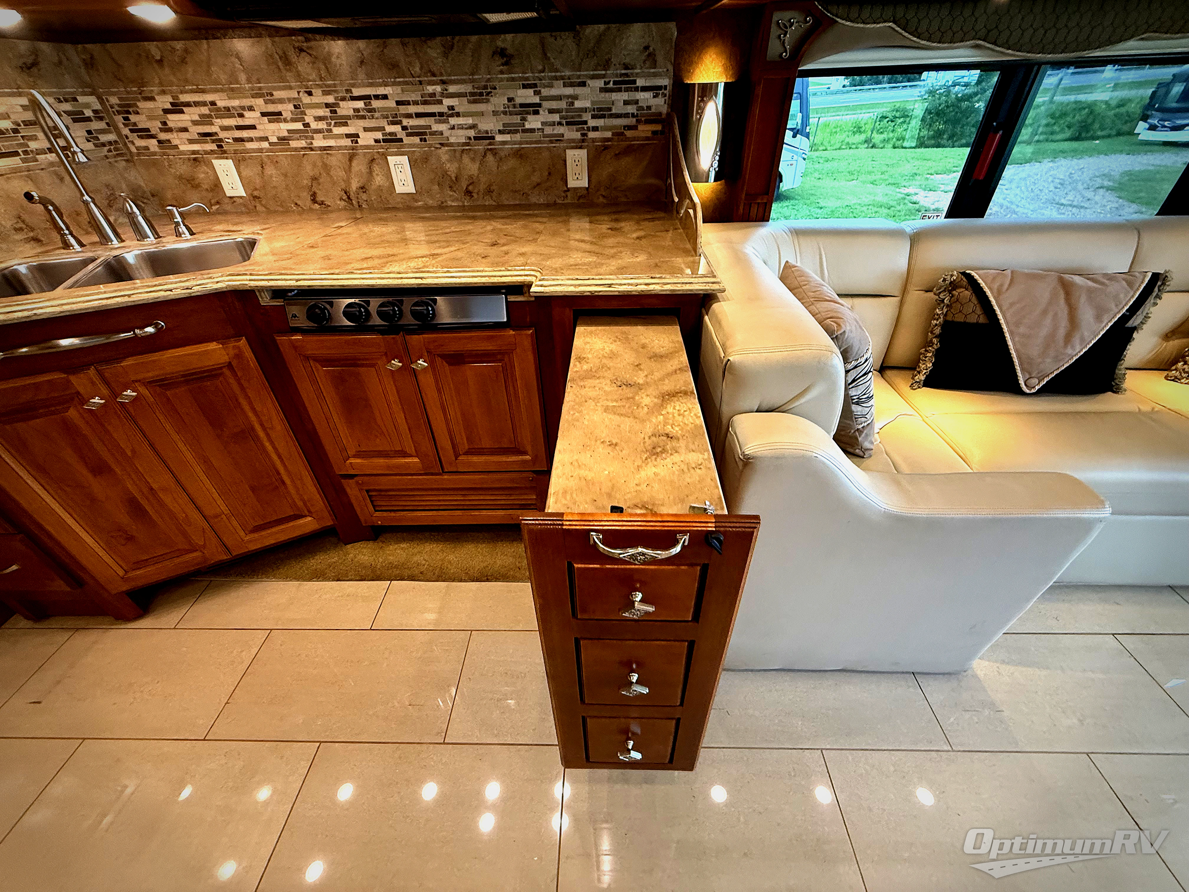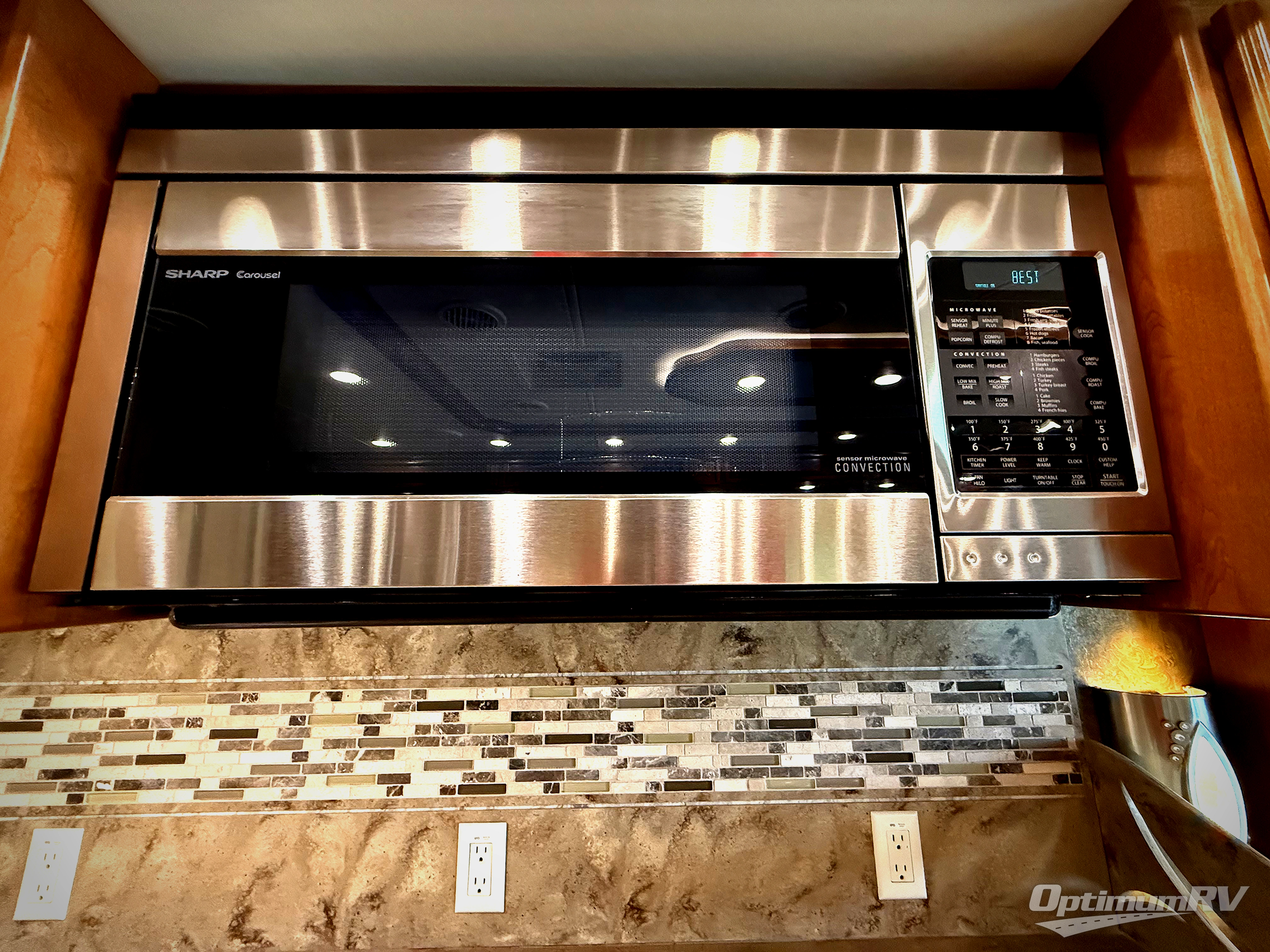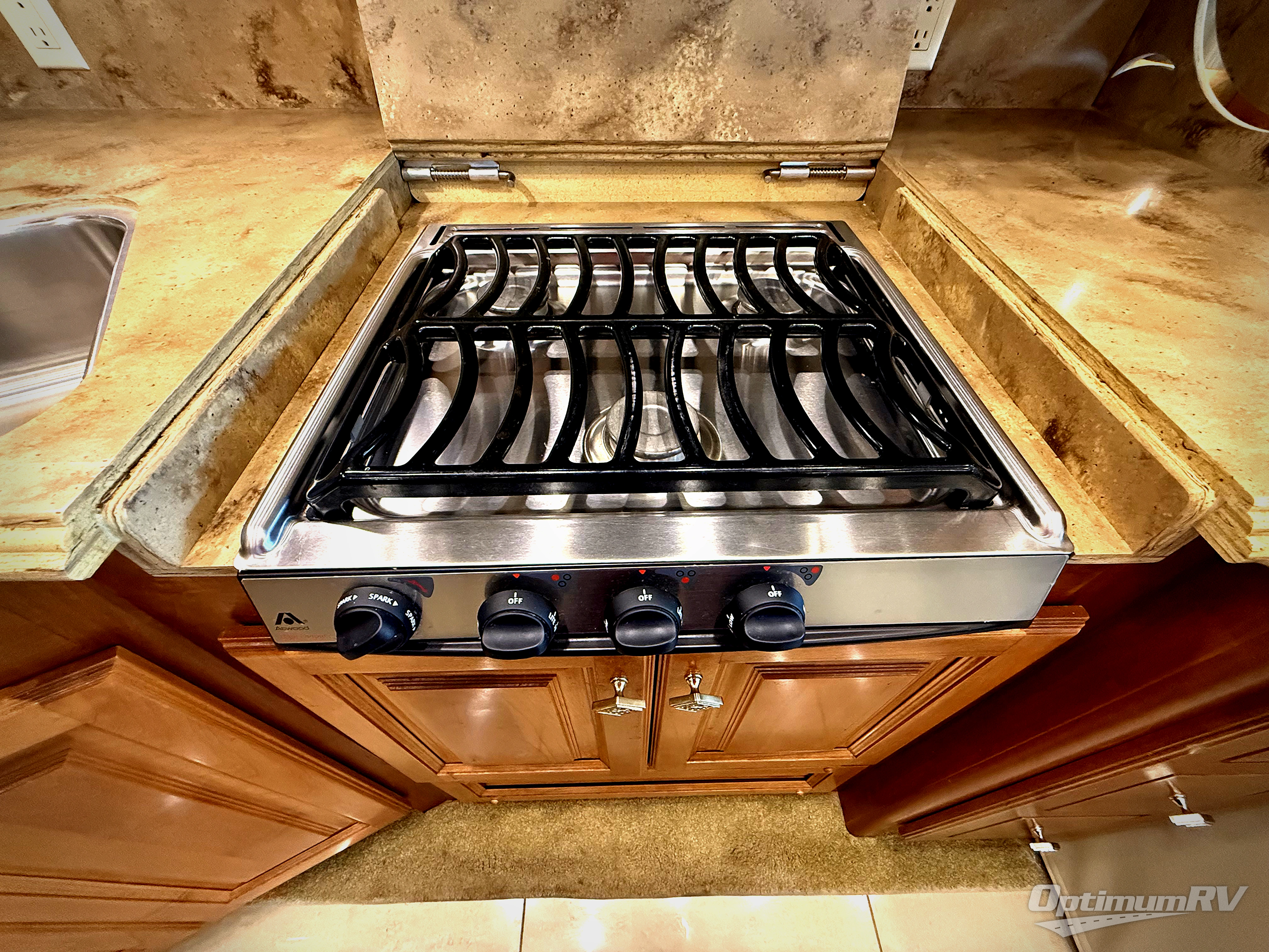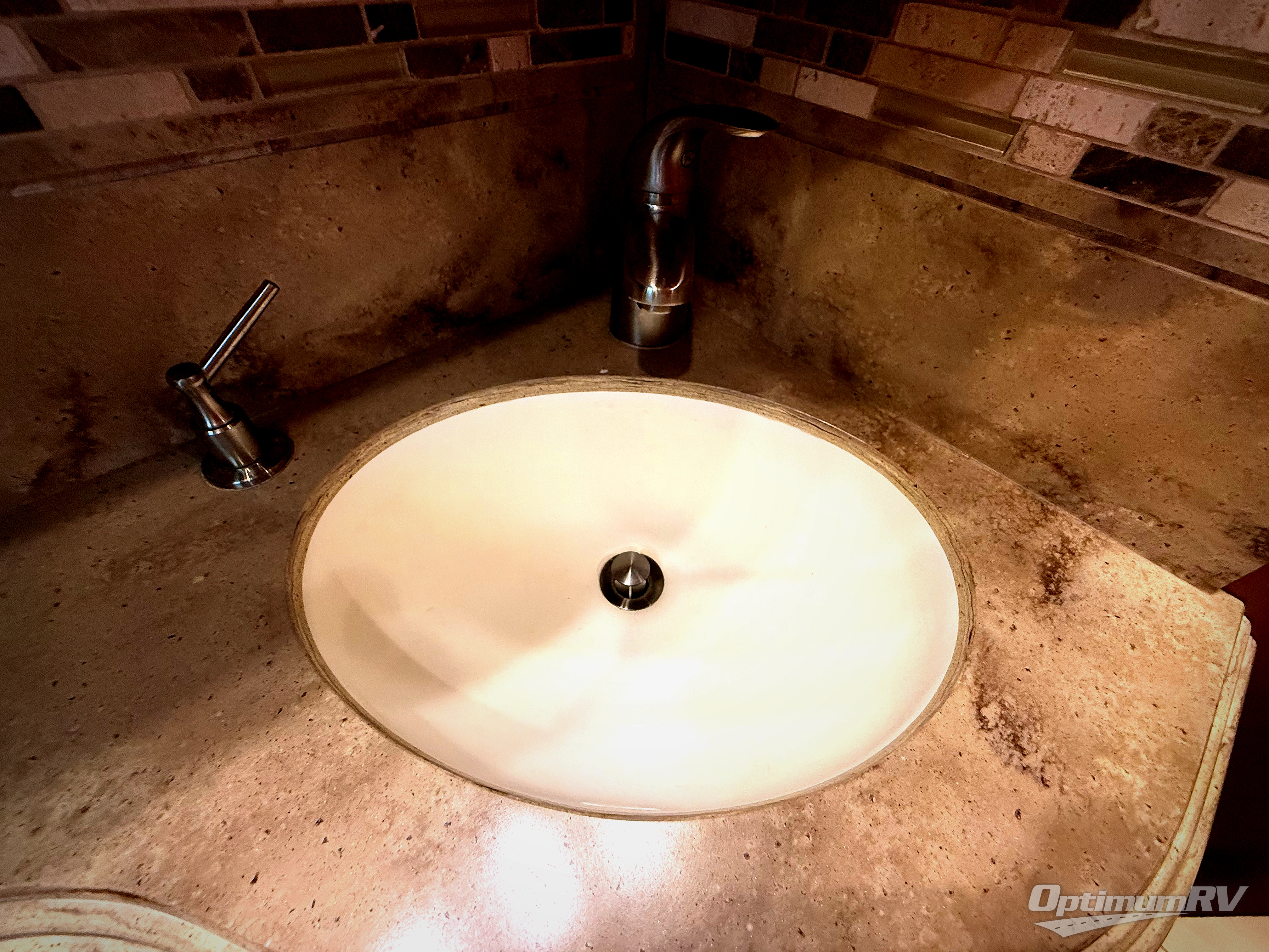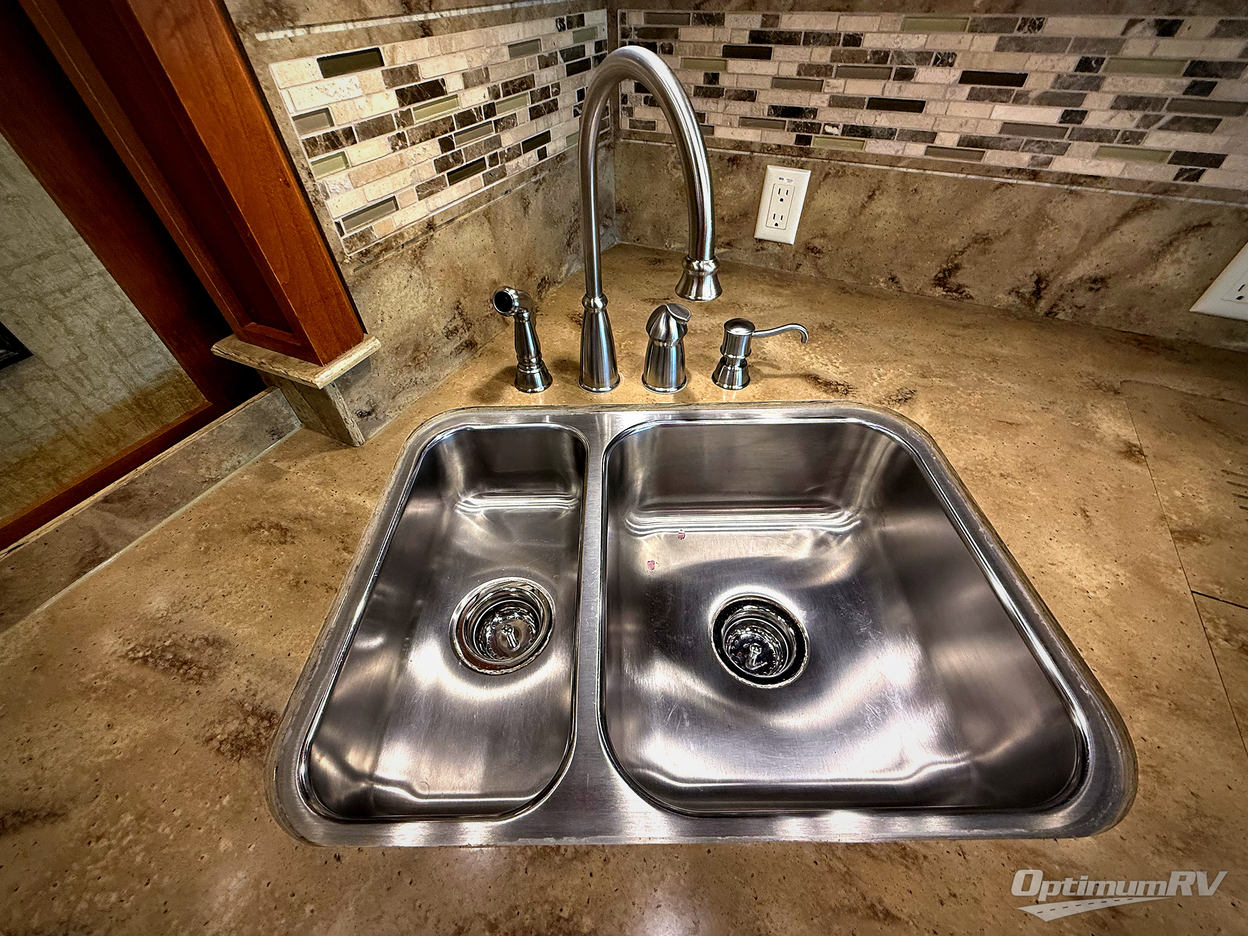 Along the road side a fourth slide out holds a chaise sofa bed with coffee table, overhead cabinets, range, overhead microwave, and angled double kitchen sink. You may choose leather lift recliners in place of the chaise sofa bed.