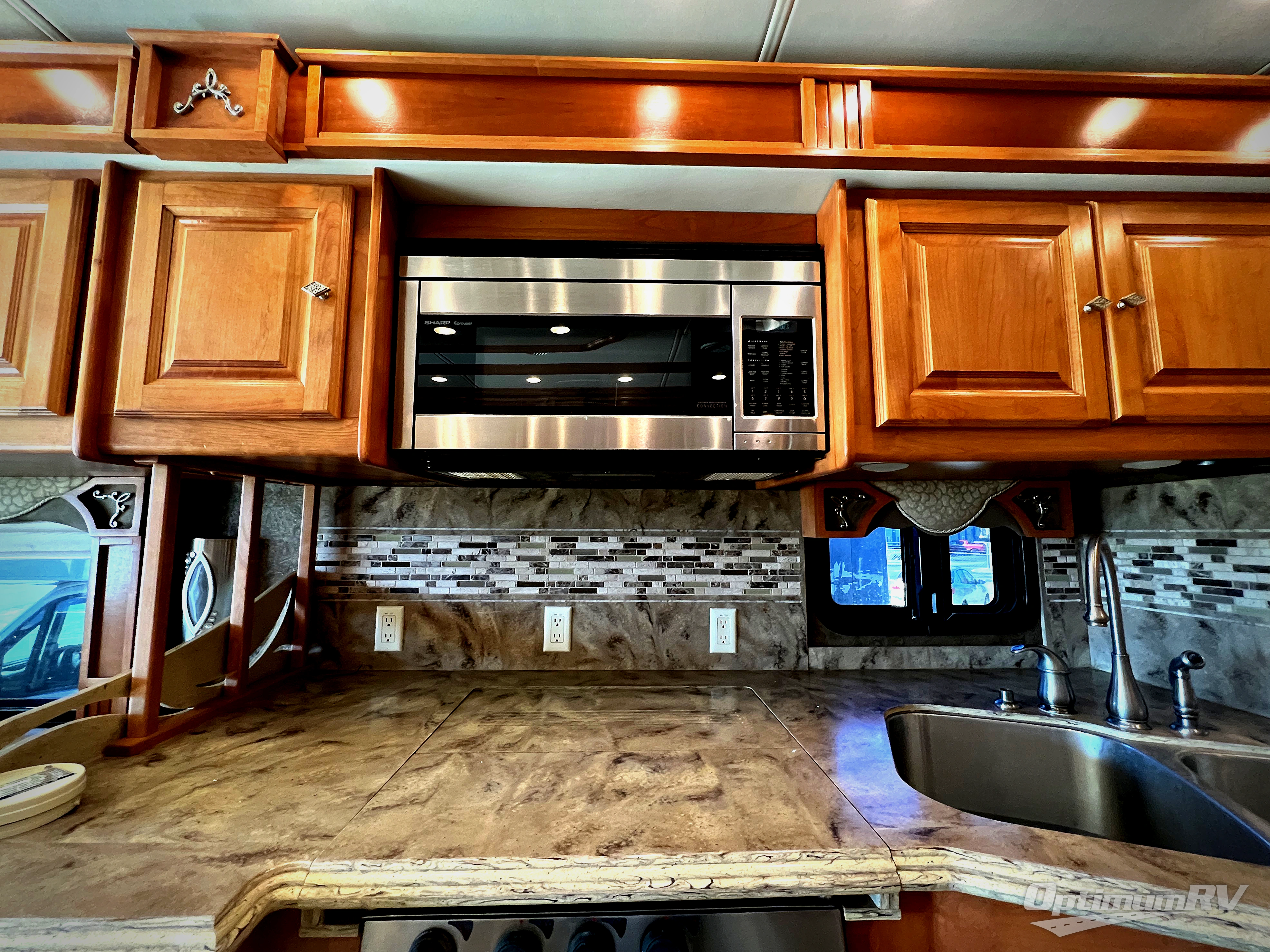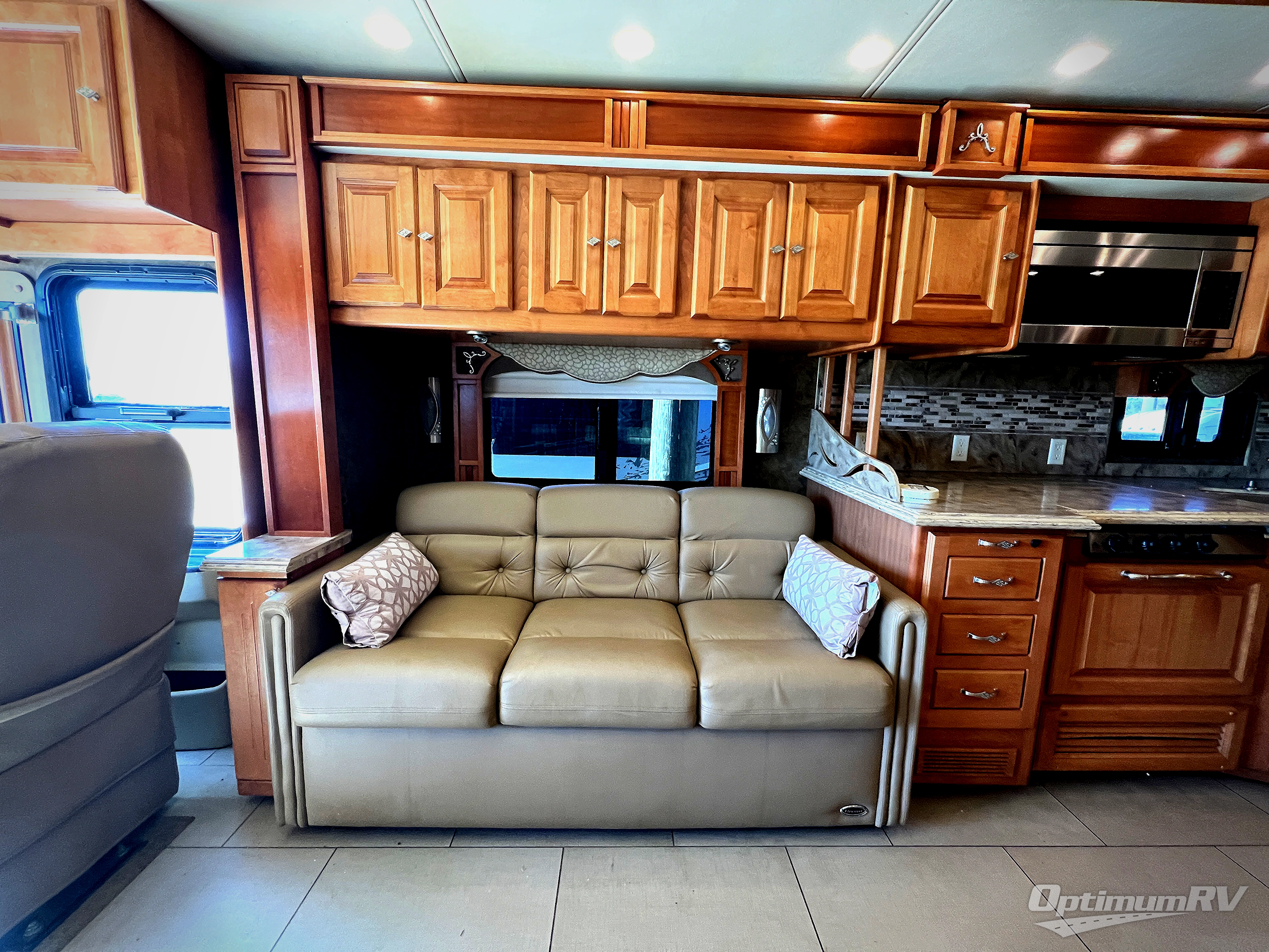 In the living area, two slides opposite each other really open up the floor space. The curb side slide holds an angled double kitchen sink, a range, an overhead convection microwave, overhead cabinets and a sofa bed. You may choose two leather lift recliners in place of the sofa bed or an exterior TV.