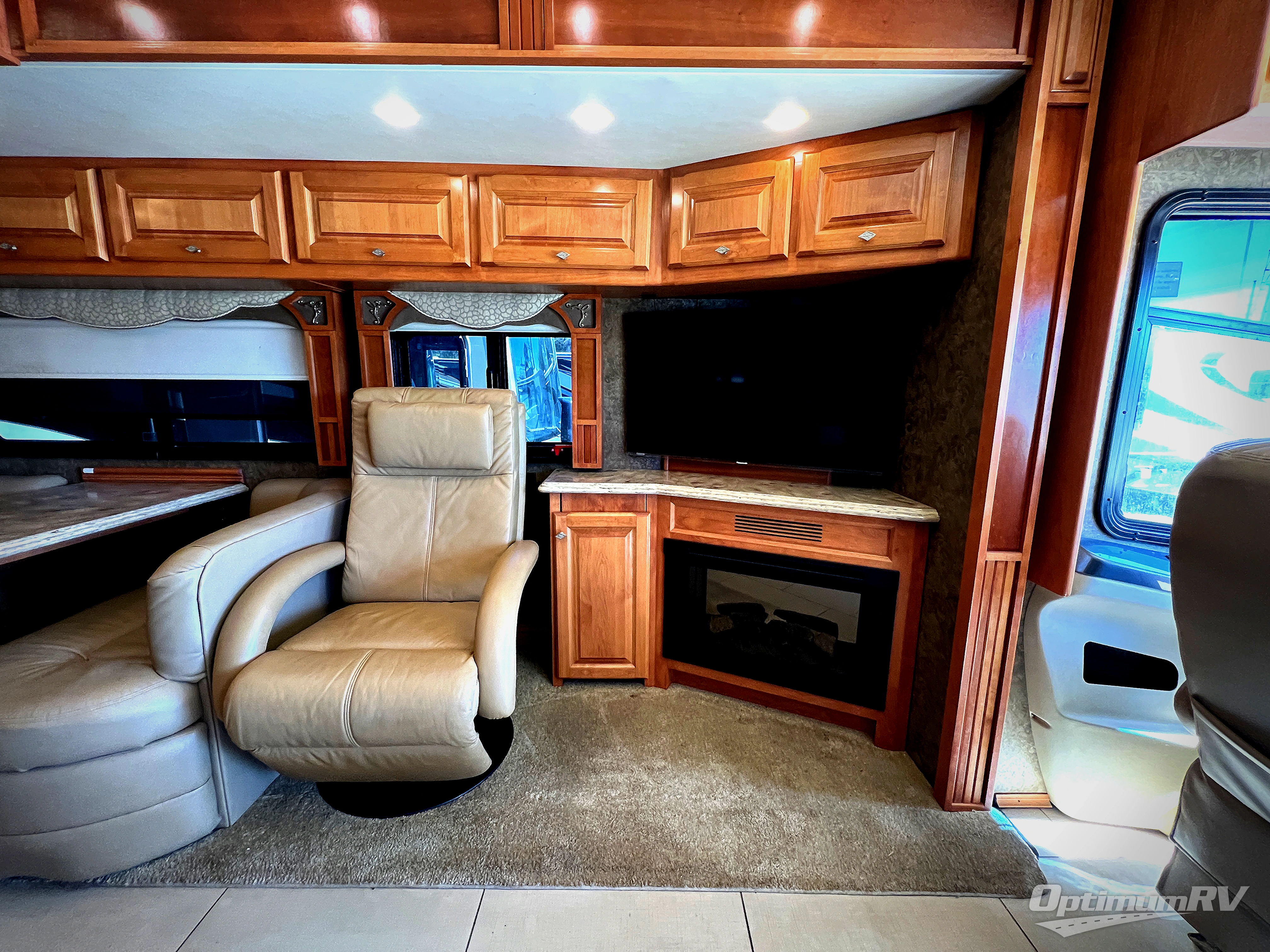 The road side slide out holds a sofa bed, booth dinette, overhead cabinets and a residential refrigerator. You may choose a u-shaped dinette, a dinette with computer workstation and/or an entertainment center with on leather lift recliner and flip table.