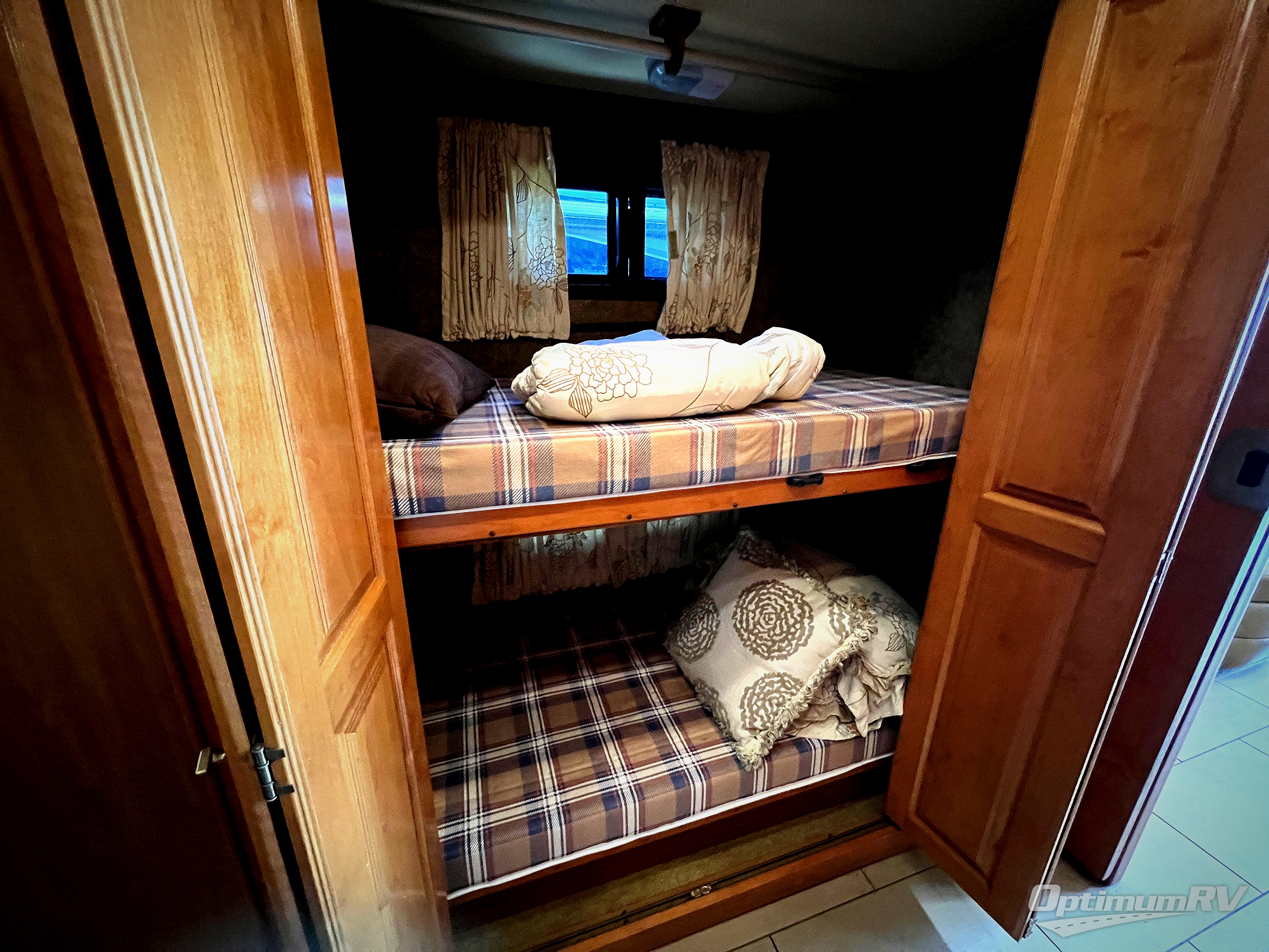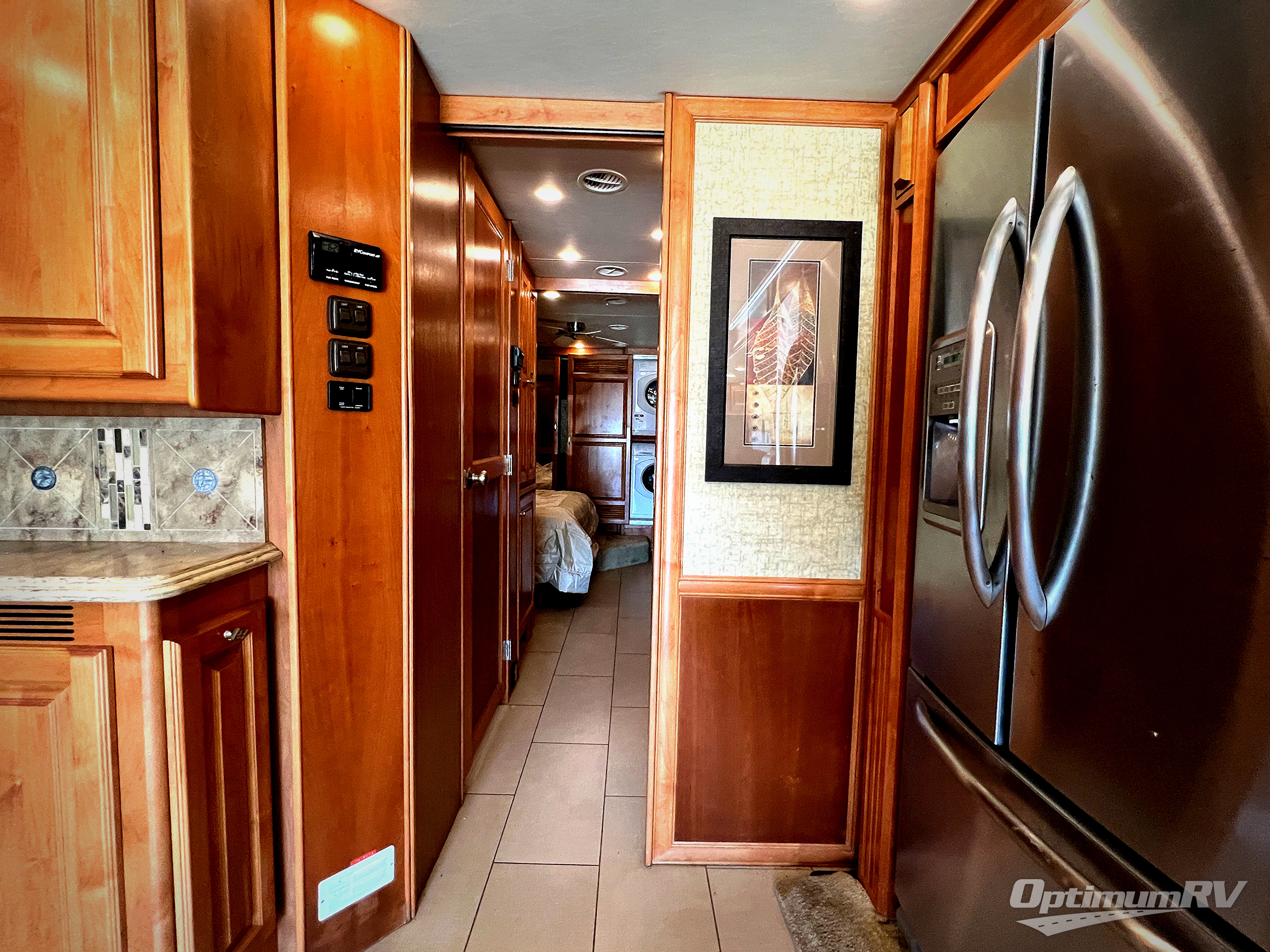 A rear master bedroom includes a queen size bed within a slide, nightstands at each side and overhead cabinets above. You may choose a king size bed for this room. The rear wall holds a closet and a corner closet for an optional washer/dyer. The wall opposite the bed includes a second bedroom slide out with an overhead TV, overhead cabinets and drawers below.