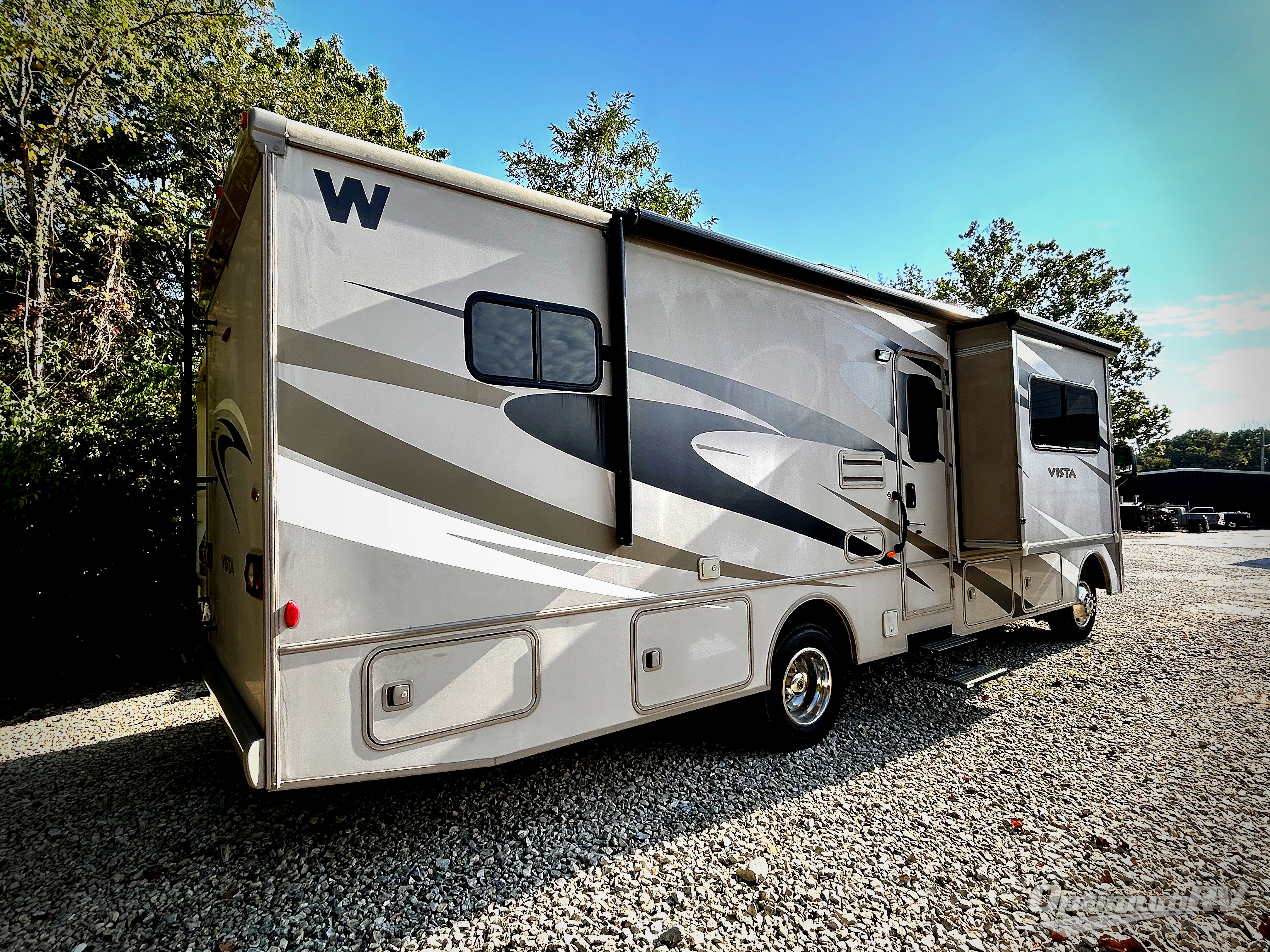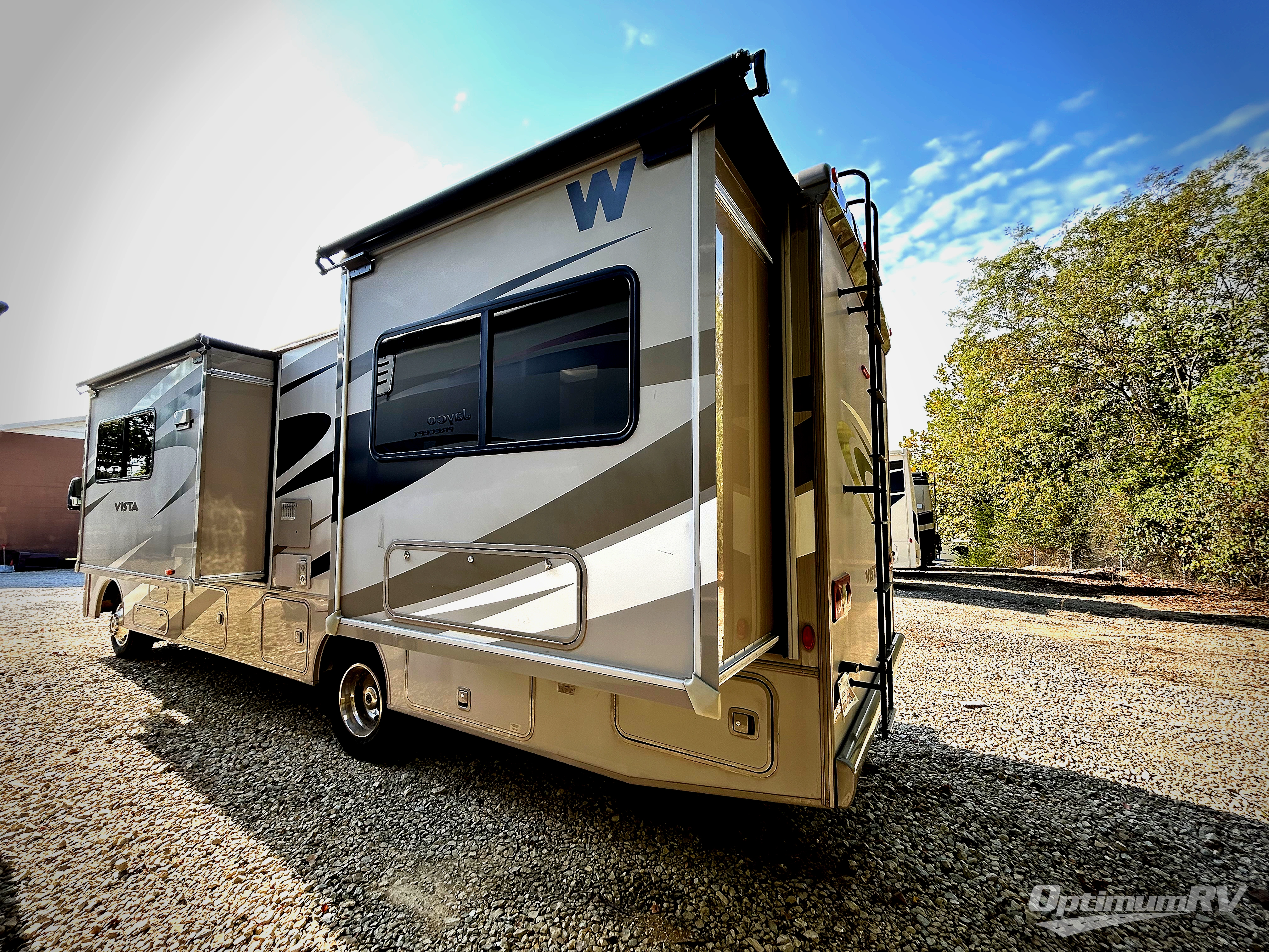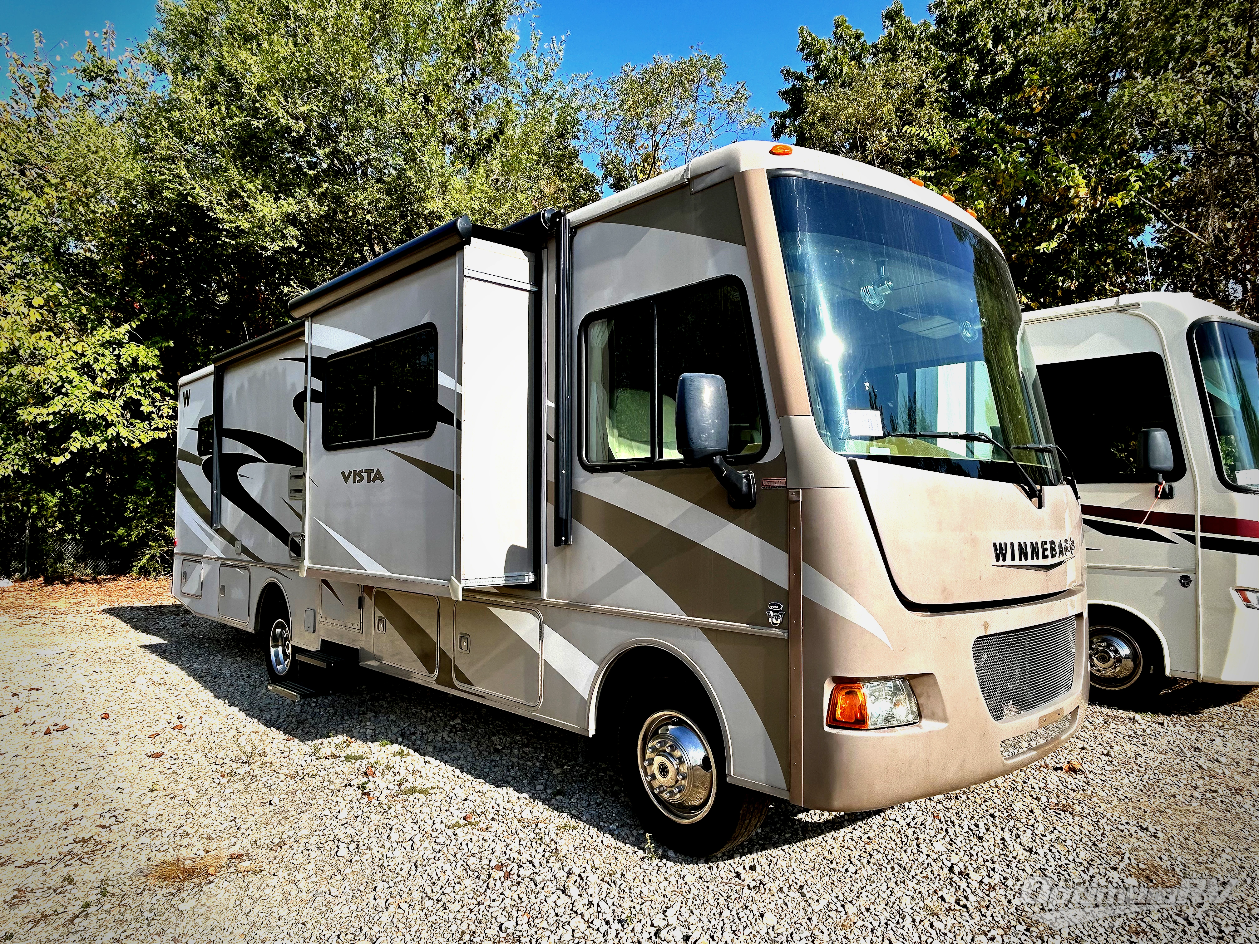 Winnebago Vista Class A Coach w/Rear Queen Bed Slideout w/Nightstands, Wardrobe/Chest of Drawers/Wardrobe, Folding Door to Hall w/Shower, Pantry, Refrigerator, Private Toilet & Sink Area, Dbl. Kitchen Sink, Overhead Cabinets, 3 Burner Range & Booth Dinette Slideout w/Overhead Storage Above Dinette, Sofa Bed Slide and Much More! Available Options May Include: Bedroom TV, Comfort Sofa Sleeper 60" x 78", Dining Table & Chairs w/Buffet IPO Booth Dinette or BenchMark Dinette.