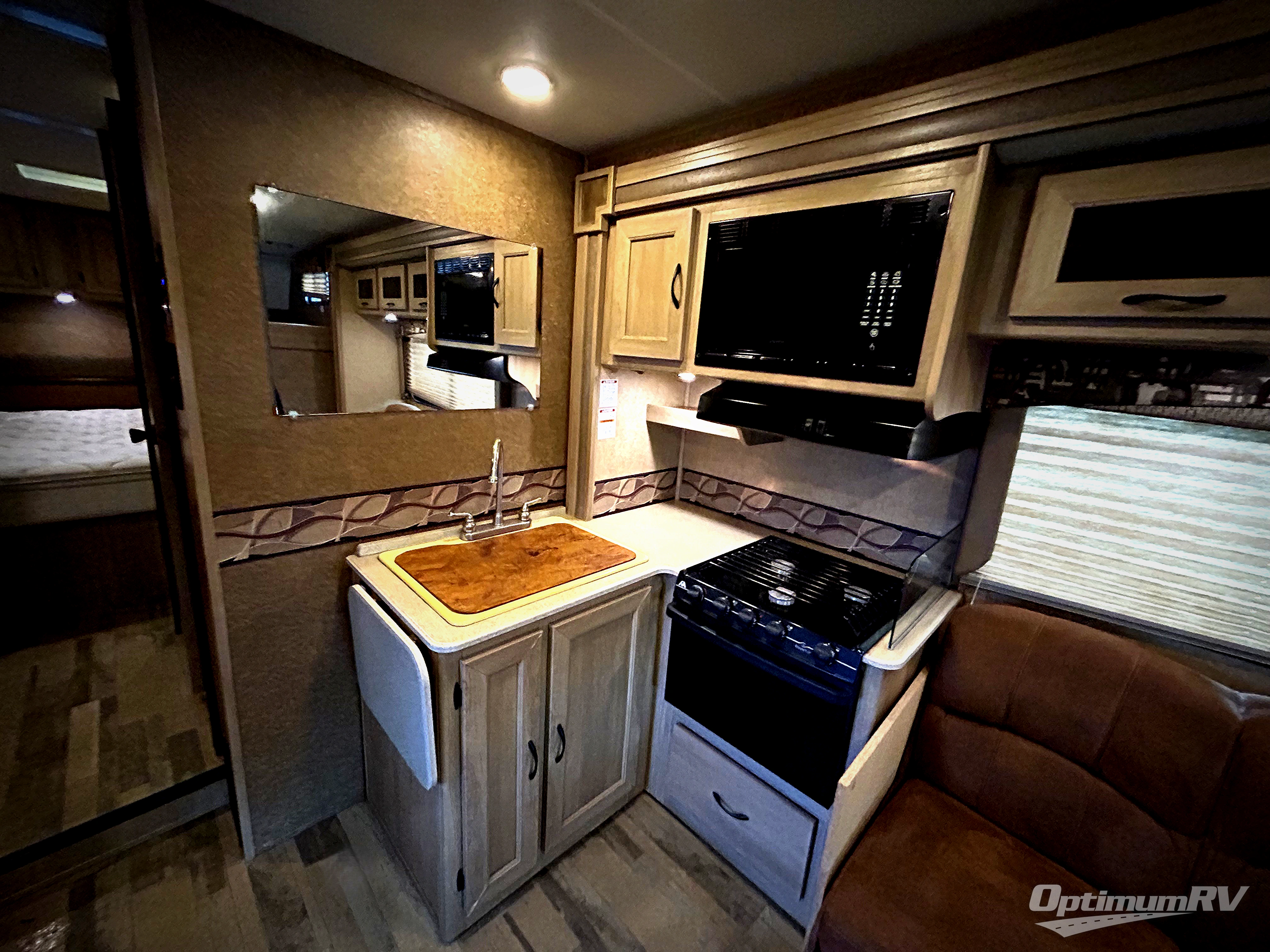 Step inside and find a spacious interior with a single slide out straight ahead. The slide features a double kitchen sink with counter top extension, a three burner range with overhead cabinets, and it also features a sofa with storage above.