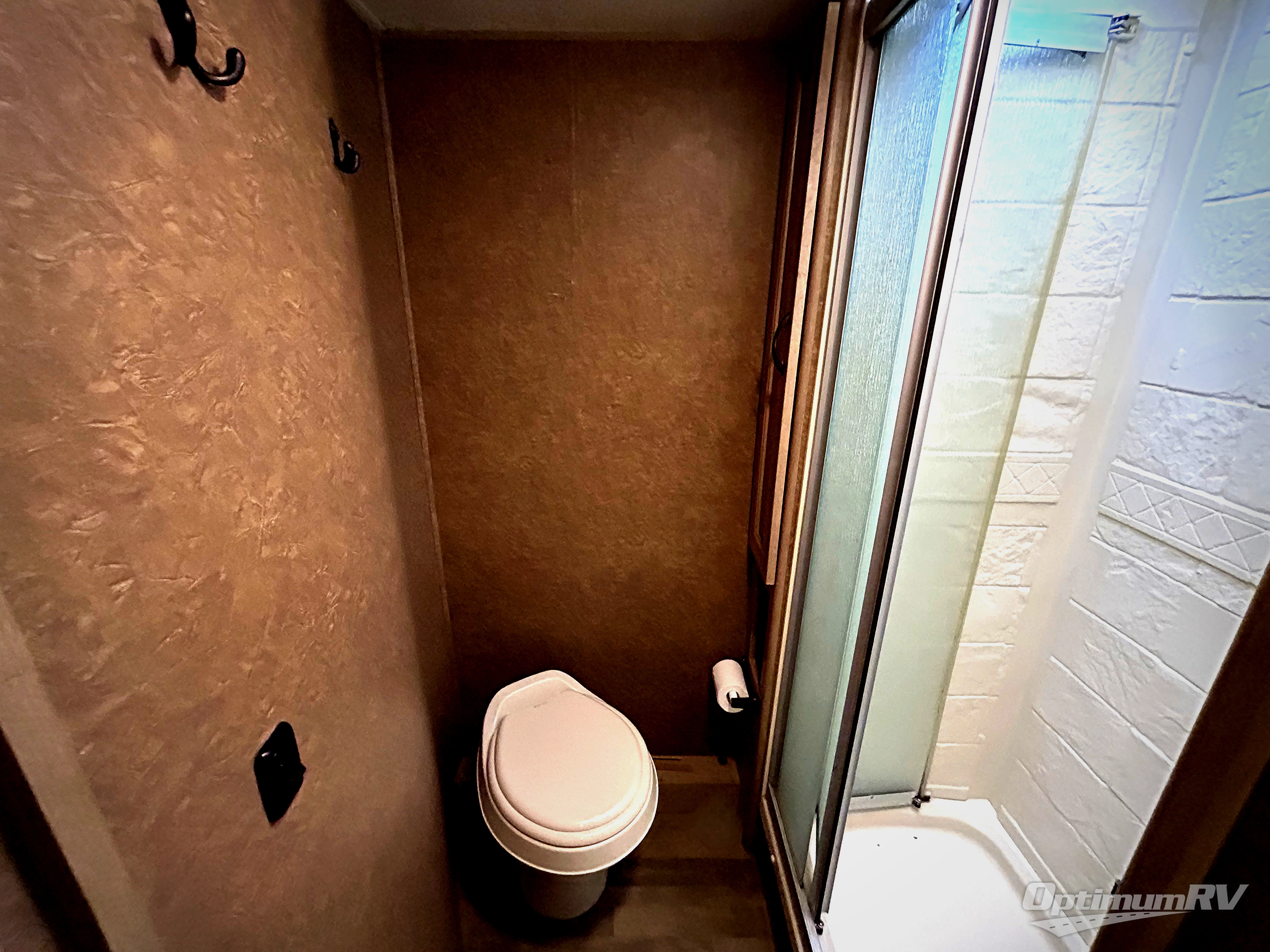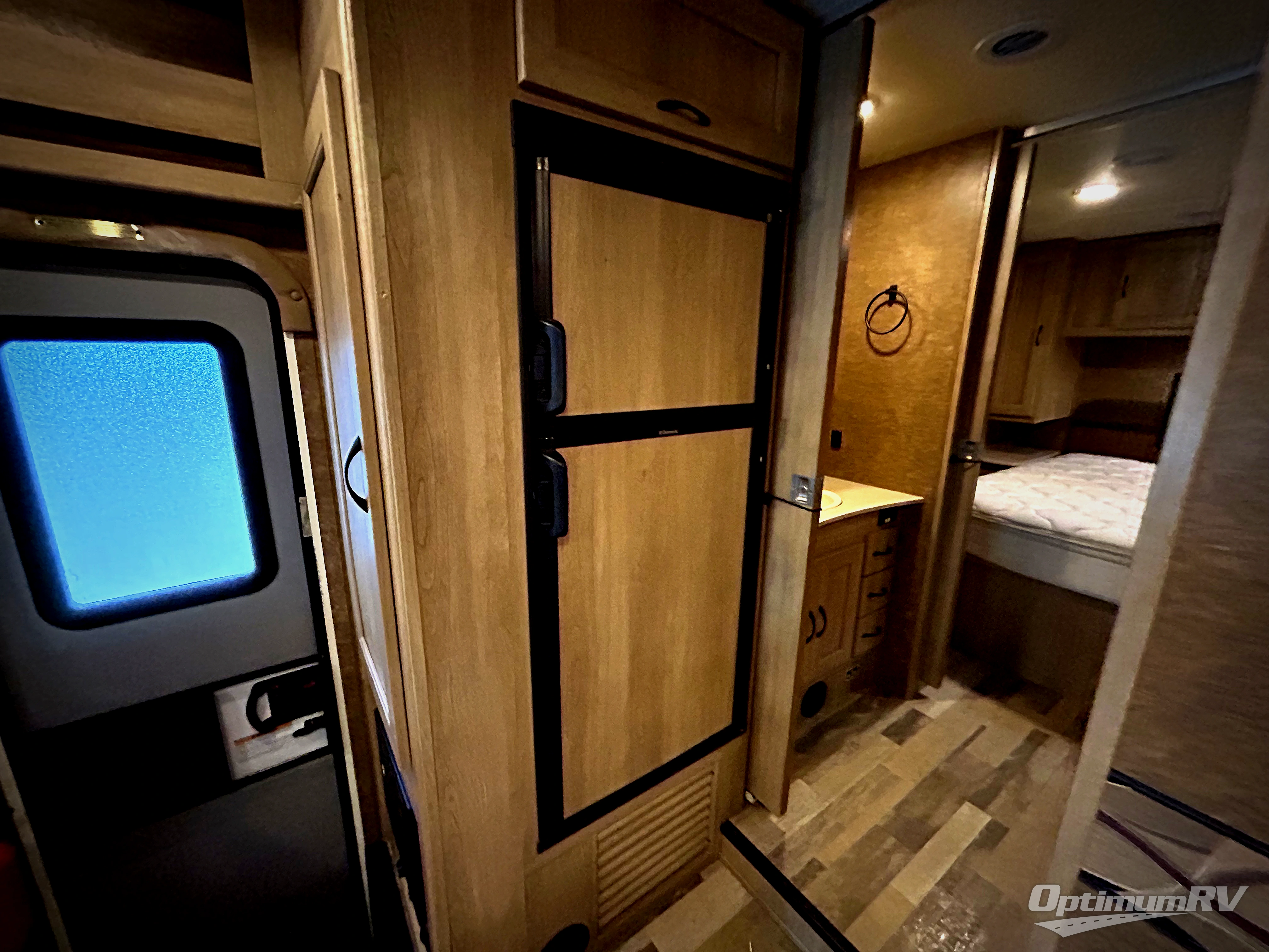 There is a booth dinette to your immediate right of the entry door that features an overhead cabinet and DVD player. To the left of the door you will find a convenient pantry and refrigerator.