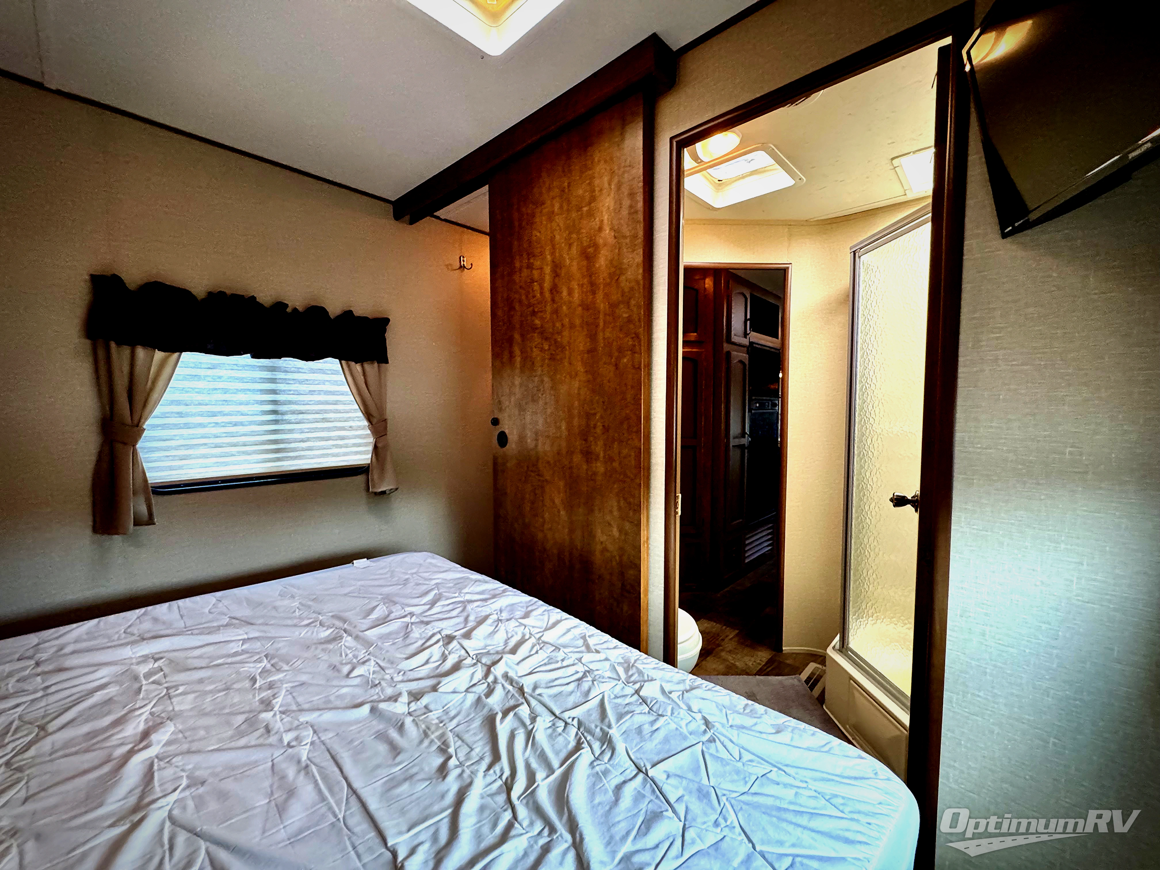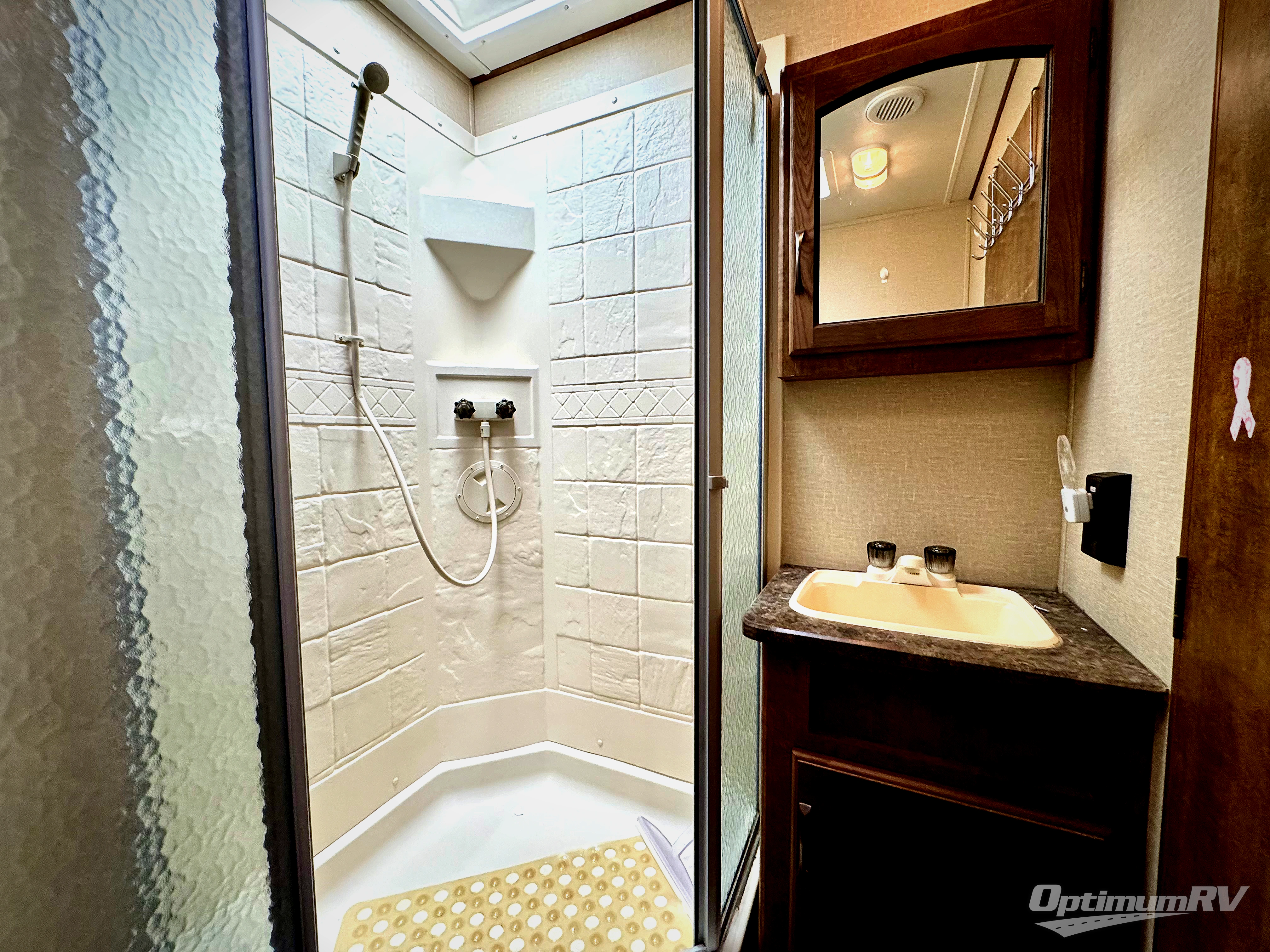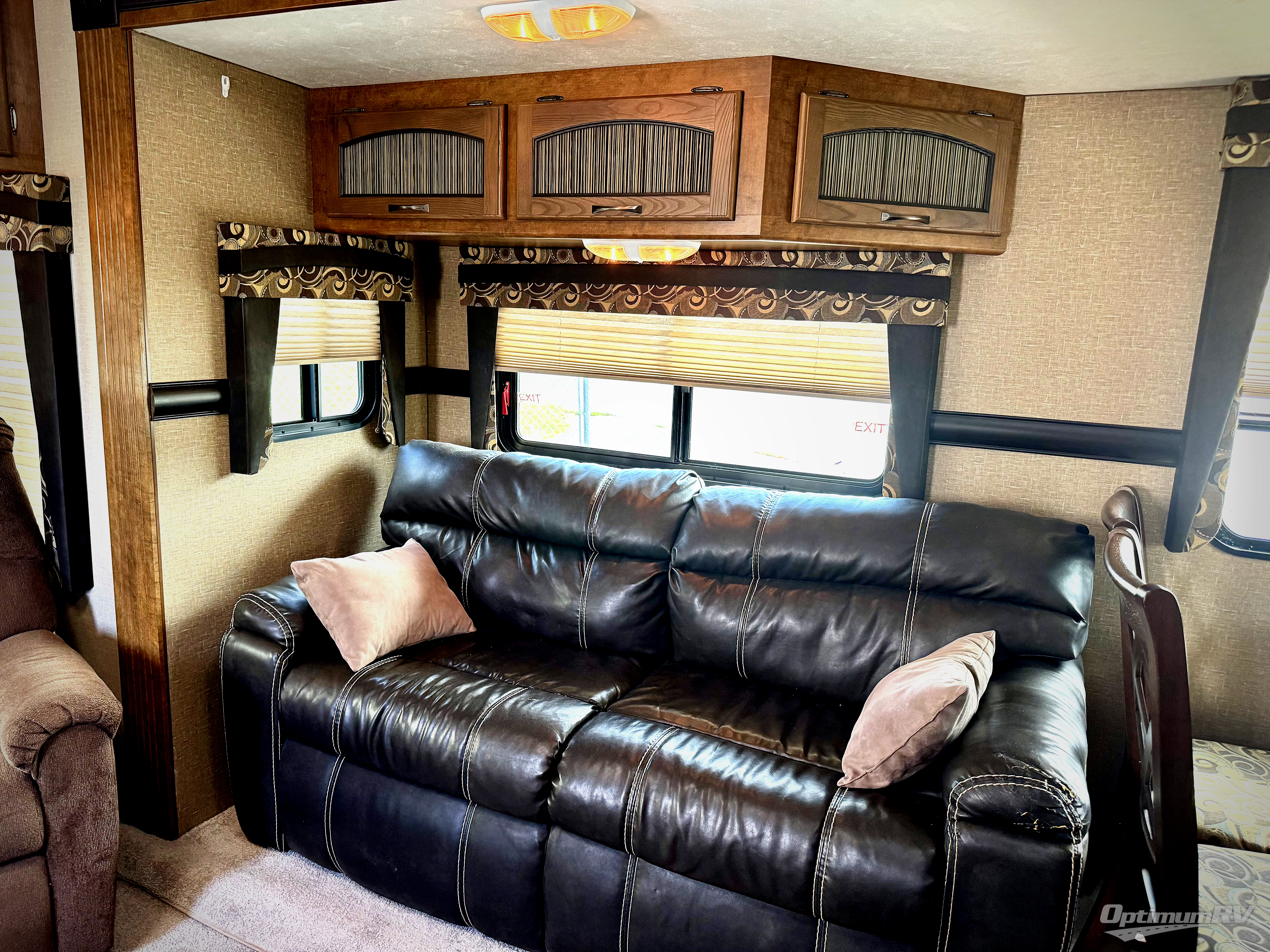 As you enter the travel trailer, along the rear wall you will notice two swivel rockers. The slide has a sofa and super booth dinette. In the corner you will find an entertainment center. On the opposite side of the travel trailer there is a double kitchen sink, range, microwave, refrigerator, pantry, and corner linen cabinet.