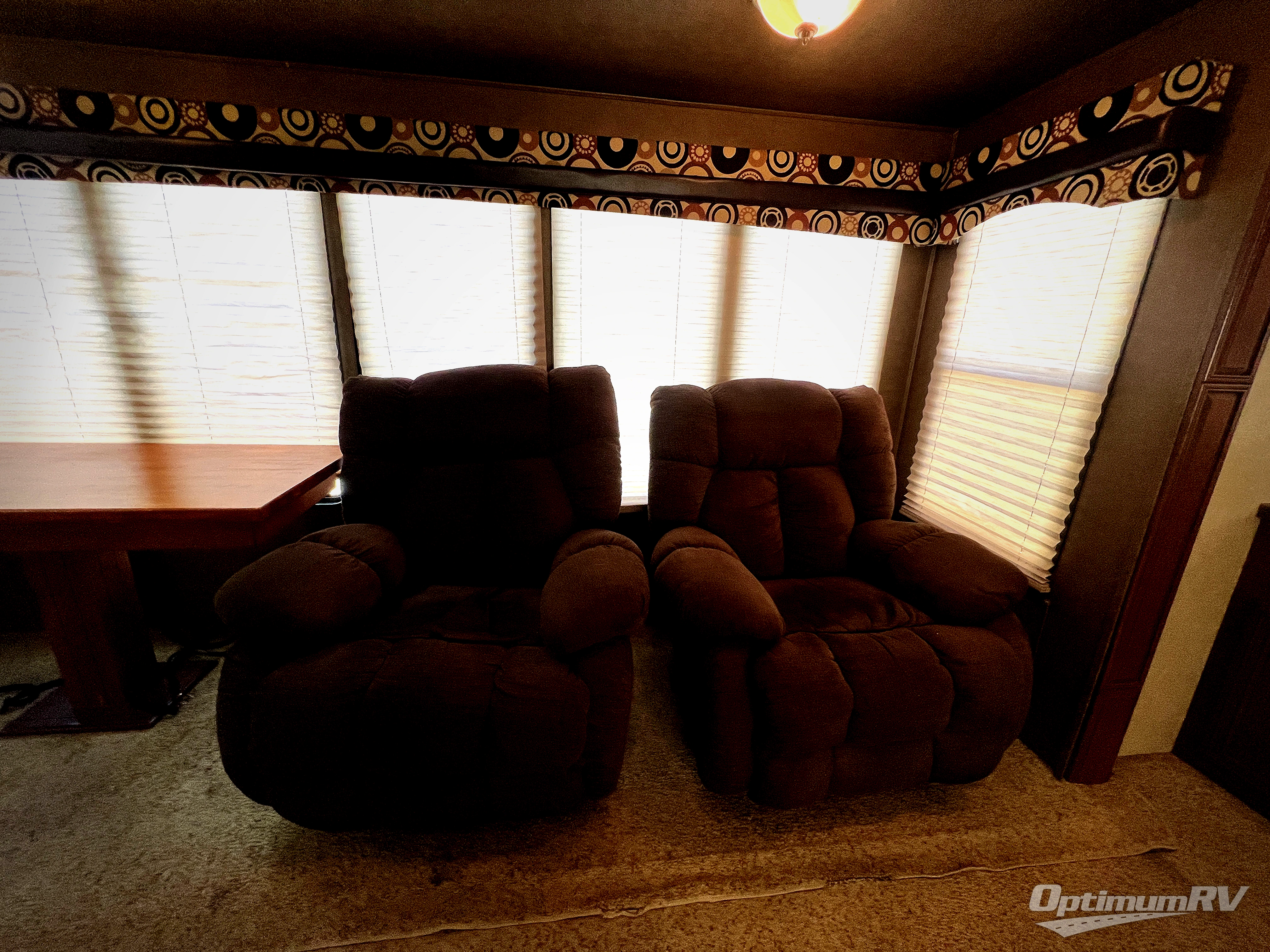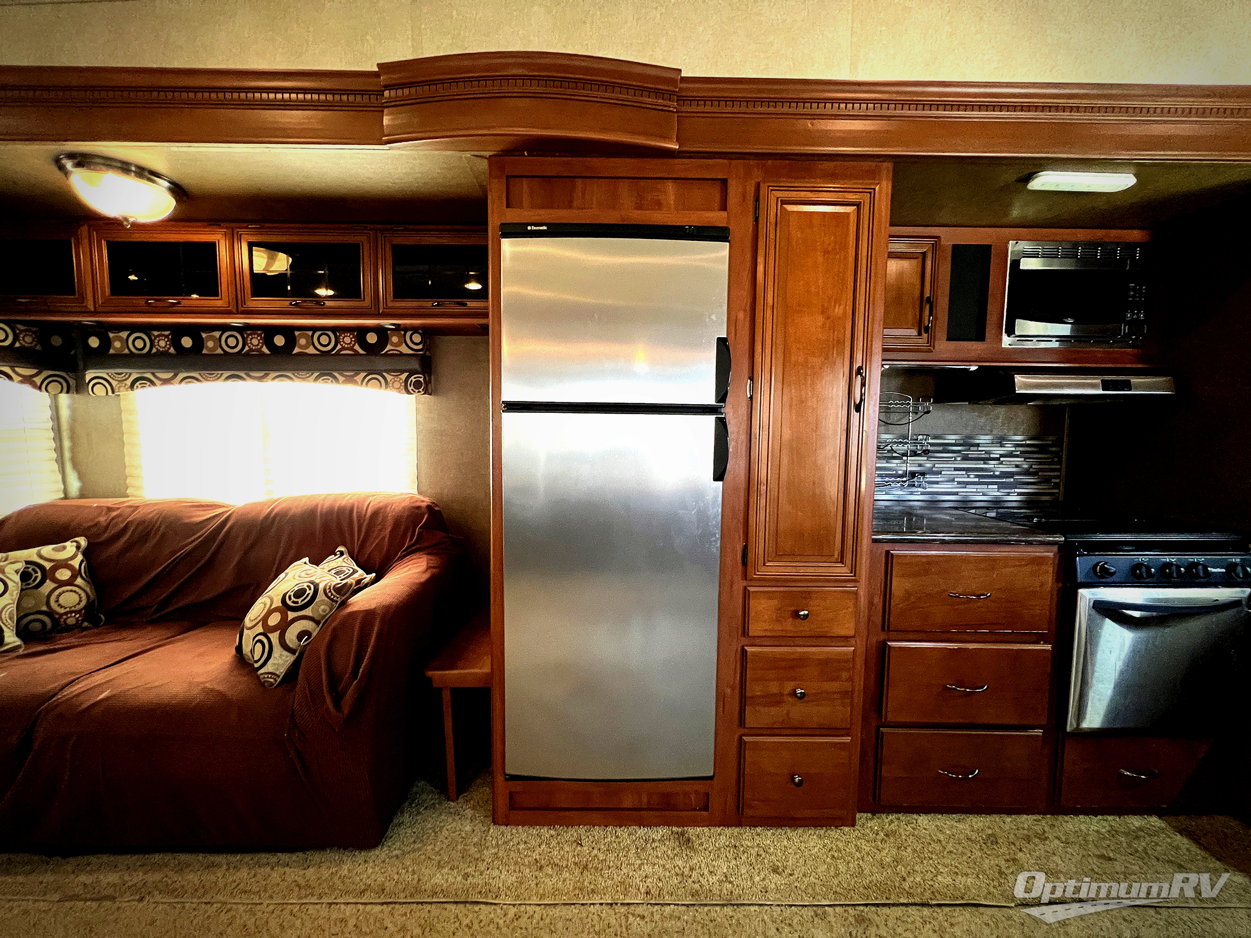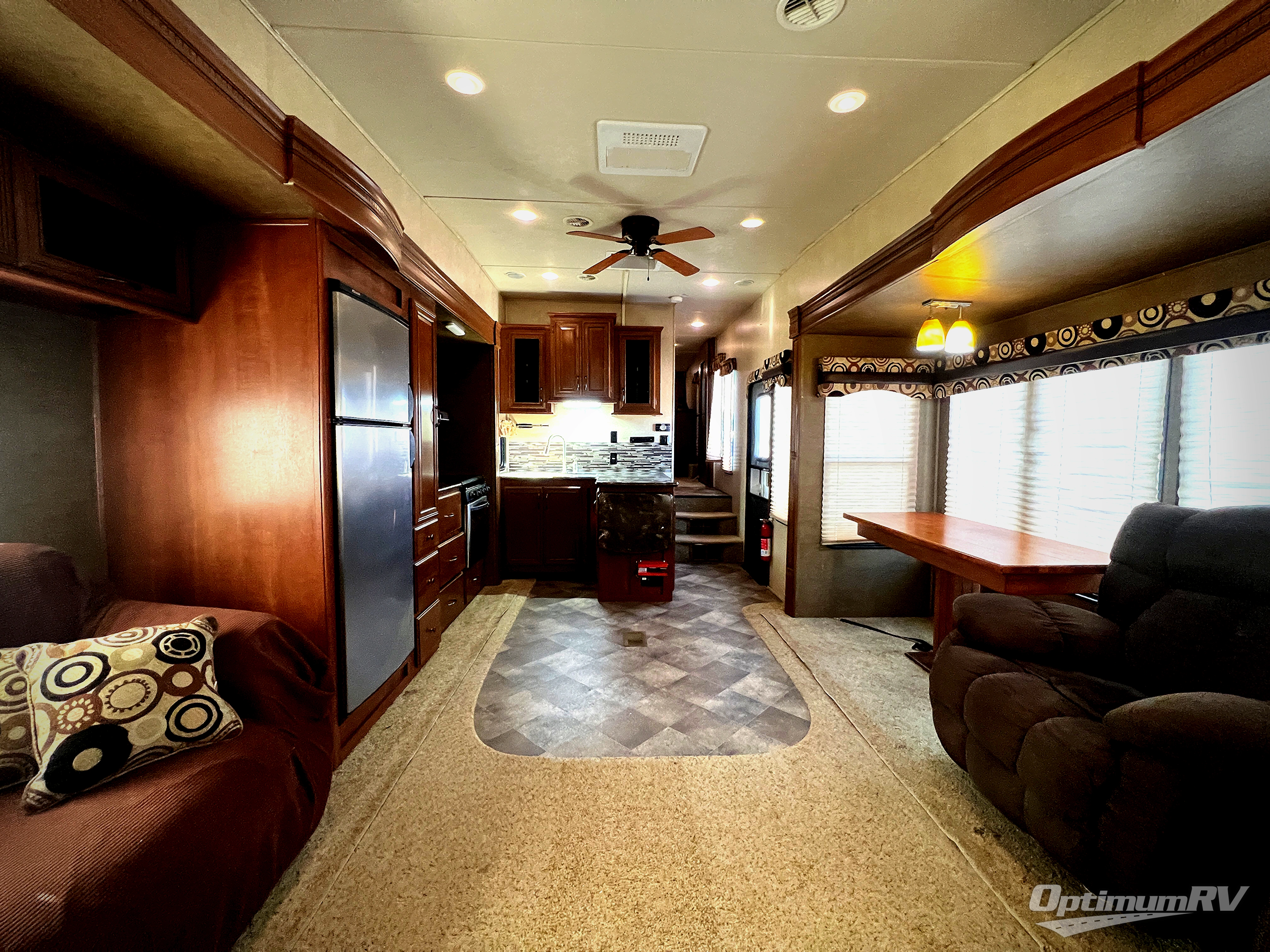 As you enter the fifth wheel to the left is a slide with a free-standing dinette and two lounge chairs. Along the rear wall is an entertainment center with a fireplace below the entertainment center and cabinets on either side. The other slide has a tri-fold hide-a-bed sofa, refrigerator, pantry, three burner range, and microwave. Along the front wall in the kitchen you will find the double kitchen sink and a l-shaped counter.