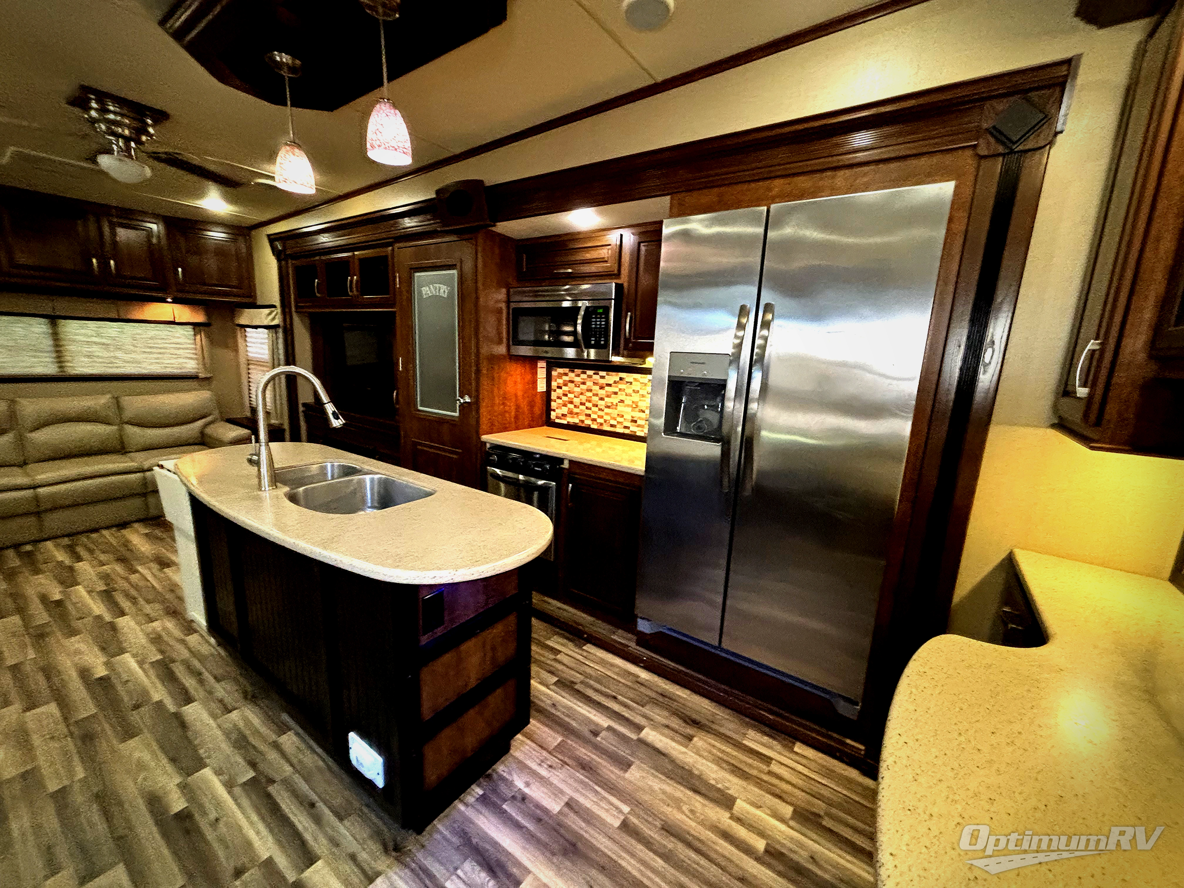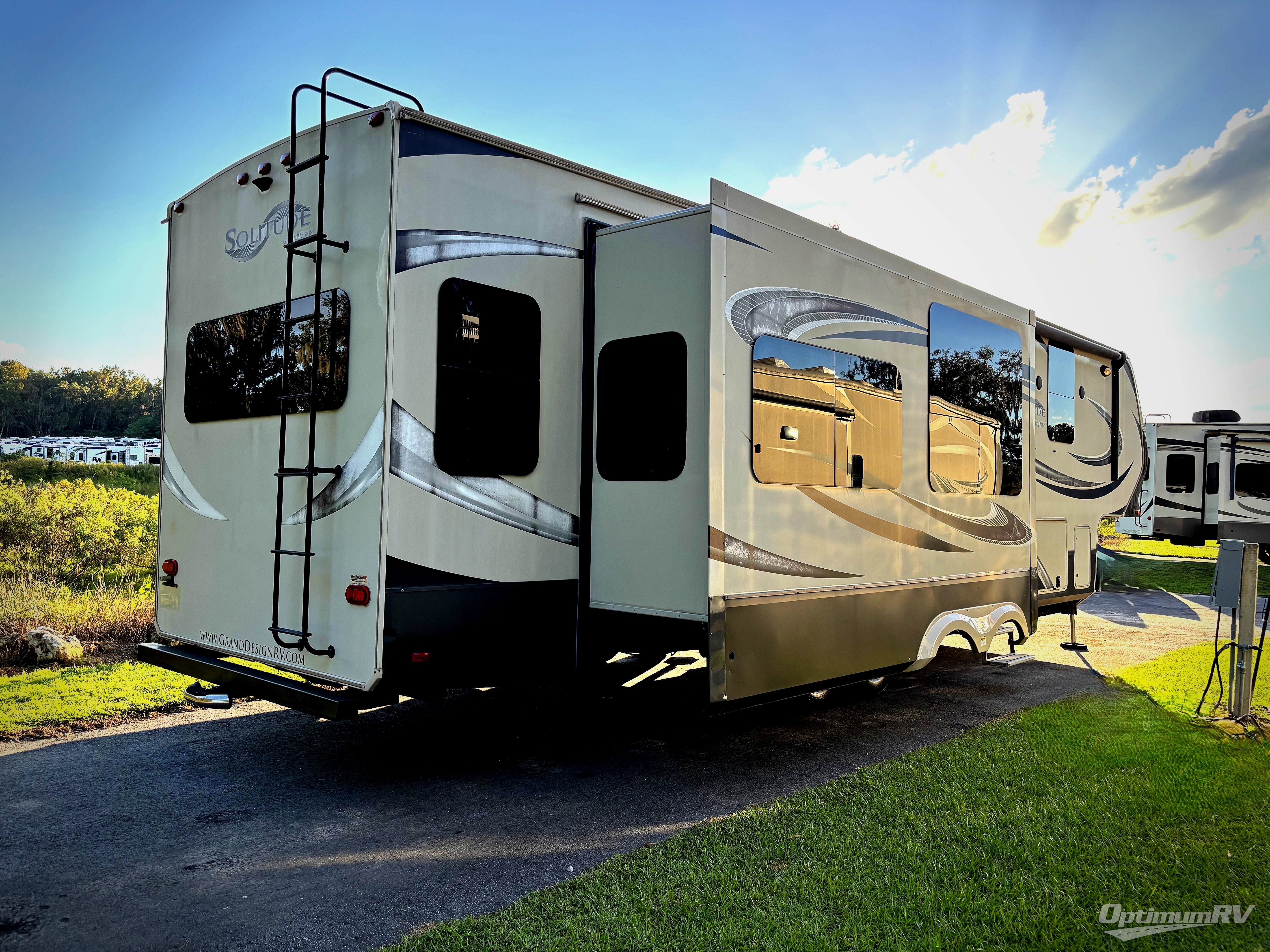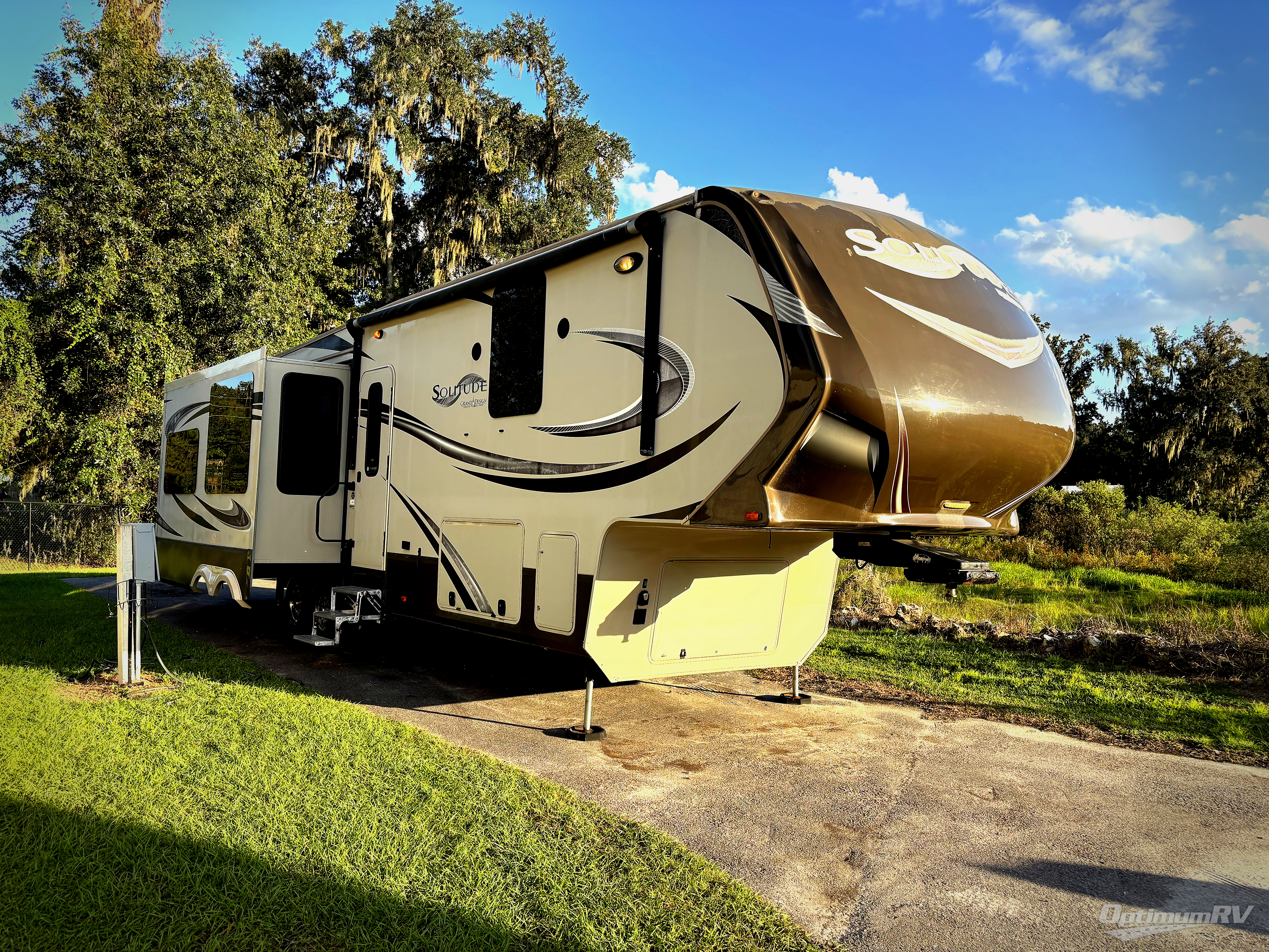 Enter this Solitude fifth wheel 369RL by Grand Design and be amazed at the wide open space you see with dual opposing slides in the combined kitchen and living area.