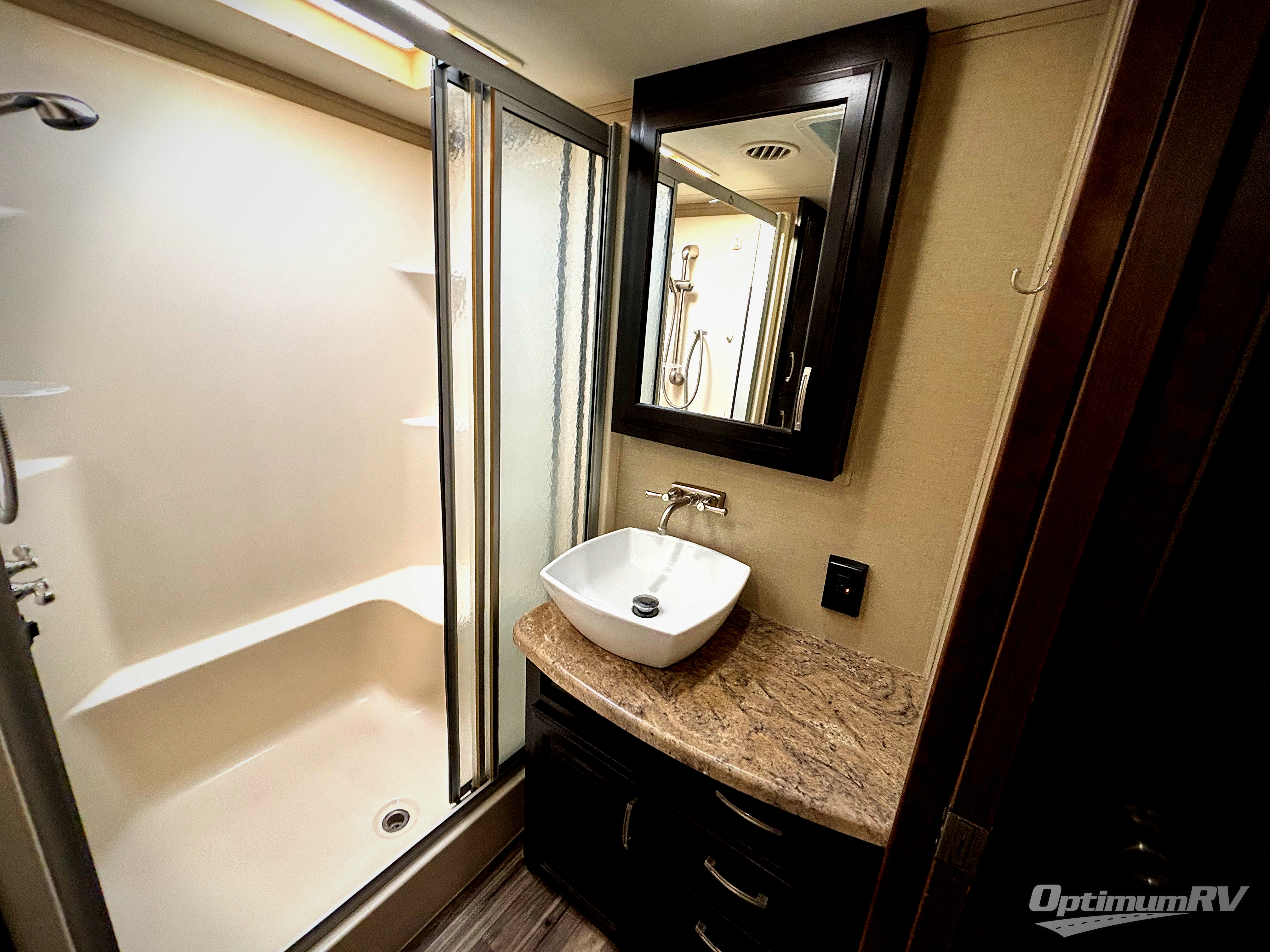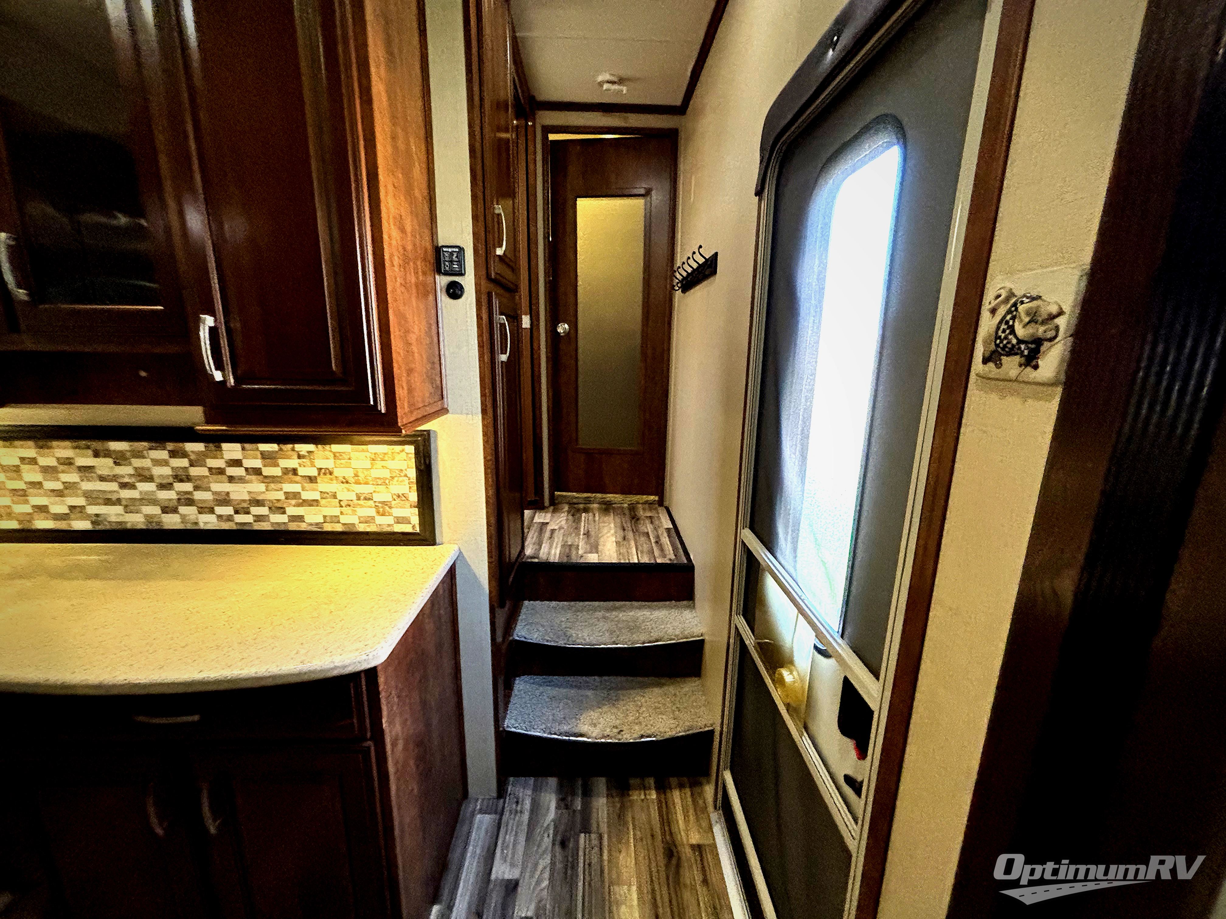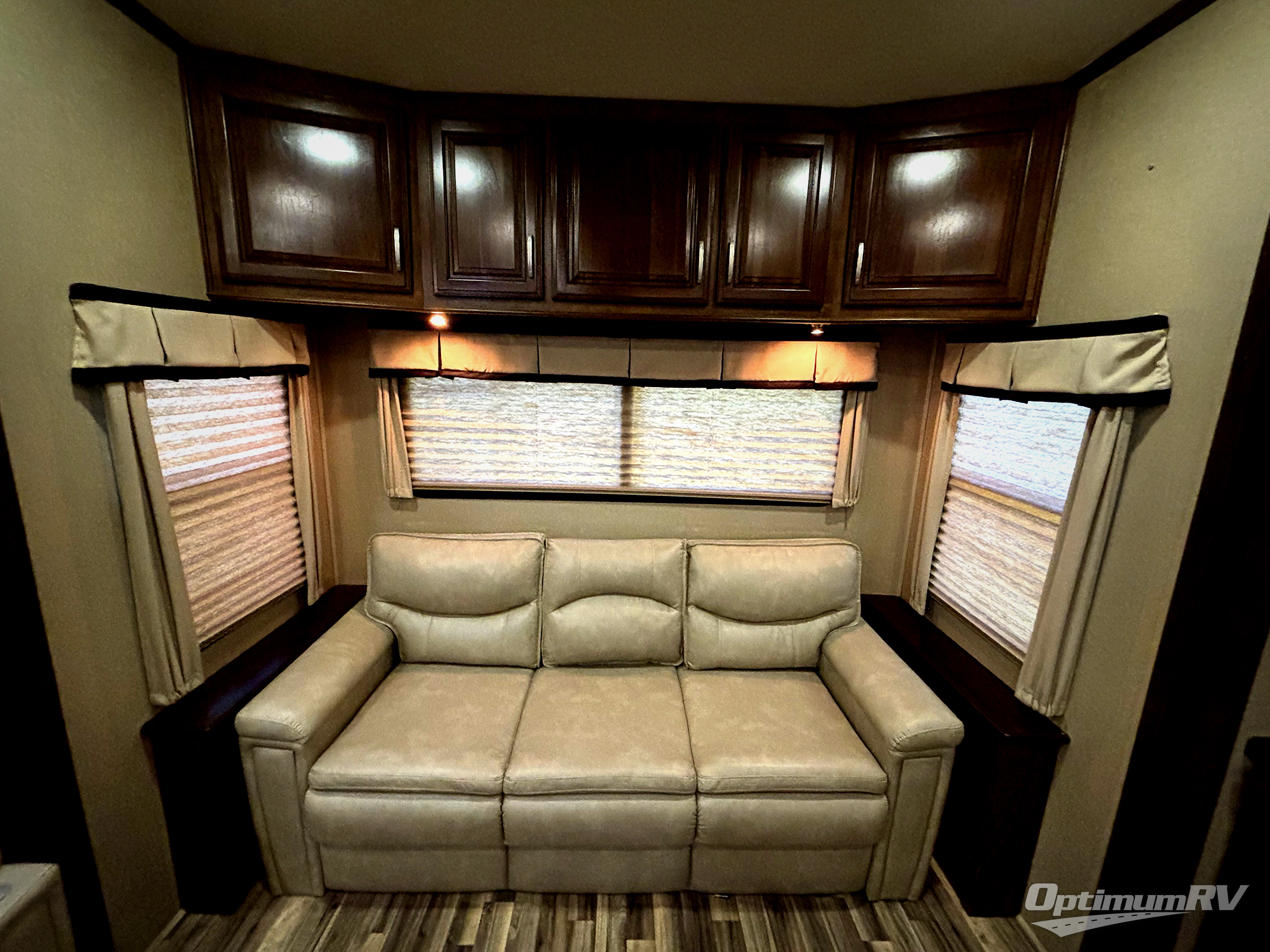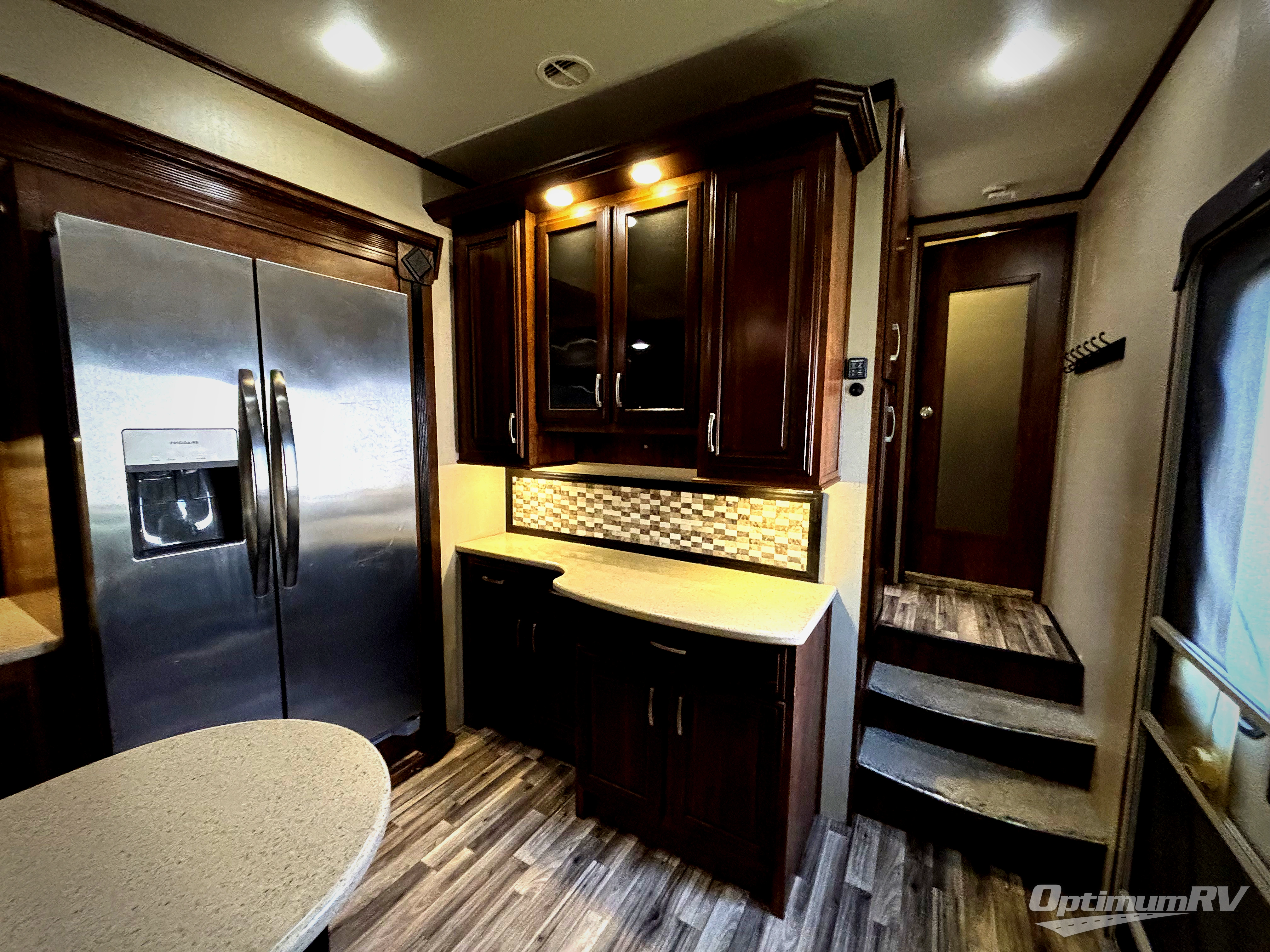 Enter this Solitude fifth wheel 369RL by Grand Design and be amazed at the wide open space you see with dual opposing slides in the combined kitchen and living area.