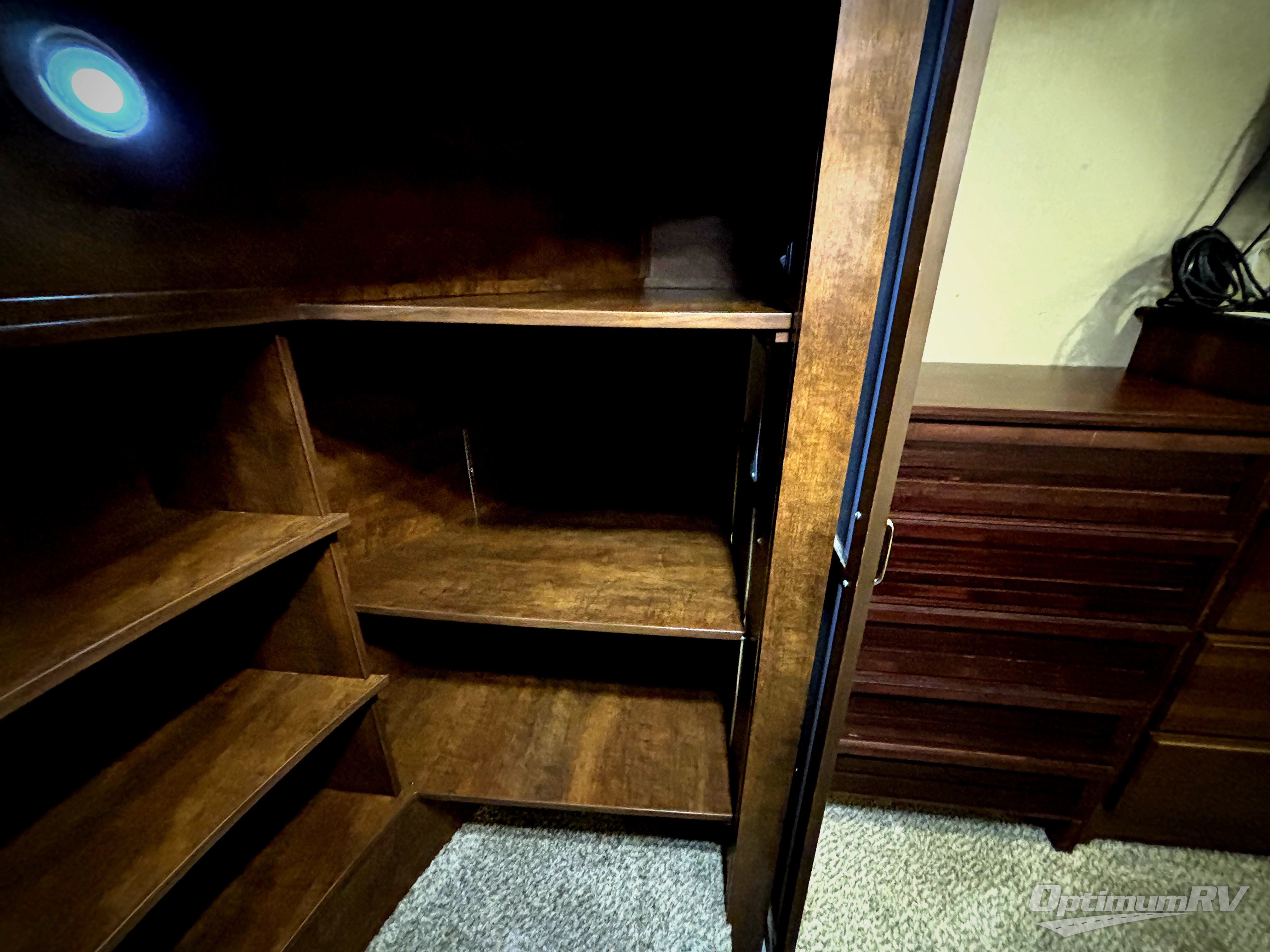 Enjoy a sofa along the rear wall featuring overhead cabinets and end tables. The entertainment center is located in the opposite slide featuring an LED TV with fireplace below and slide-out desk with drawers also. Along with the entertainment center there is also a large pantry for storing dry goods, a three burner range, counter space, and refrigerator. You may choose to add a larger side-by-side refrigerator if you like. The convenient kitchen island provides a bit more counter space and dual sinks making cleanup and food prep a breeze.