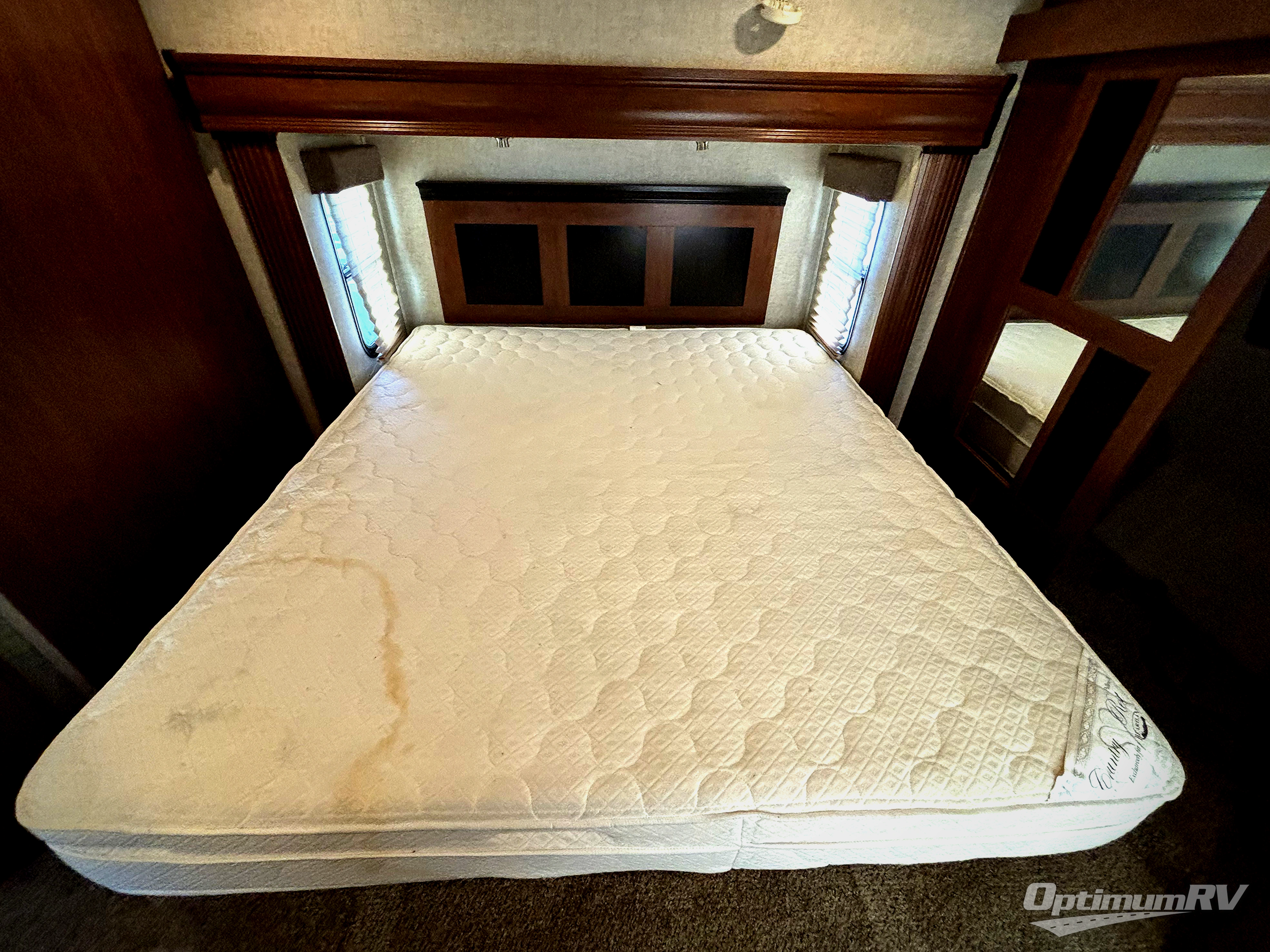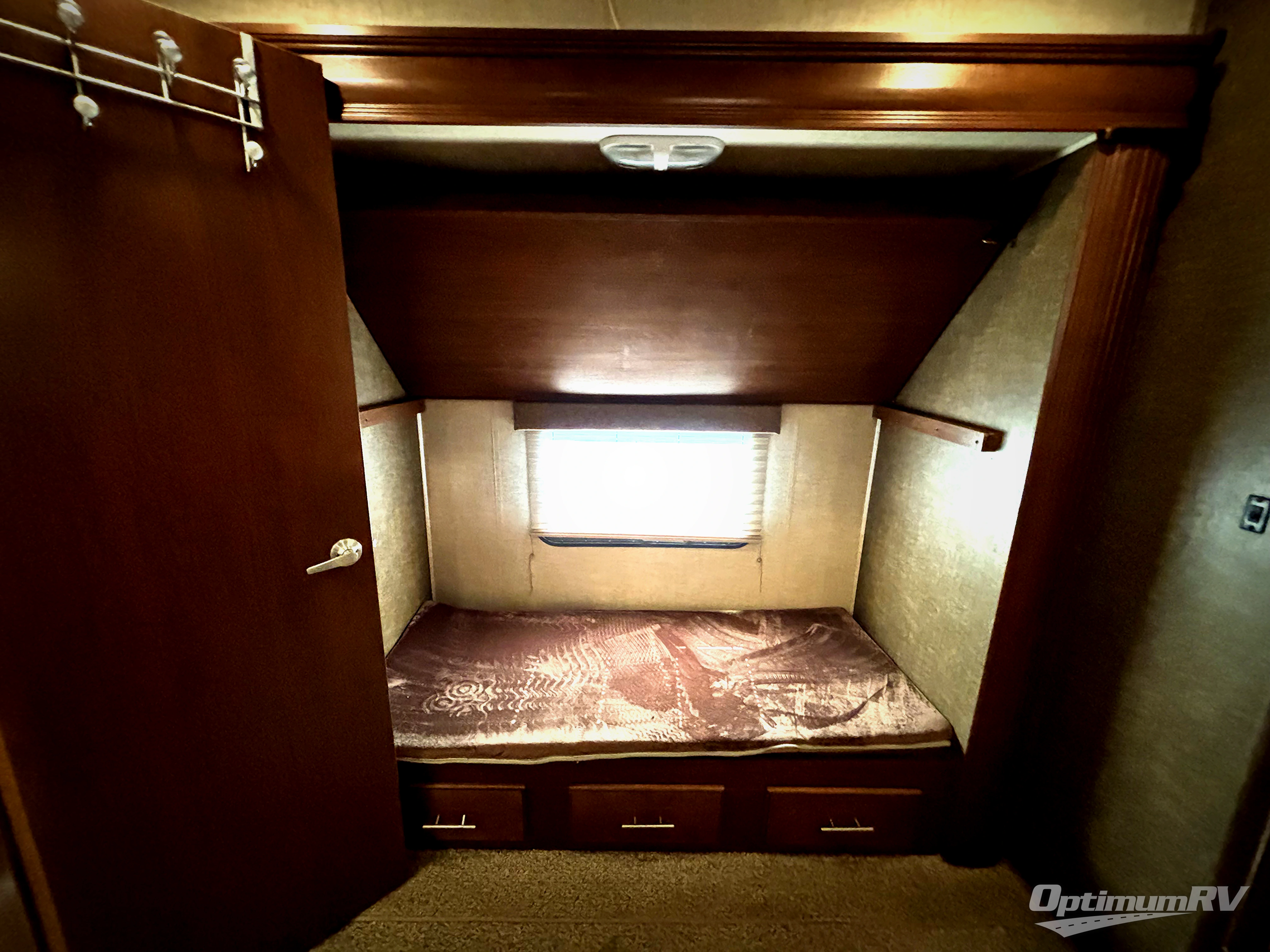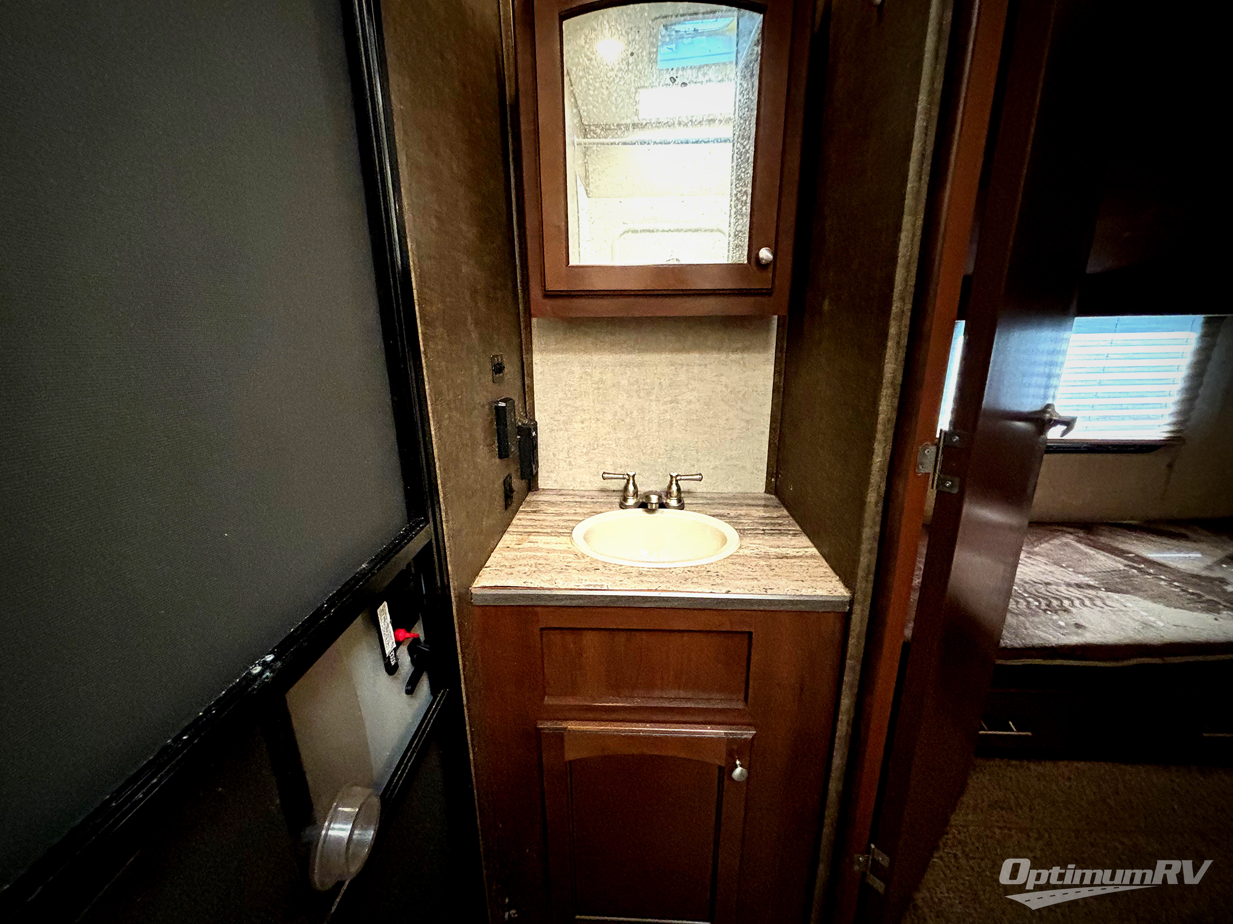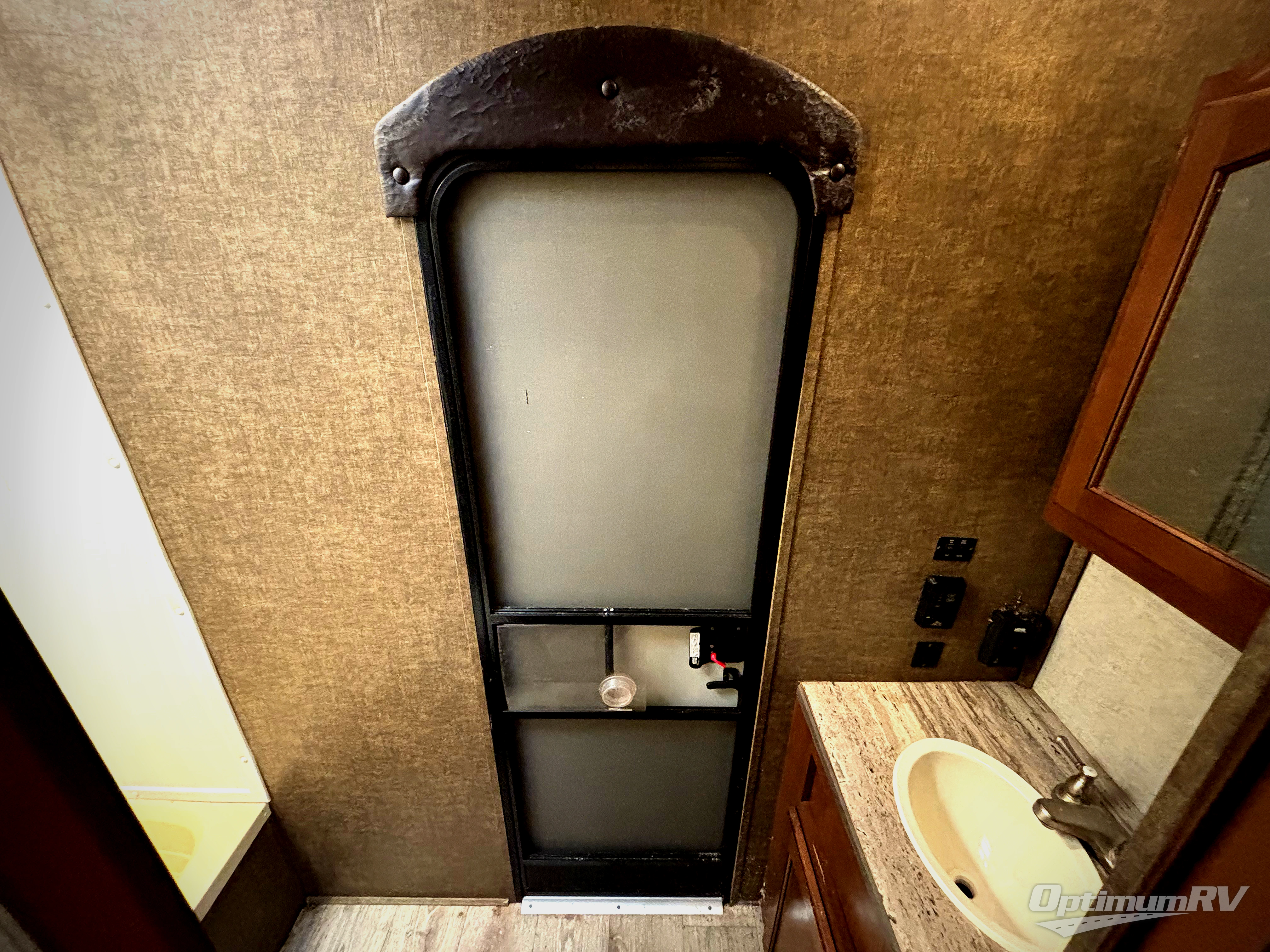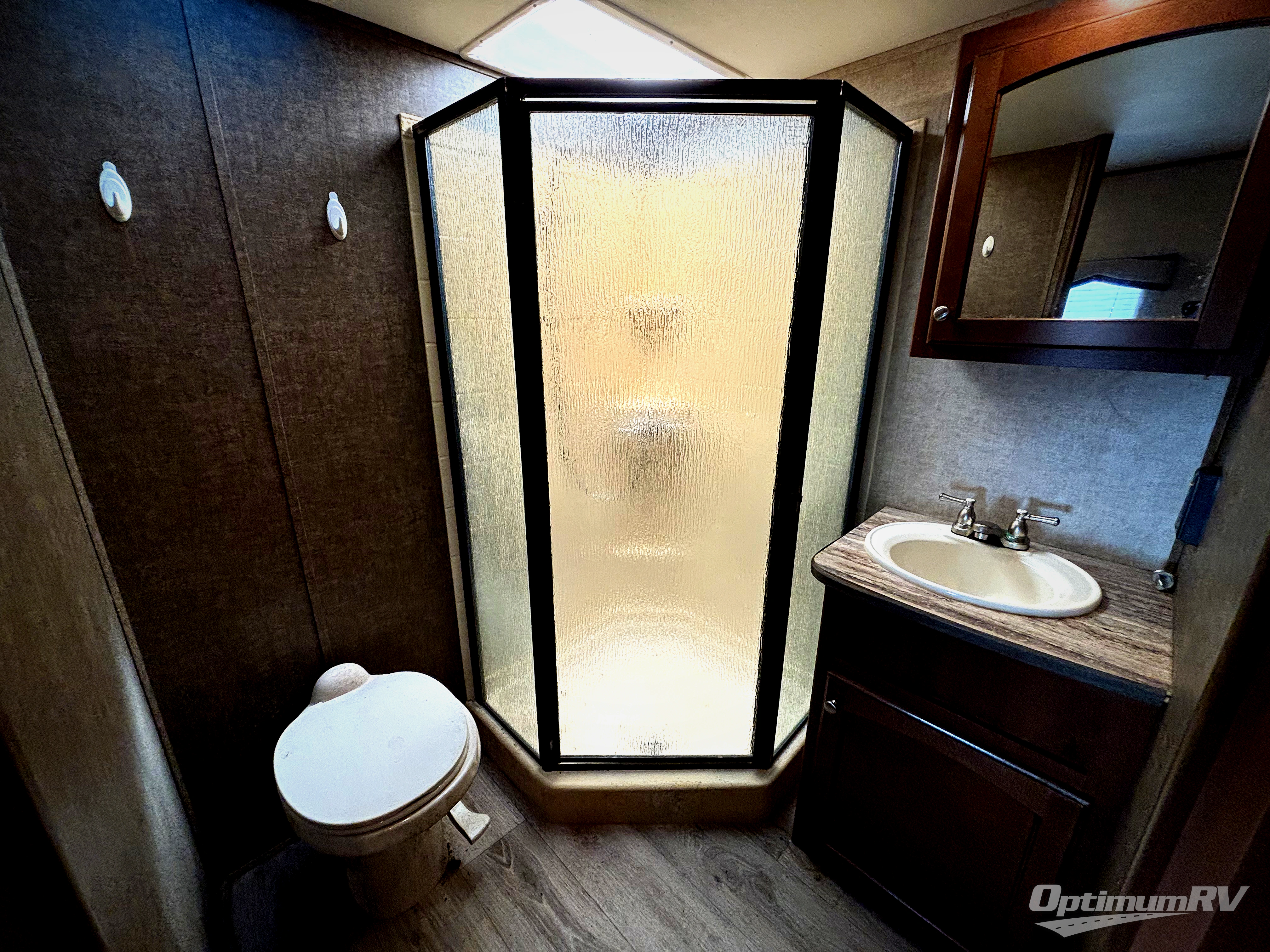 Step inside model 38RSRT and be completely amazed at what you find inside. Head up the steps to the right of the main side entry door and see a full bath at the top of the steps on your left. It includes an angled shower, toilet, and sink.