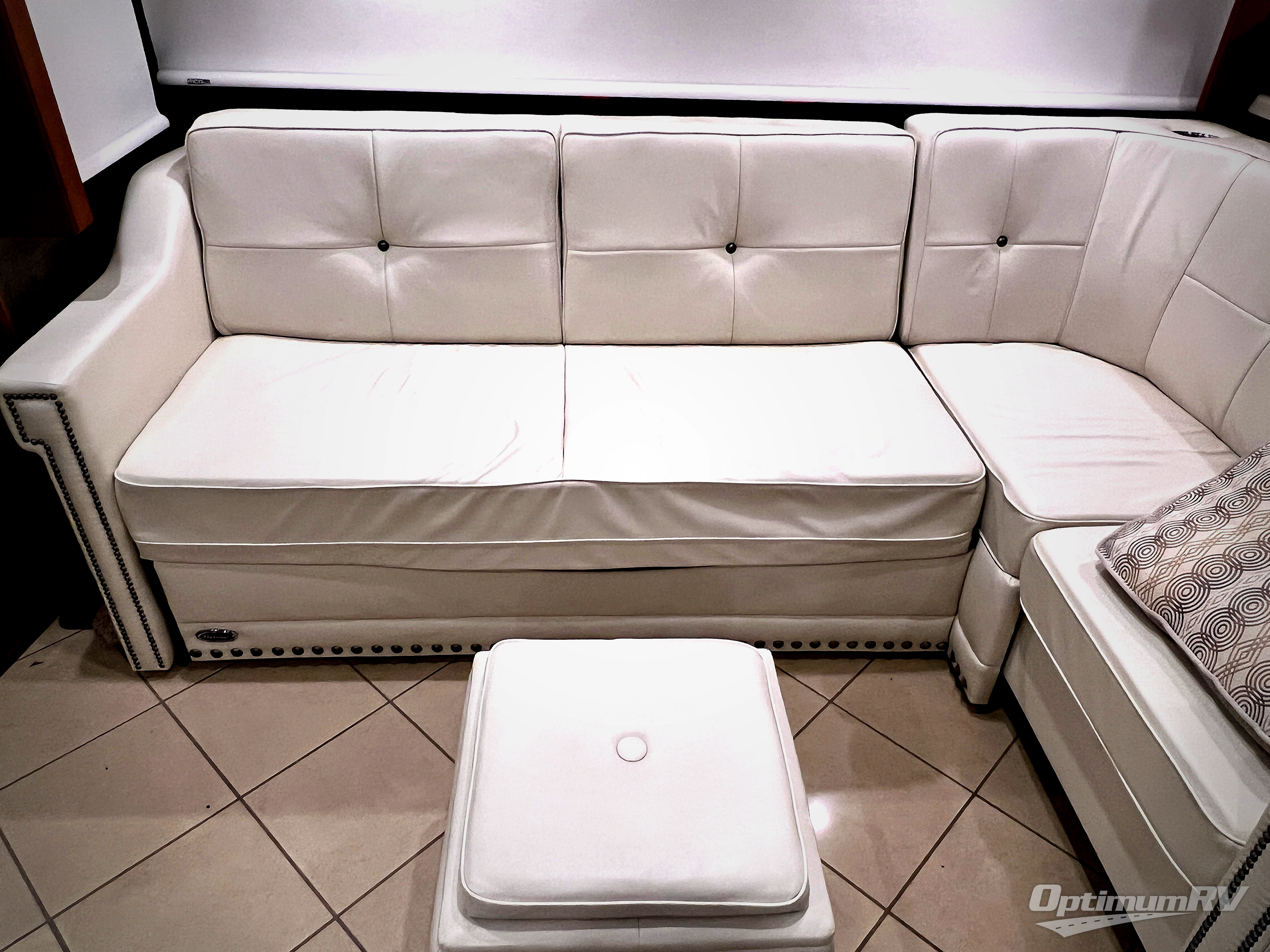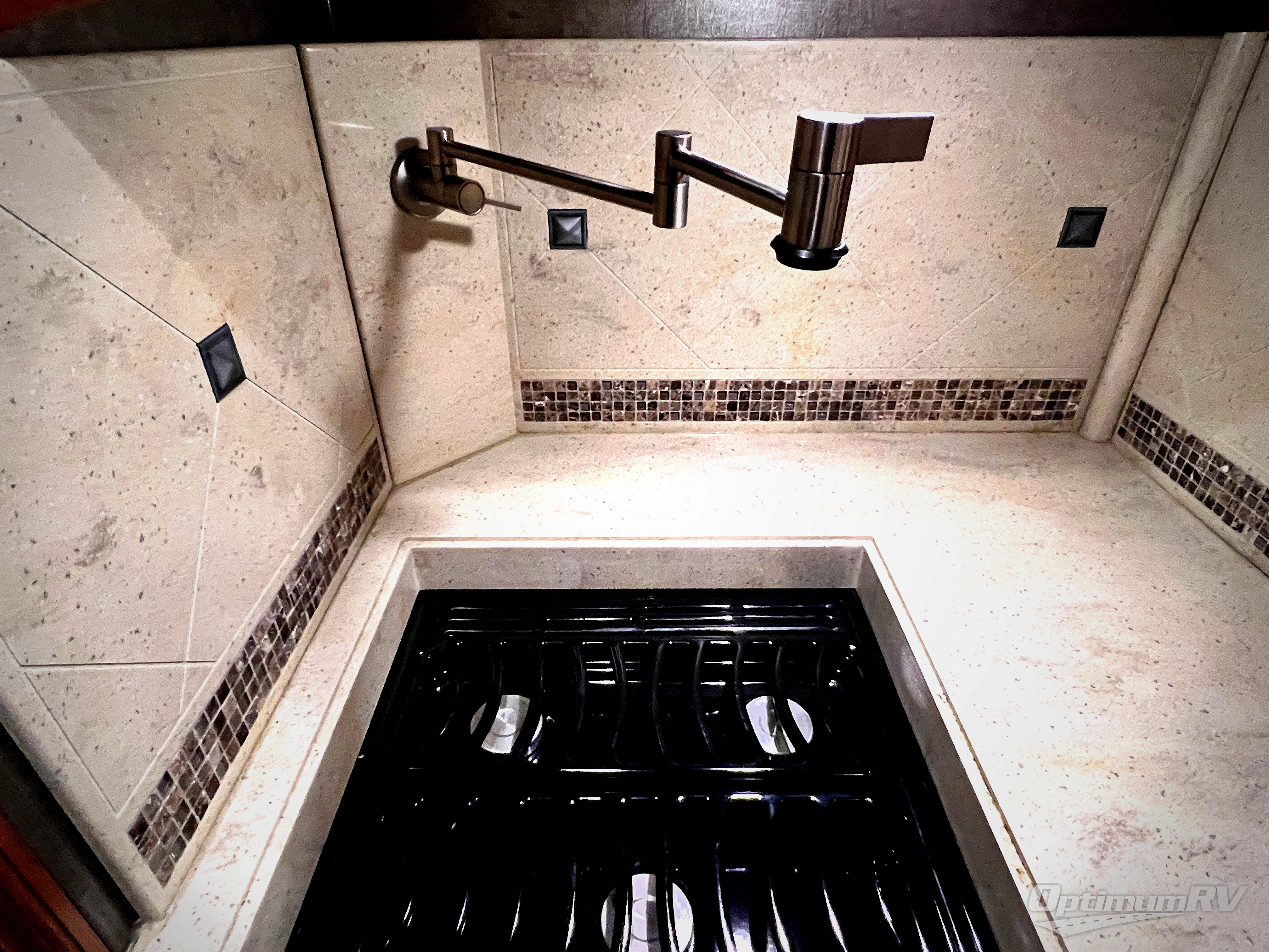 As you enter notice the kitchen area up front. There is a slide out three burner range, microwave oven, and residential refrigerator, along with Glide and Dine table and chairs, and 55" HDTV with fireplace behind the passenger seat. On the opposite side find a large counter area with overhead storage and a double kitchen sink in the slide out behind the driver's seat along with a Rest Easy extendable sectional sofa.
