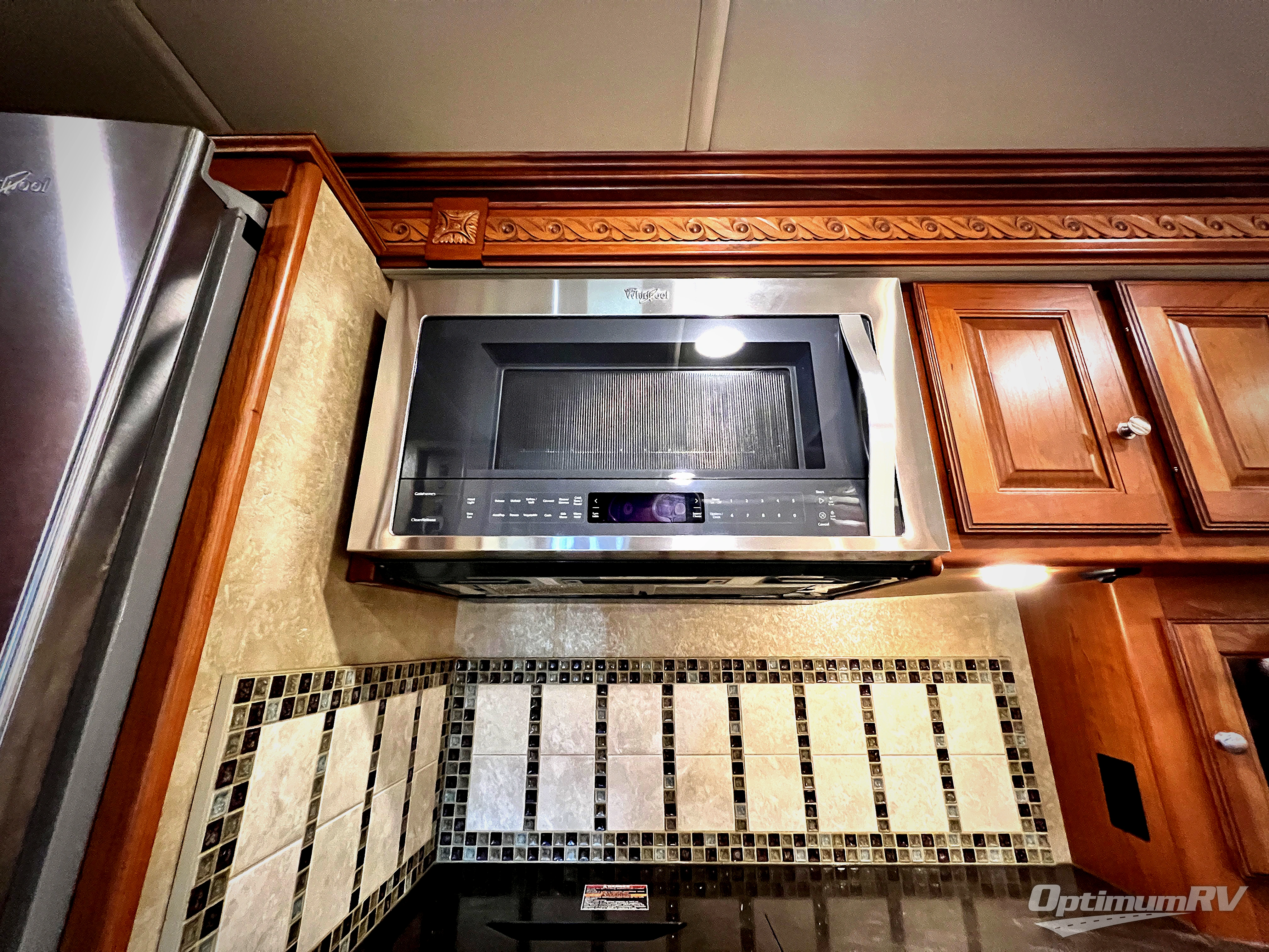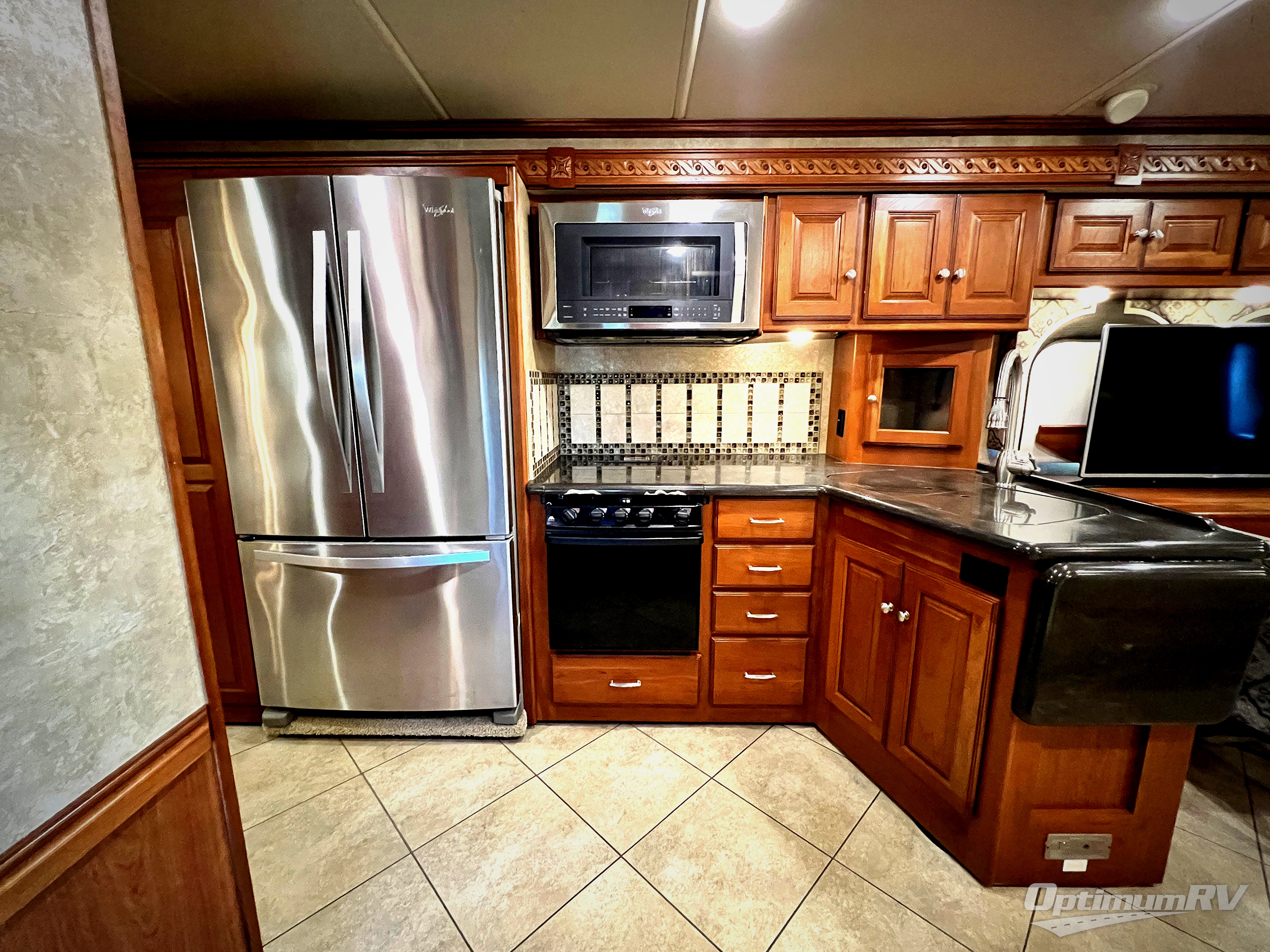 Opposite the door side in front enjoy meals at the Glide and Dine dinette with buffet and retractable 47" HD TV location found in the full wall slide. There is also a double kitchen sink, counter space, three burner range, 4 door refrigerator, a storage cabinet that is perfect for an optional washer and dryer if you like, and the bedroom wardrobe and chest of drawers, plus 28" HD TV location too.
