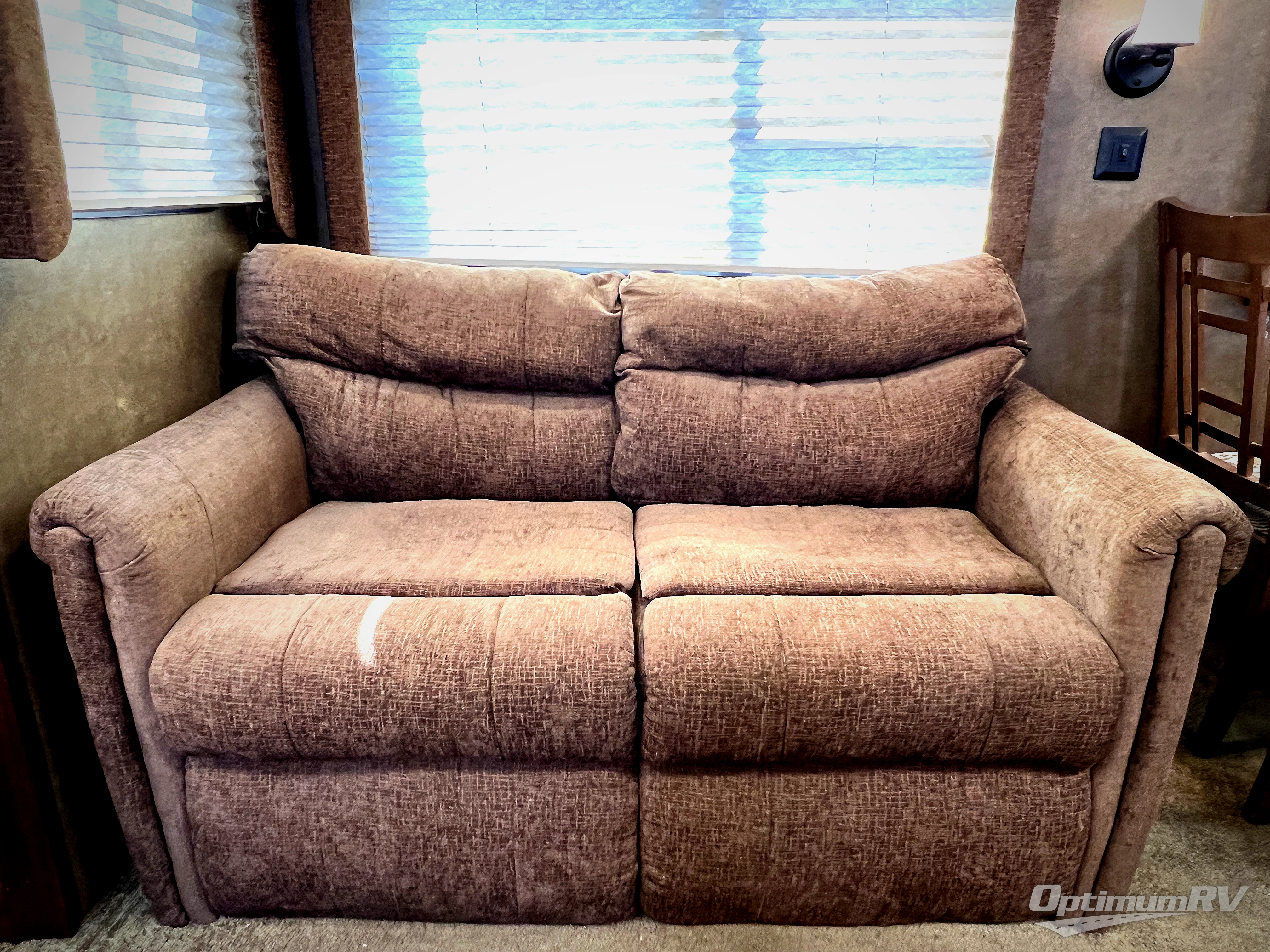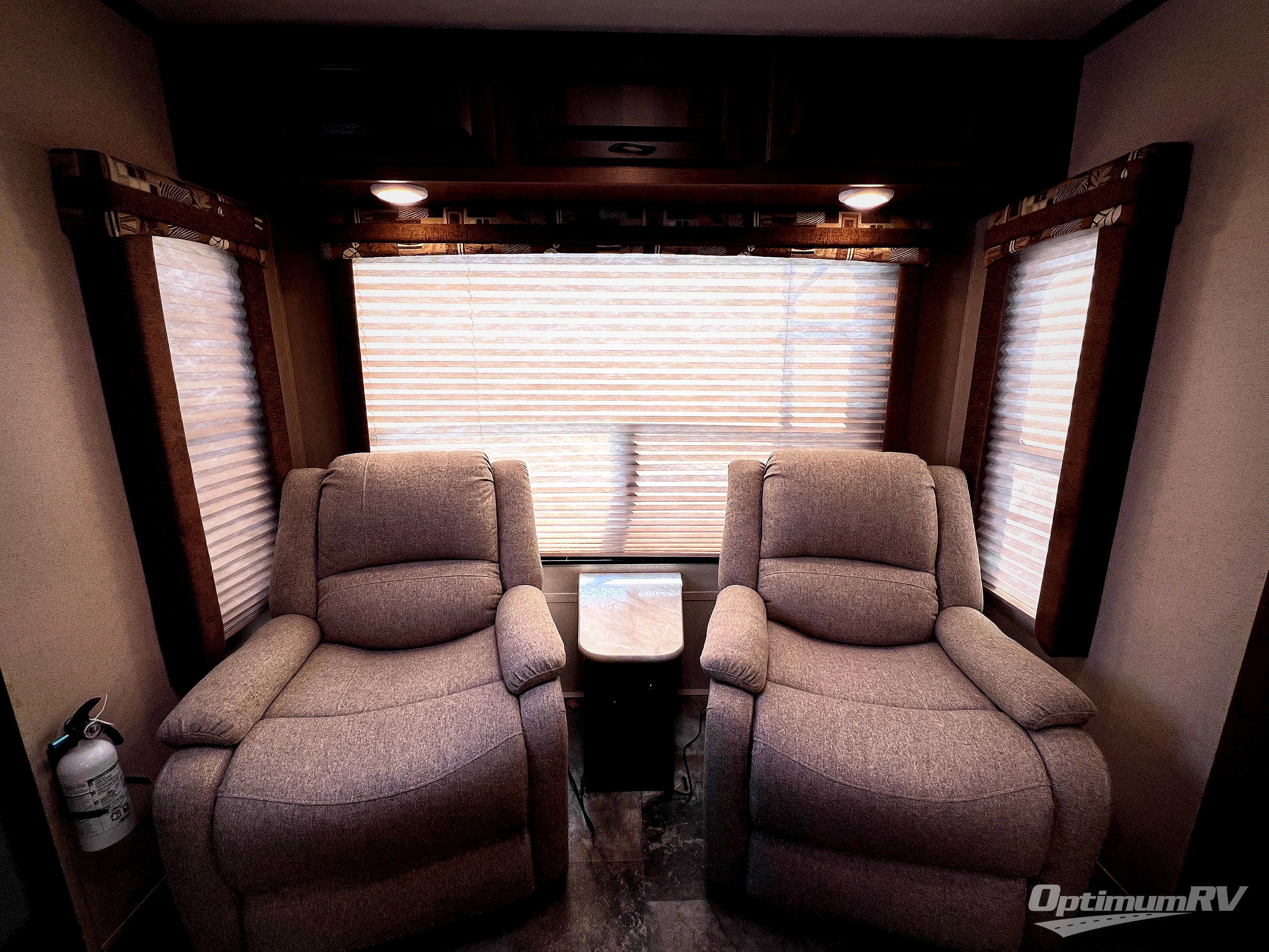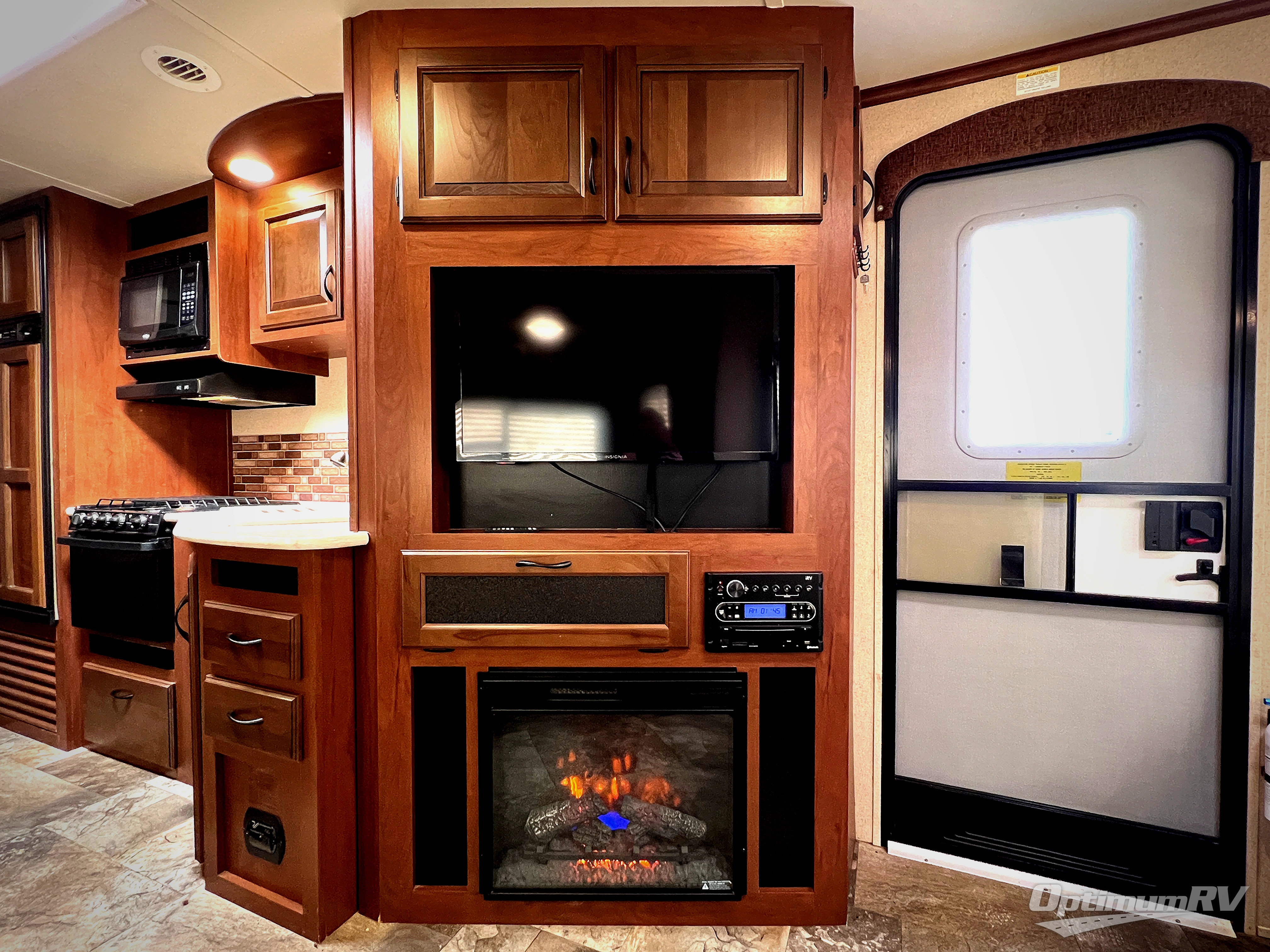 Along the rear wall there are two lounge chairs and an end table. The slide has a sofa and a dinette. Next to the slide there is a handy wardrobe. On the opposite side of the trailer you will find an entertainment center with optional fireplace, double kitchen sink, three burner range, microwave, refrigerator, and corner linen cabinet.