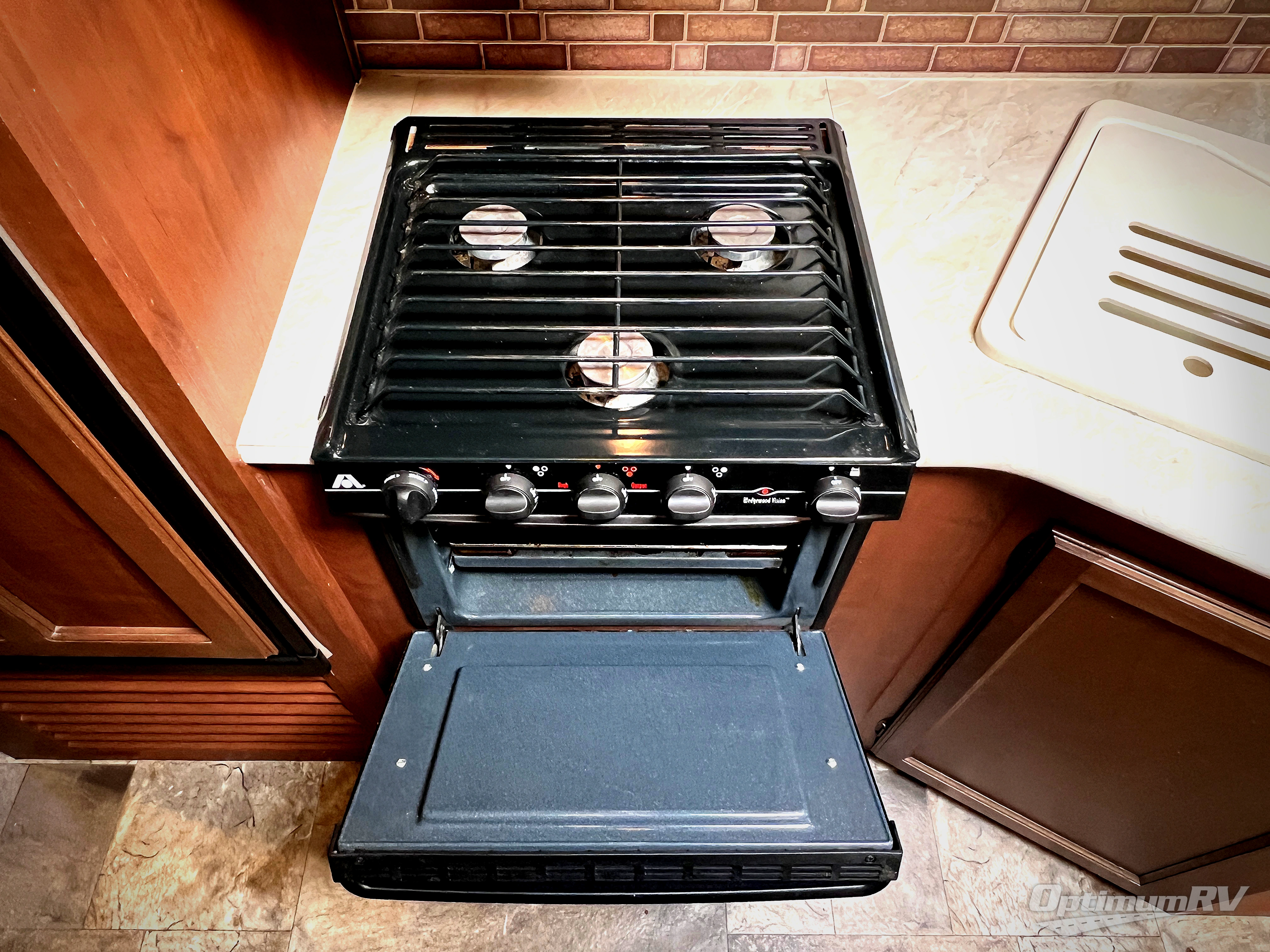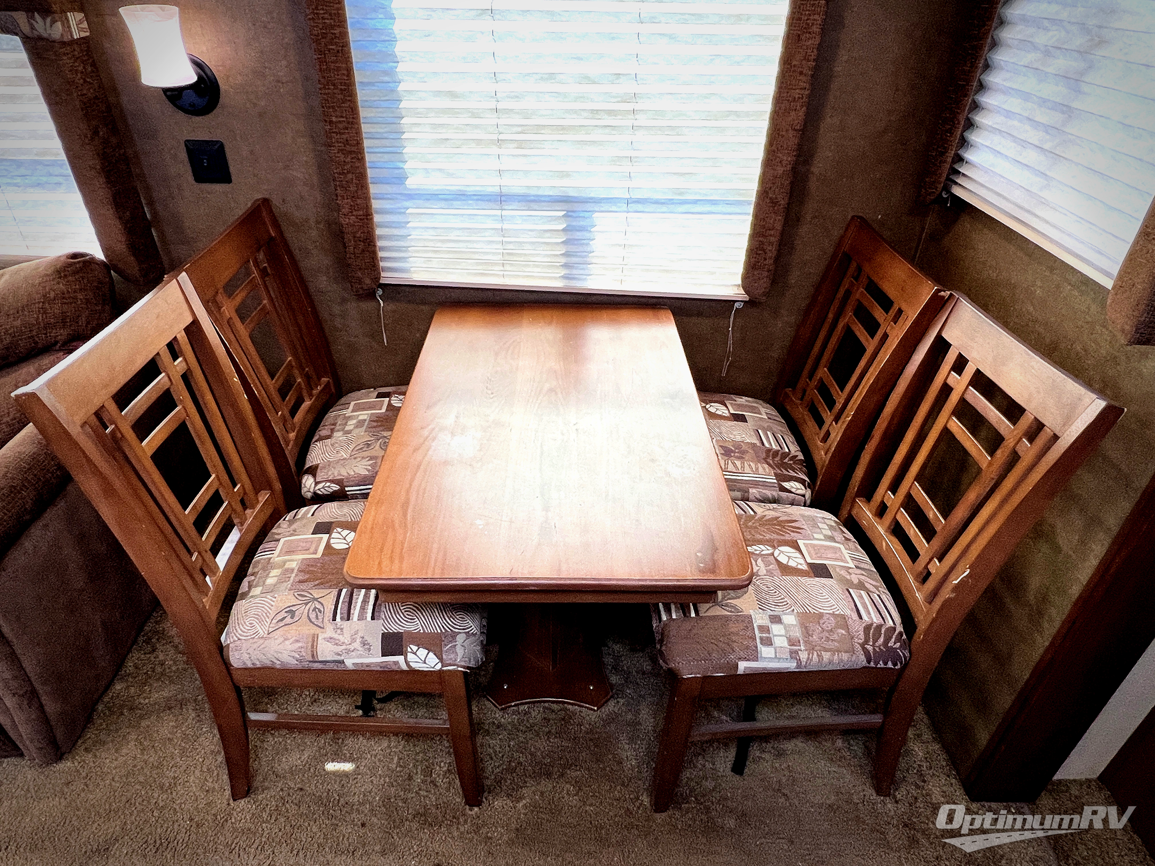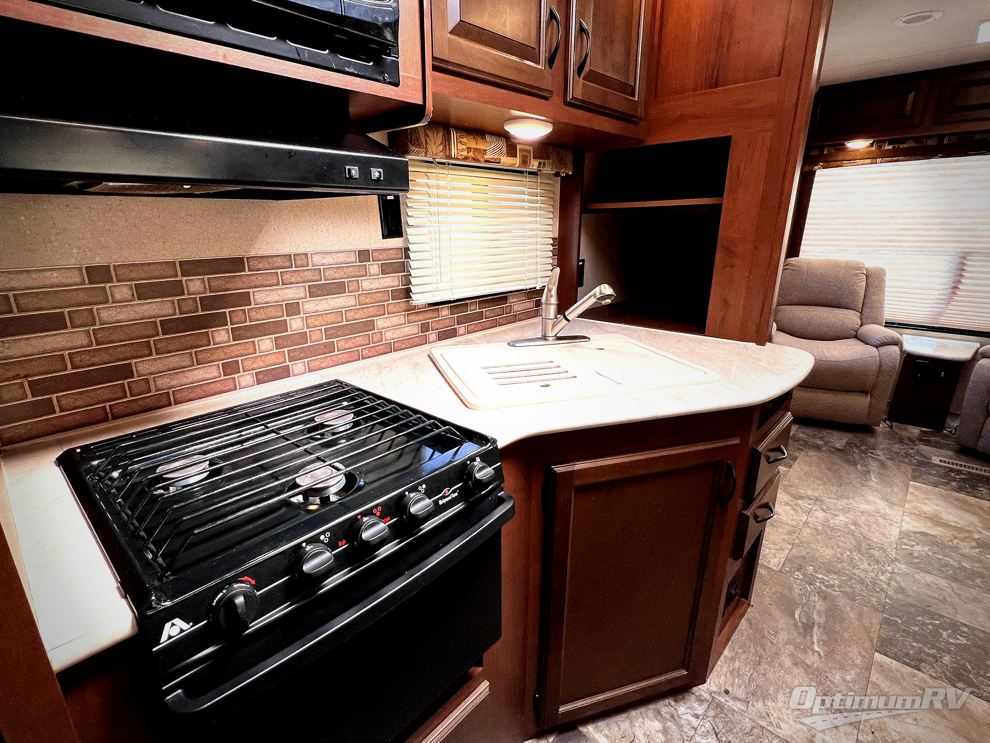 Along the rear wall there are two lounge chairs and an end table. The slide has a sofa and a dinette. Next to the slide there is a handy wardrobe. On the opposite side of the trailer you will find an entertainment center with optional fireplace, double kitchen sink, three burner range, microwave, refrigerator, and corner linen cabinet.