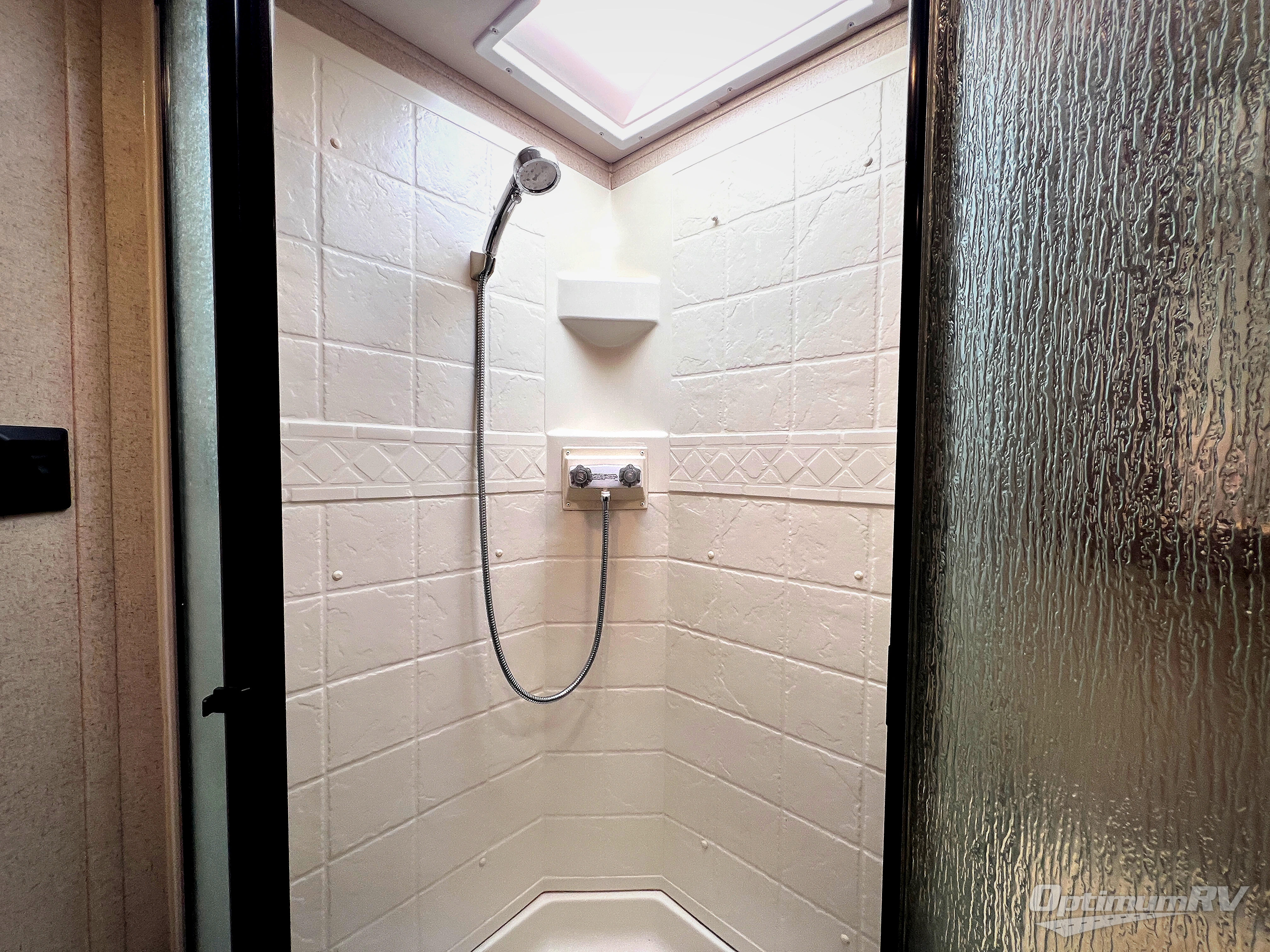 The side aisle bath has a corner shower, sink, medicine cabinet, and toilet.