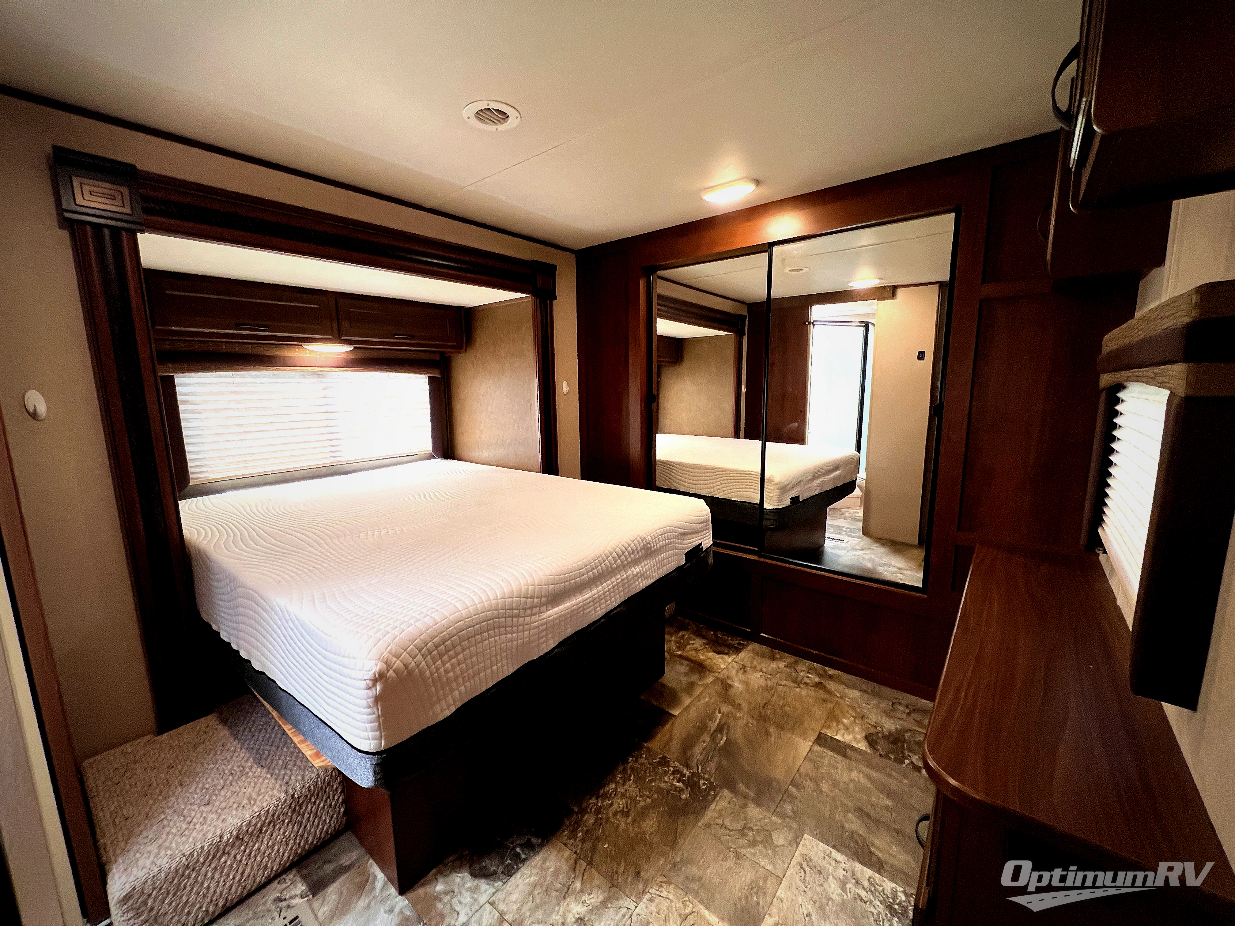 In the front bedroom there is a queen bed slide, dresser, and front wall wardrobe.