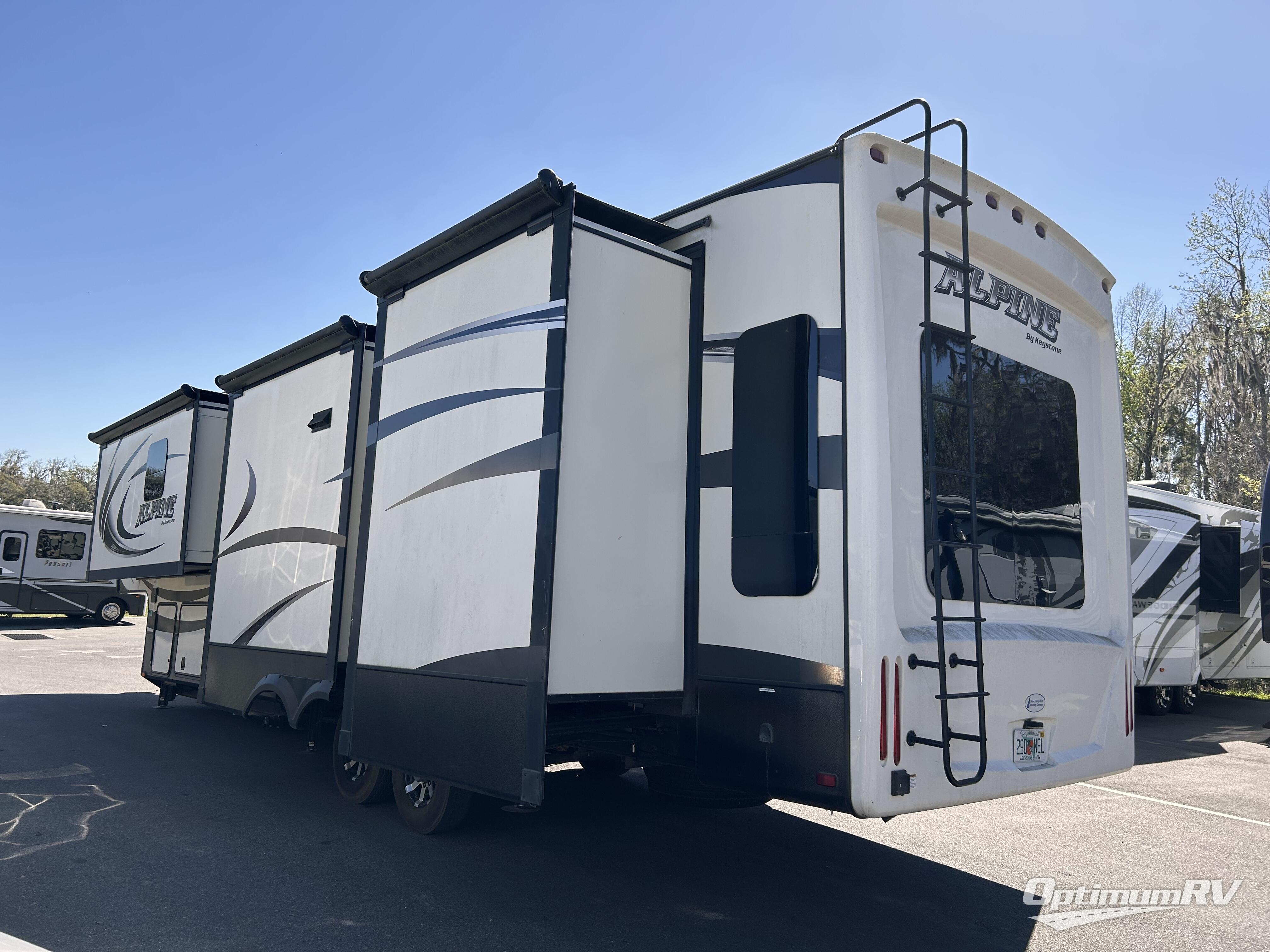 You will be camping comfortably in this Keystone Alpine fifth wheel model 3556RL. This unit features a rear living layout, quadruple slides, and a king size bed!
