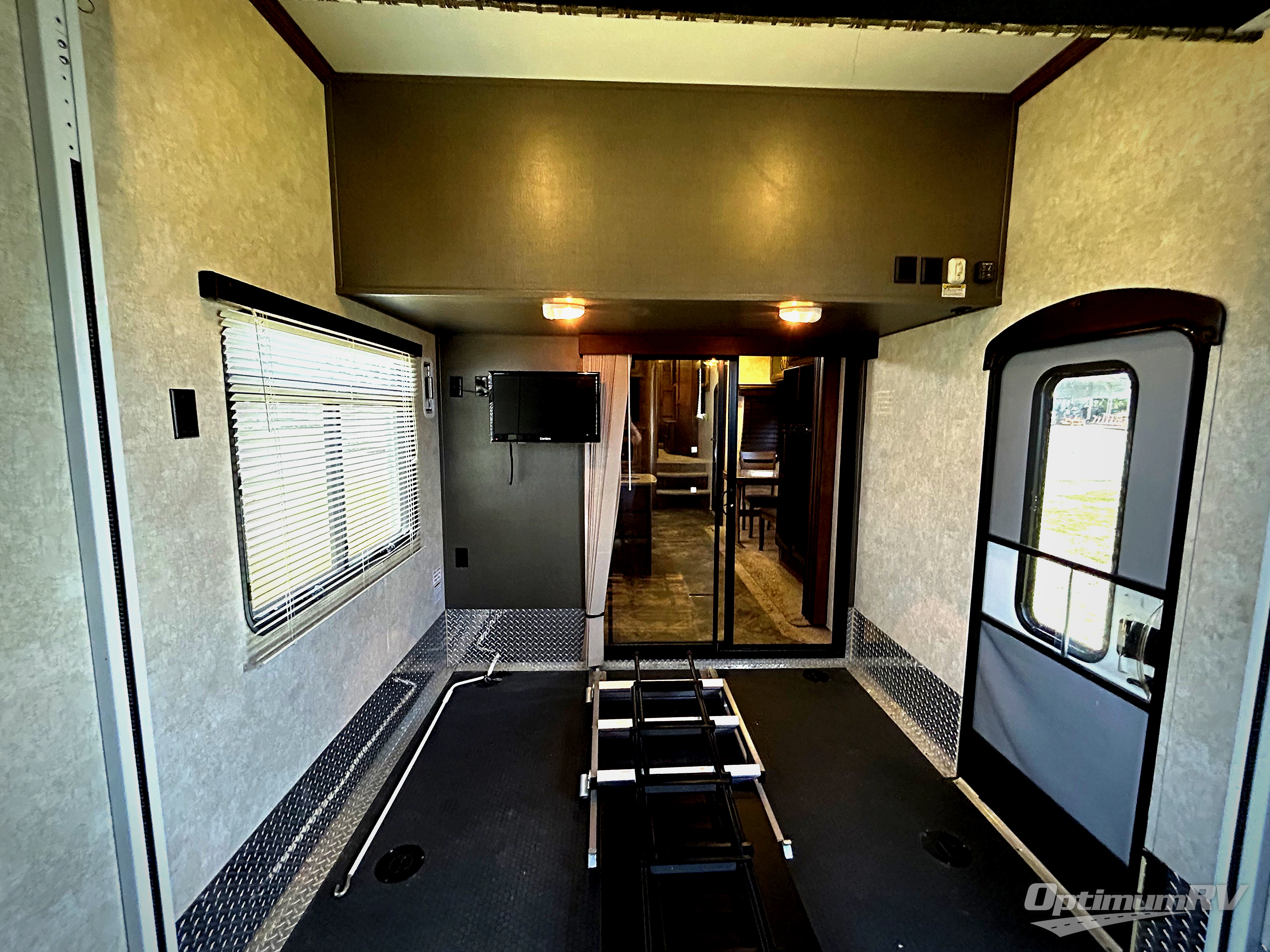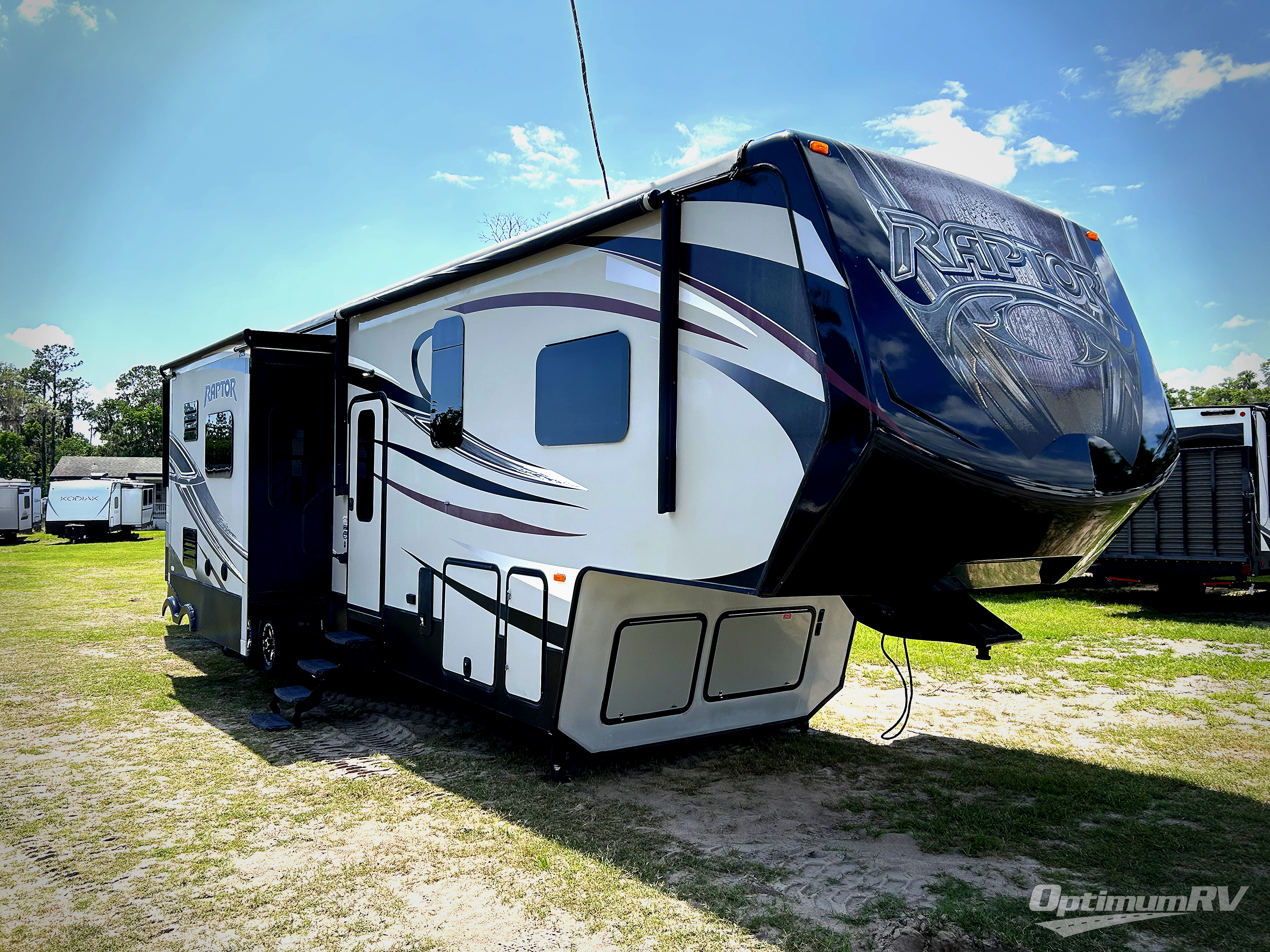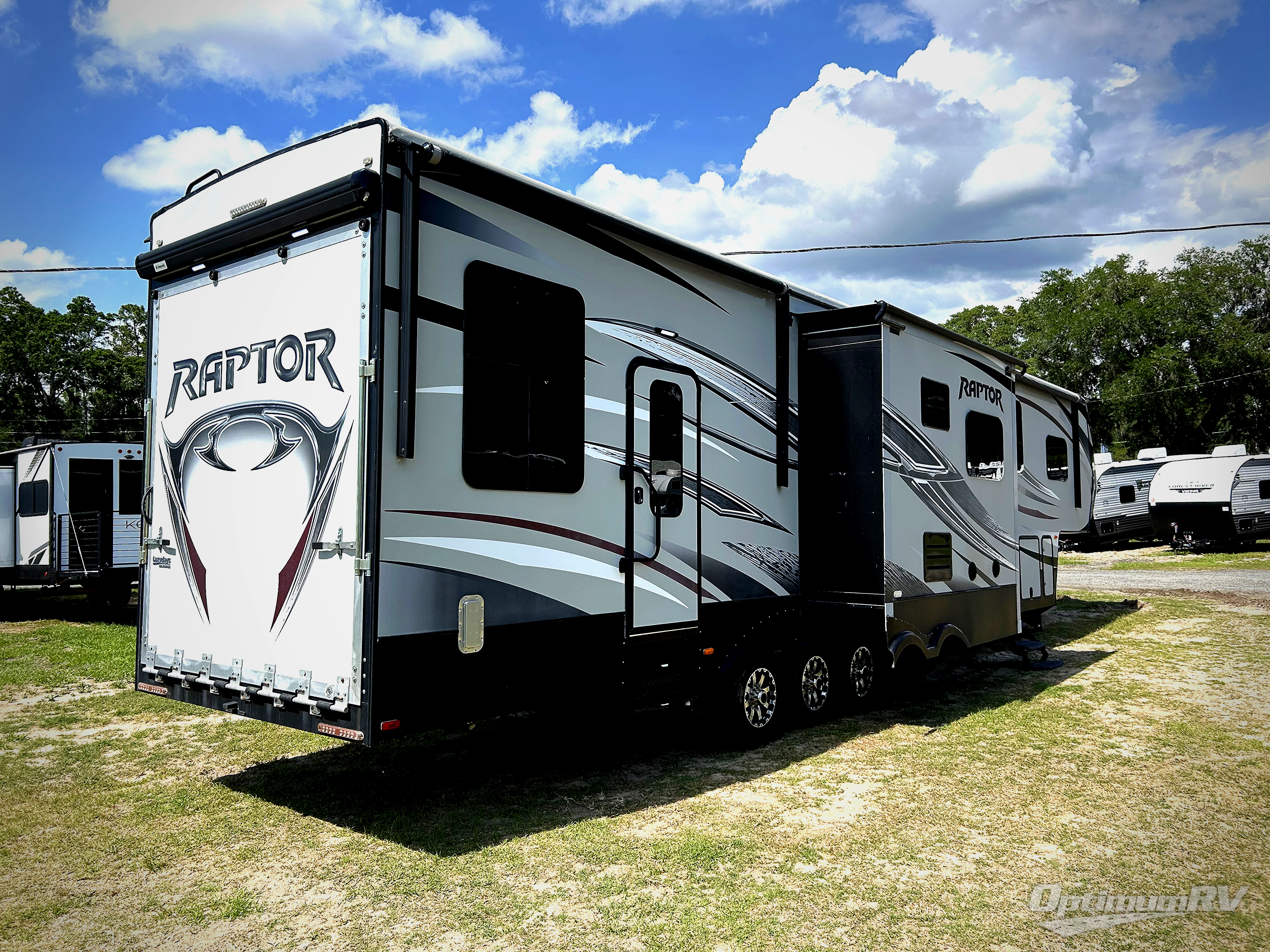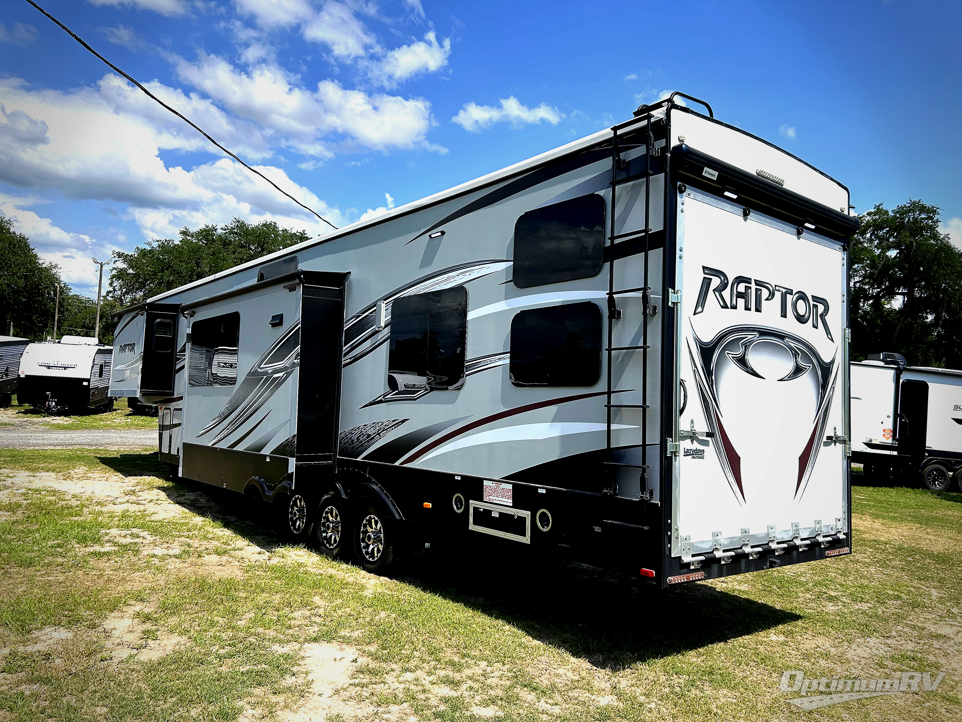 You will have no problem traveling with your favorite toys in this Keystone Raptor model 412TS. This fifth wheel toy hauler has everything you need for comfort on the inside, plus a 12' garage with 30 gallon fuel station to keep the toys going all weekend long.