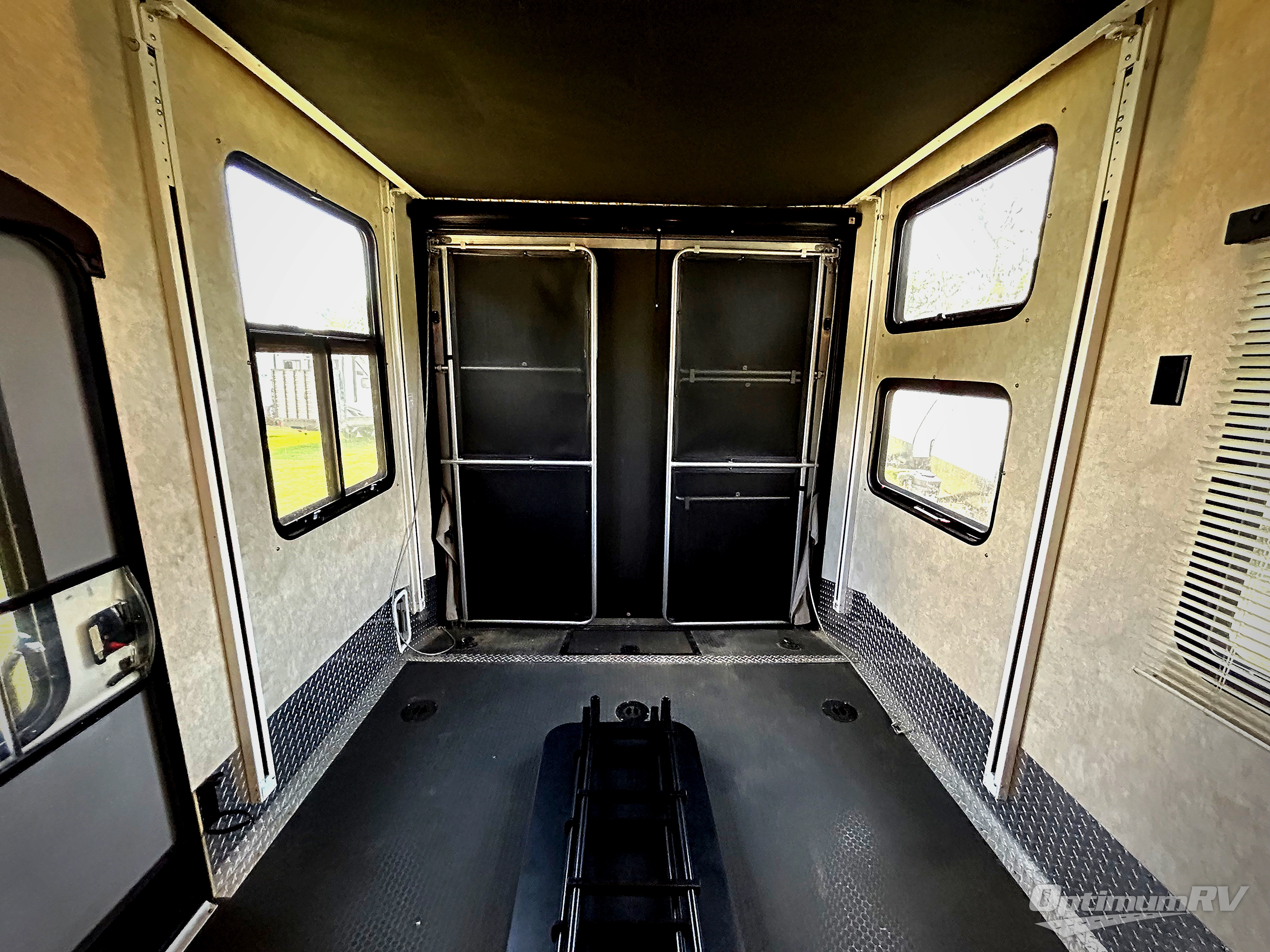 Step inside the garage space using the rear ramp door. You can see that loading would be a cinch. There is a side man door in the garage for easy access when the ramp door is closed and a sliding glass patio door to the main living space making it easy to open things up when the toys are removed. There is a twin loft bed above the garage that the kids will surely love, and an electric bed with dual opposing sofas in the rear for more sleeping space at night and lounging during the day.