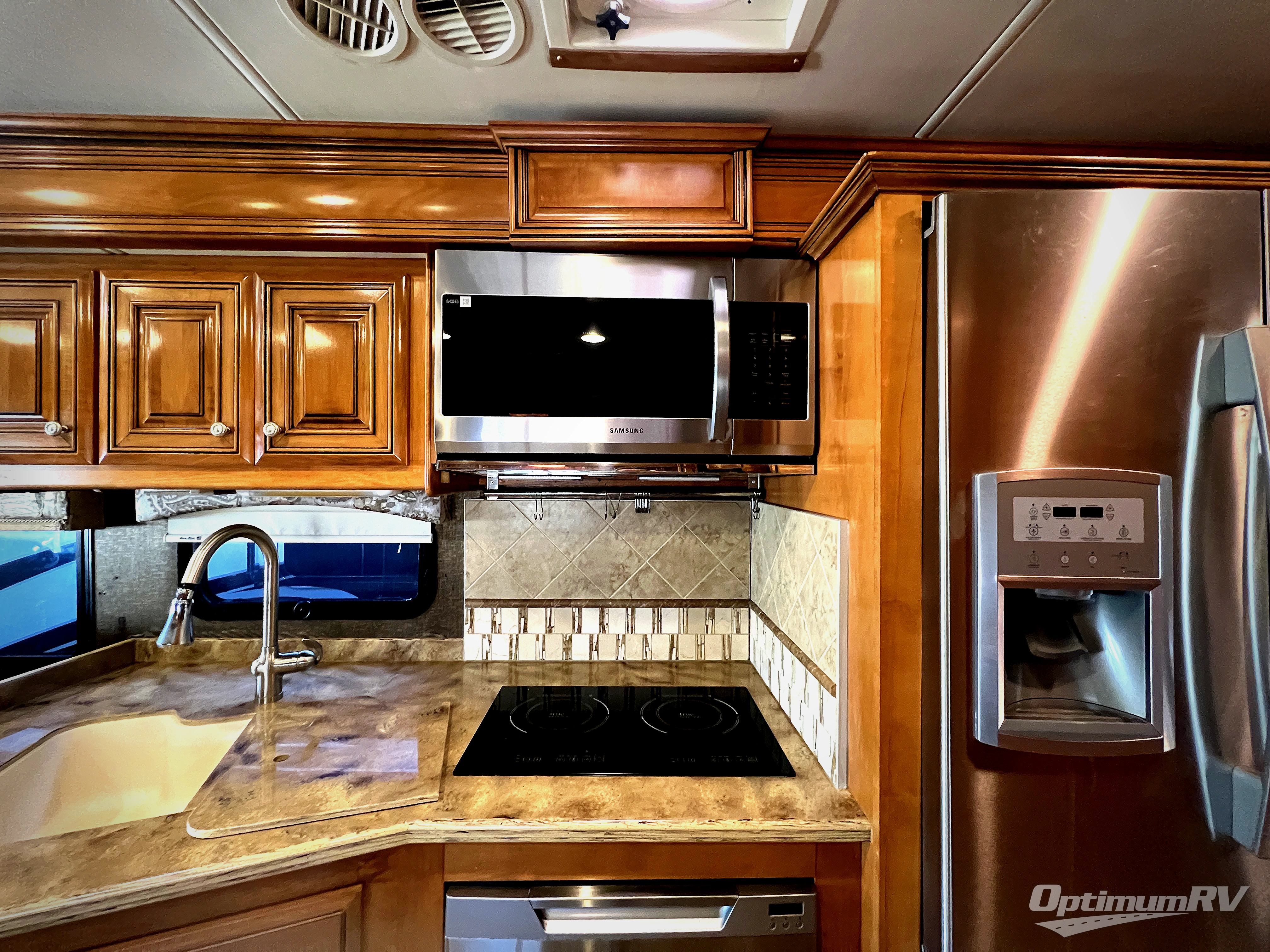 The curb side slide not only features theater seating, but also the kitchen and bedroom storage area as well. You will easily be able to cook up light meals and snack as you travel with a double sink, a two burner range top with overhead microwave, refrigerator, and pantry. There is also plenty of storage both above and below the counter area.