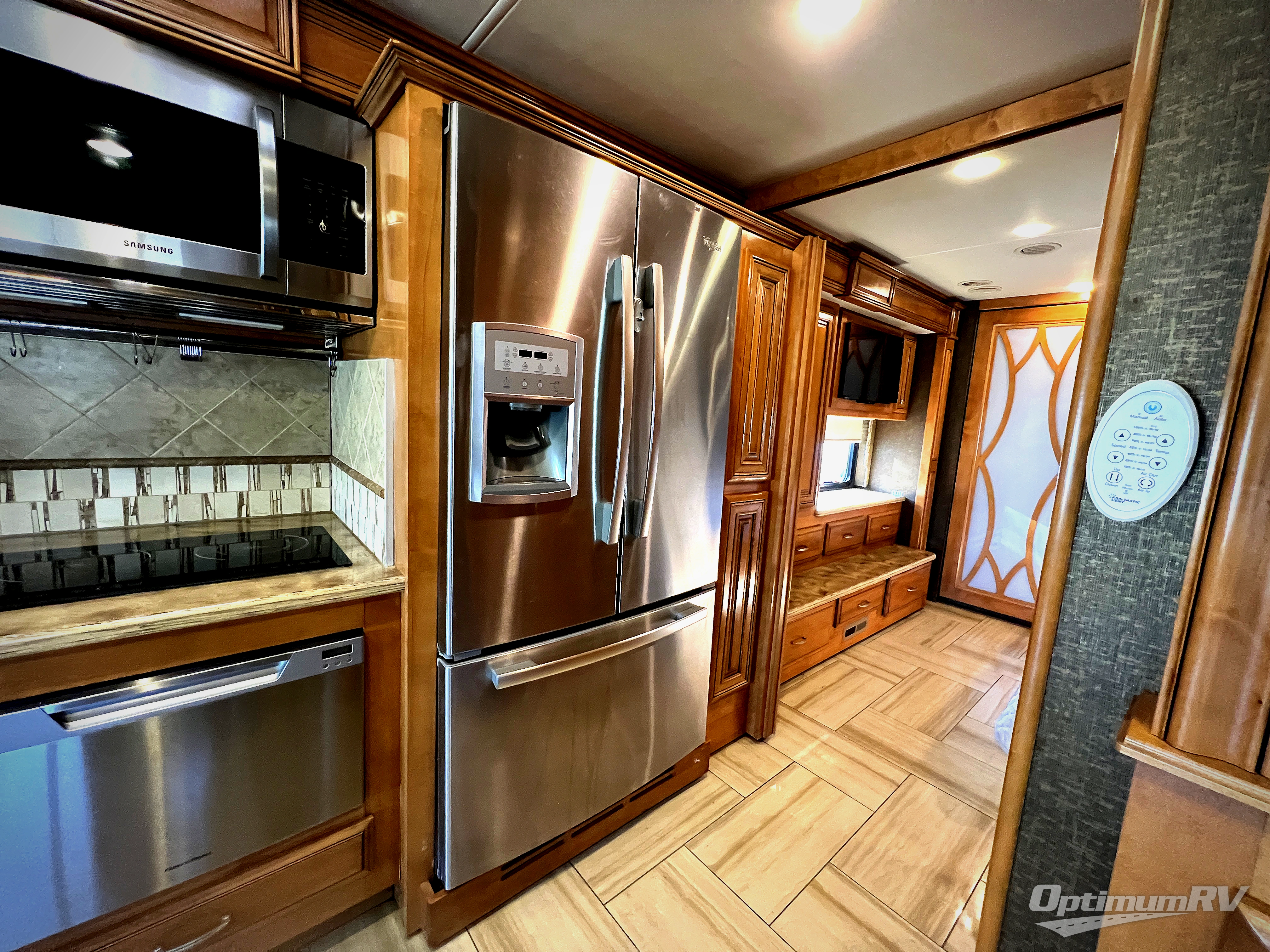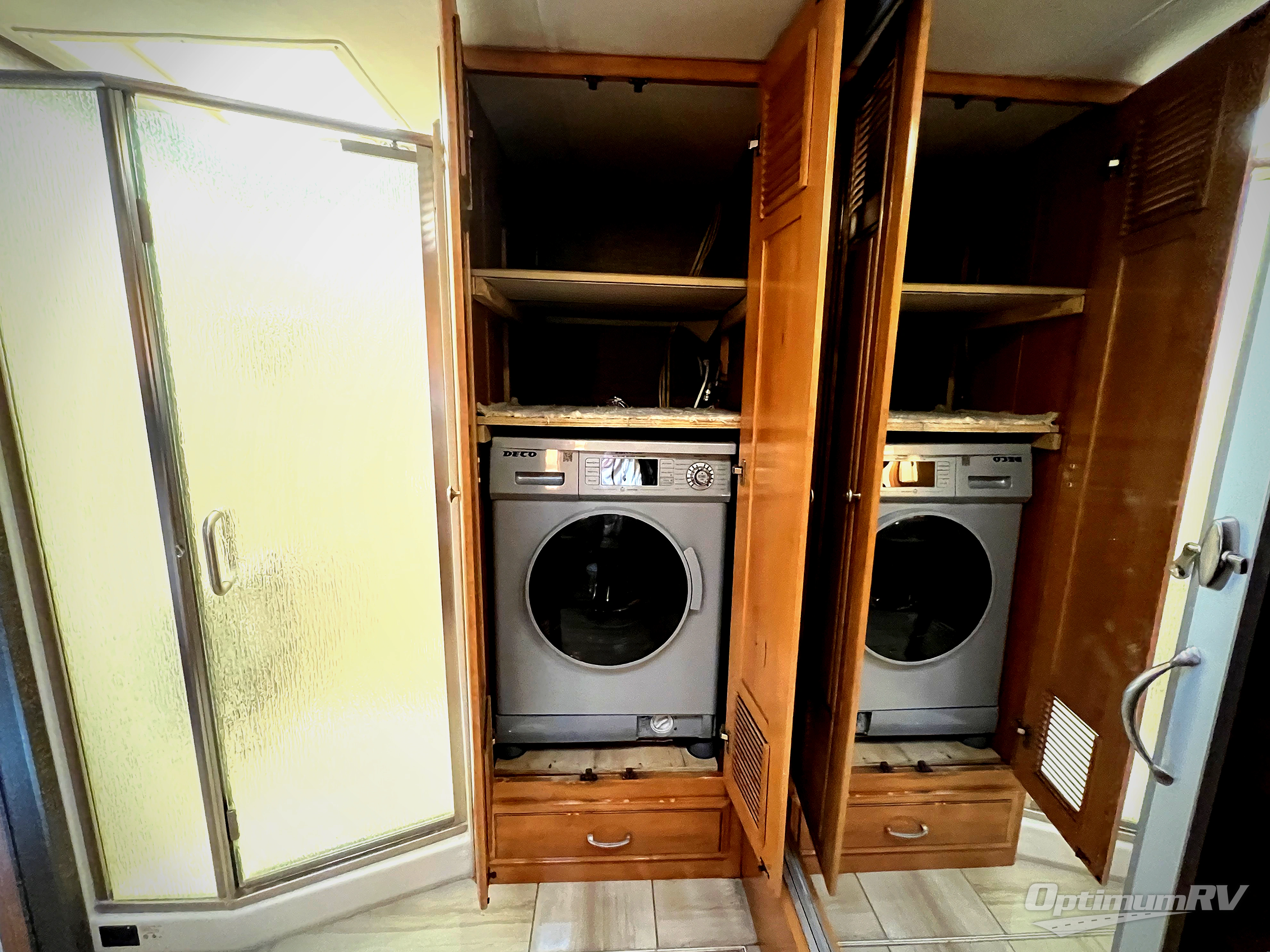 Sliding doors leads you into the rear master bath where you will find a 34" x 34" shower, washer and dryer, and full rear wall wardrobe. The toilet and sink are opposite along the road side and also part of the bedroom slide out.