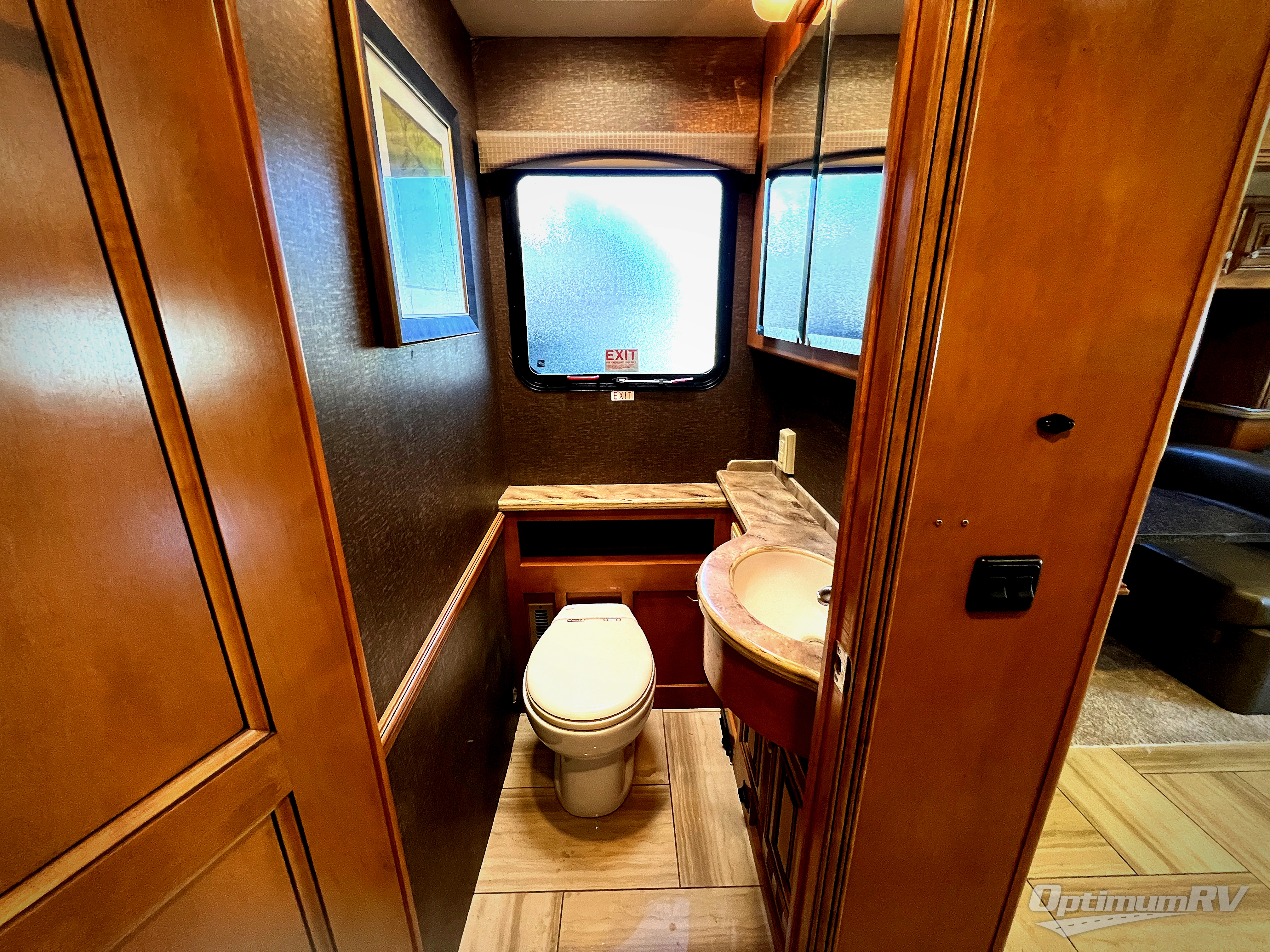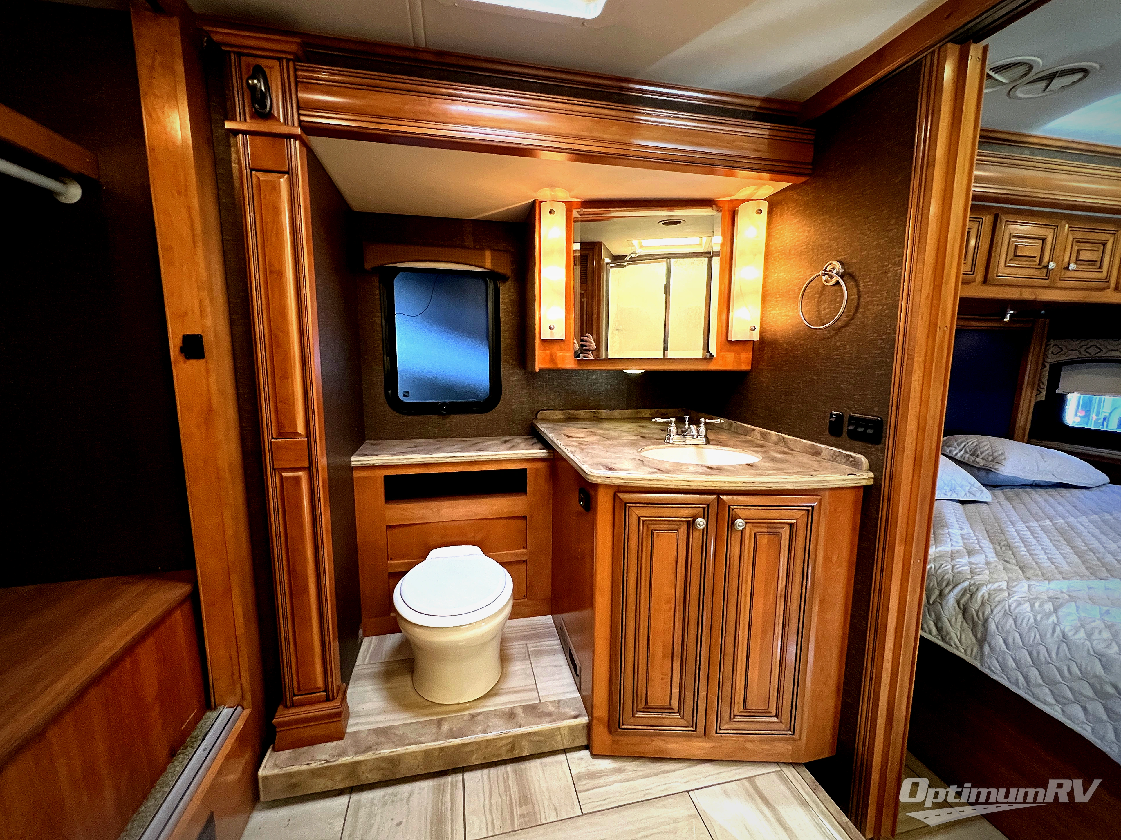 A half bath offers a convenient toilet and vanity with sink in the middle of the coach.