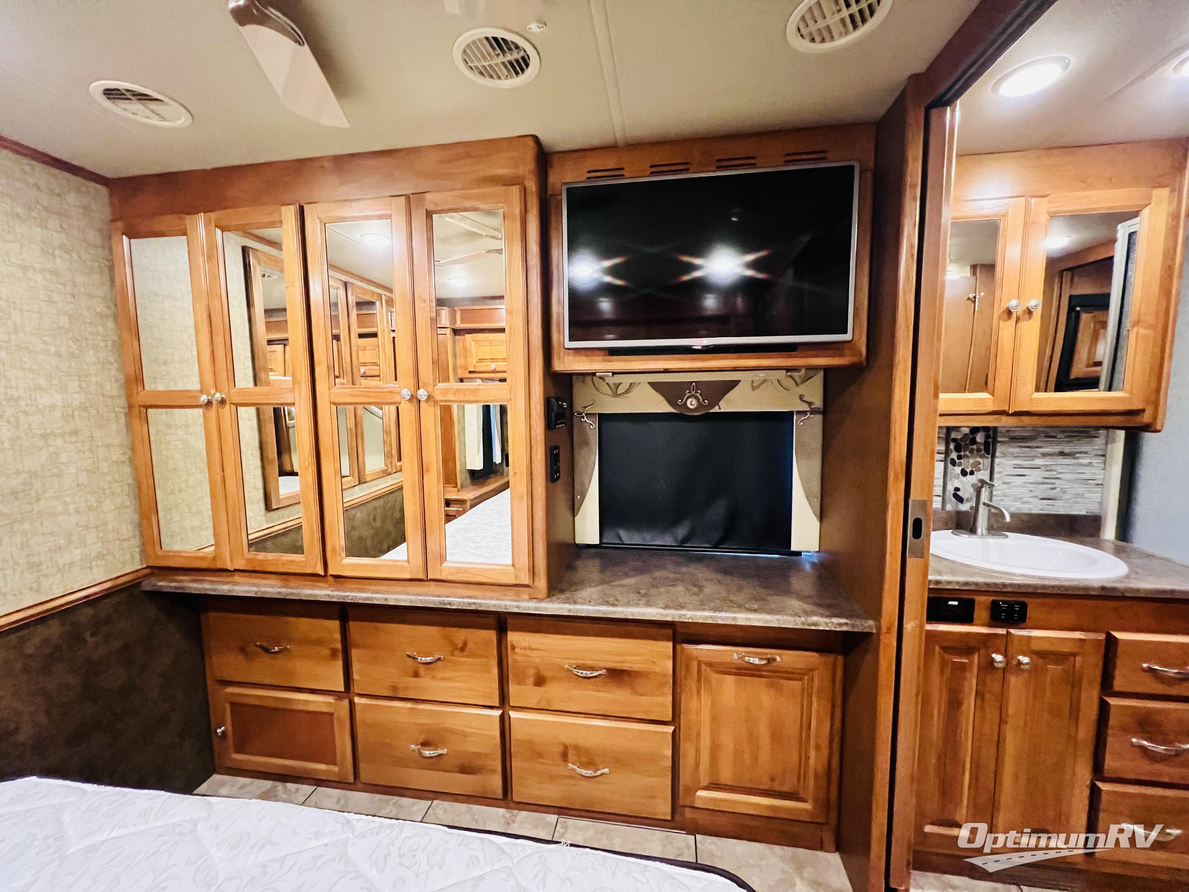 This class A motorhome includes a rear bedroom with a queen bed slide. There are nightstands at each side of the bed and overhead cabinets above. A wardrobe with drawers below and a cabinet with a TV above are on the wall opposite the bed.