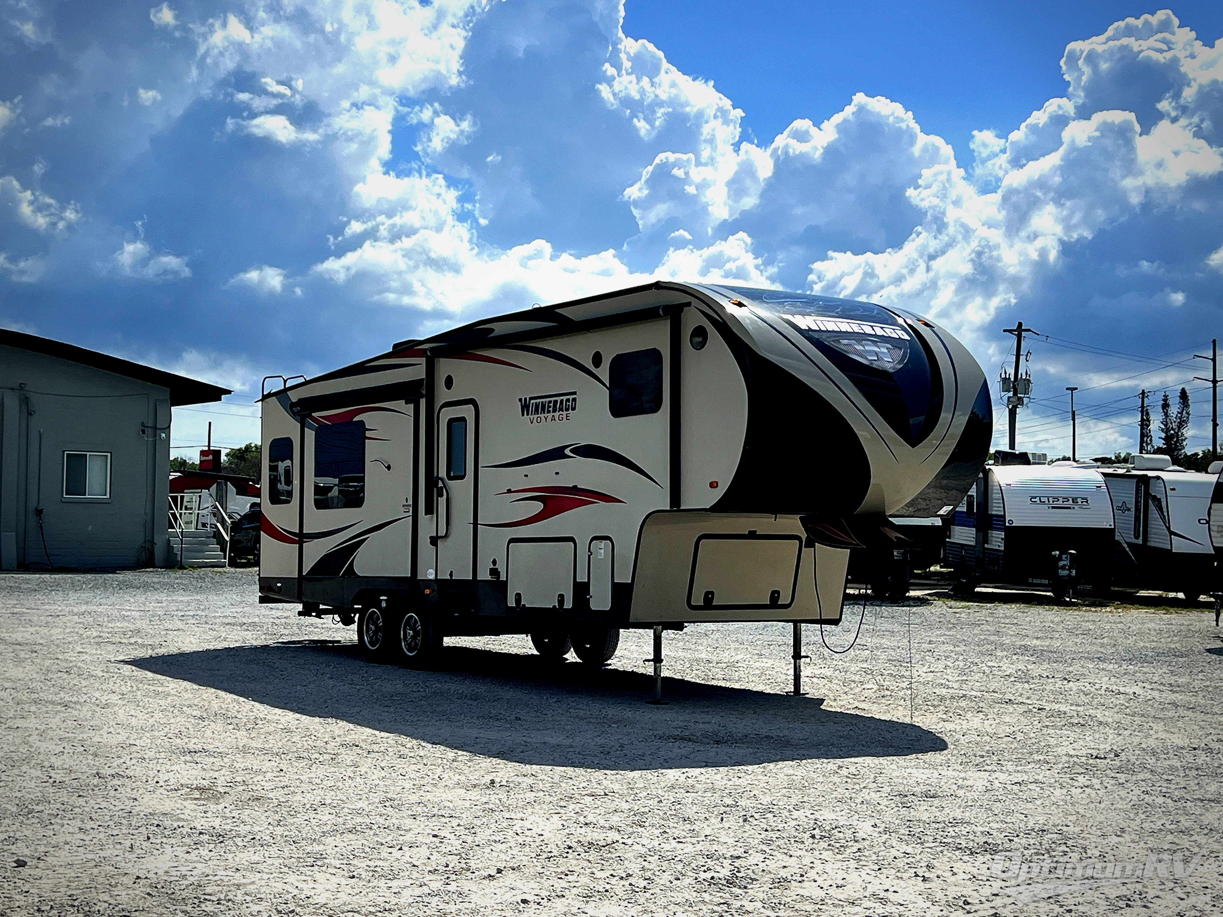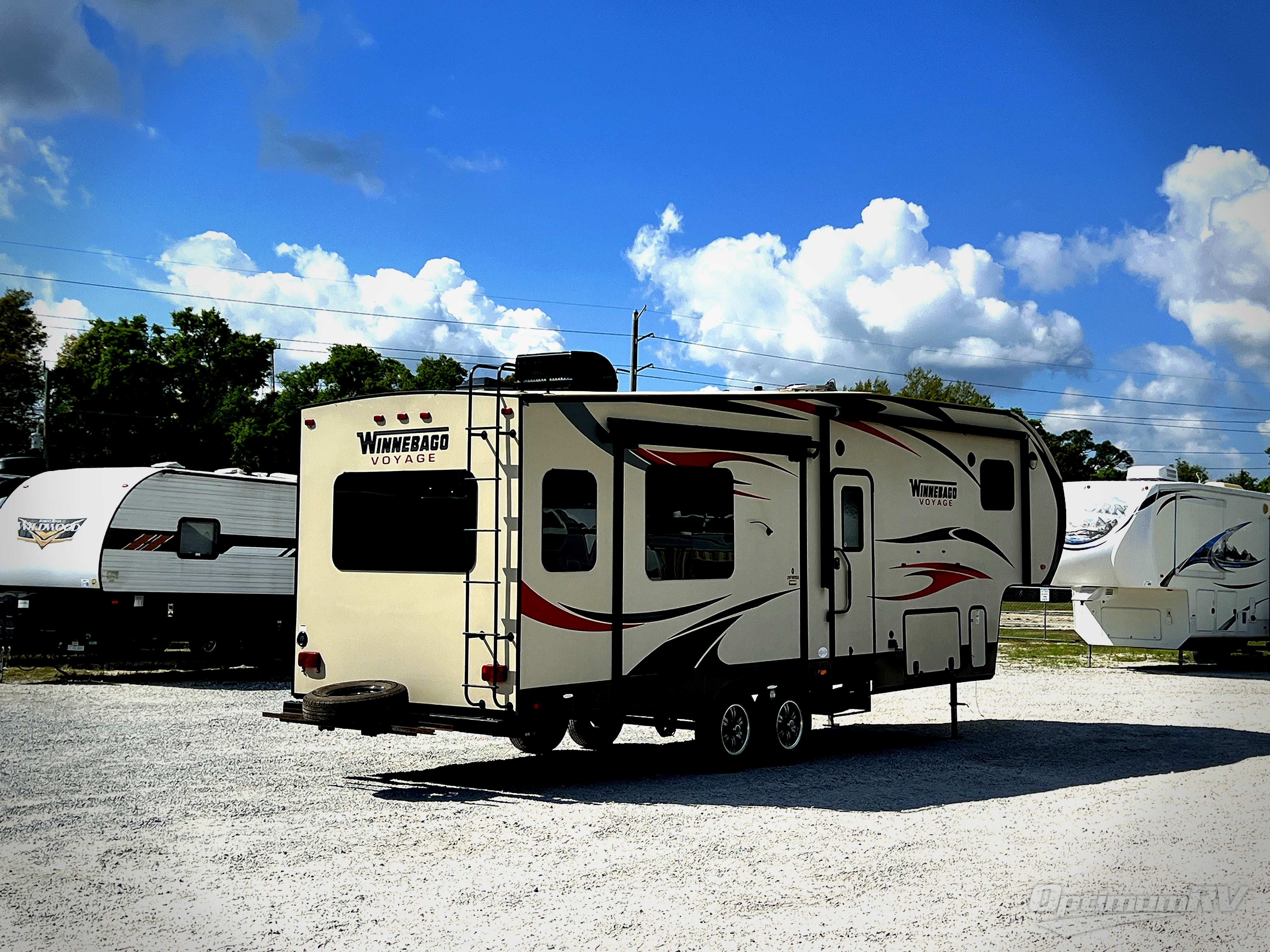 Enter this Voyage fifth wheel model 29FWRSS by Winnebago Industries Towables. Once inside you will notice how spacious it is with dual opposing slides in the main living and kitchen area combined. There is also a third slide option that can be added in the front bedroom if you choose.