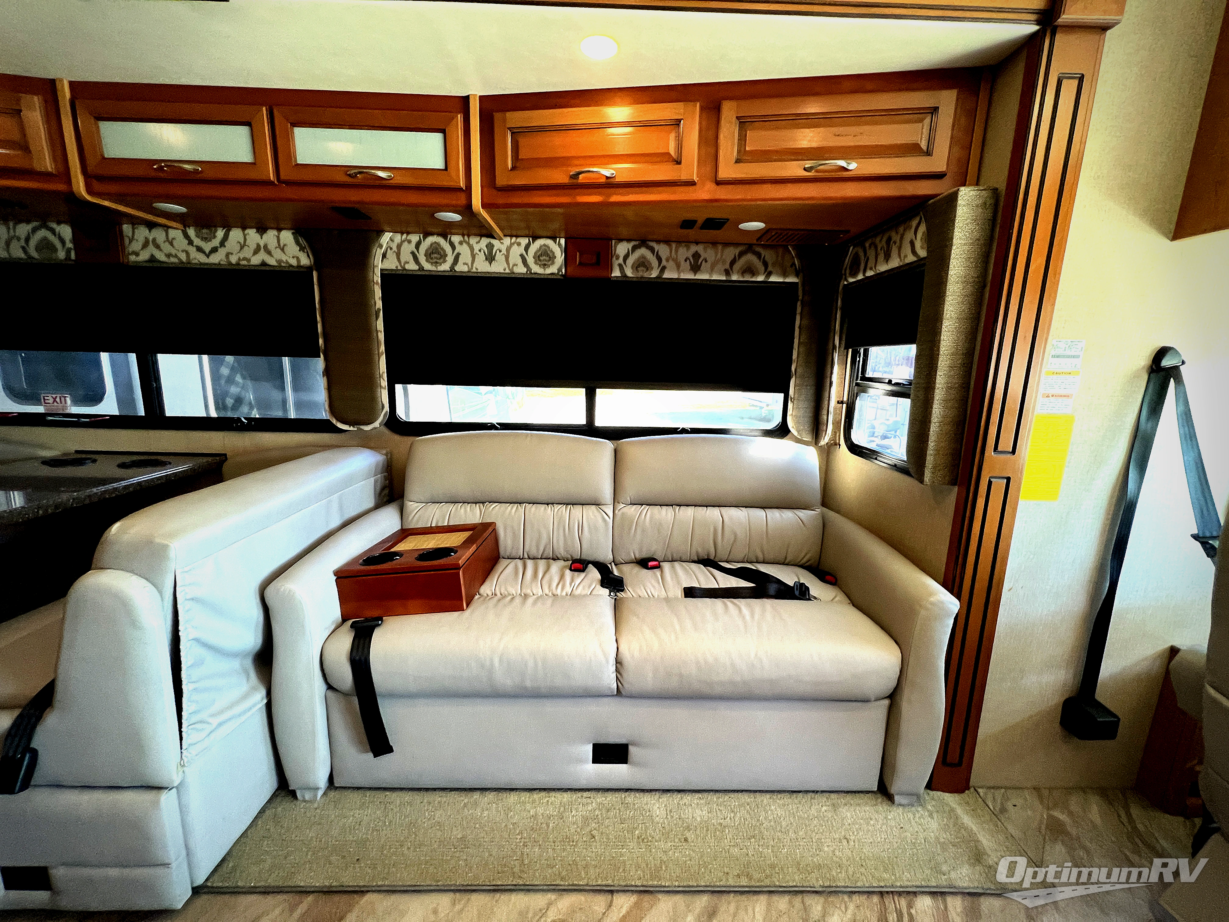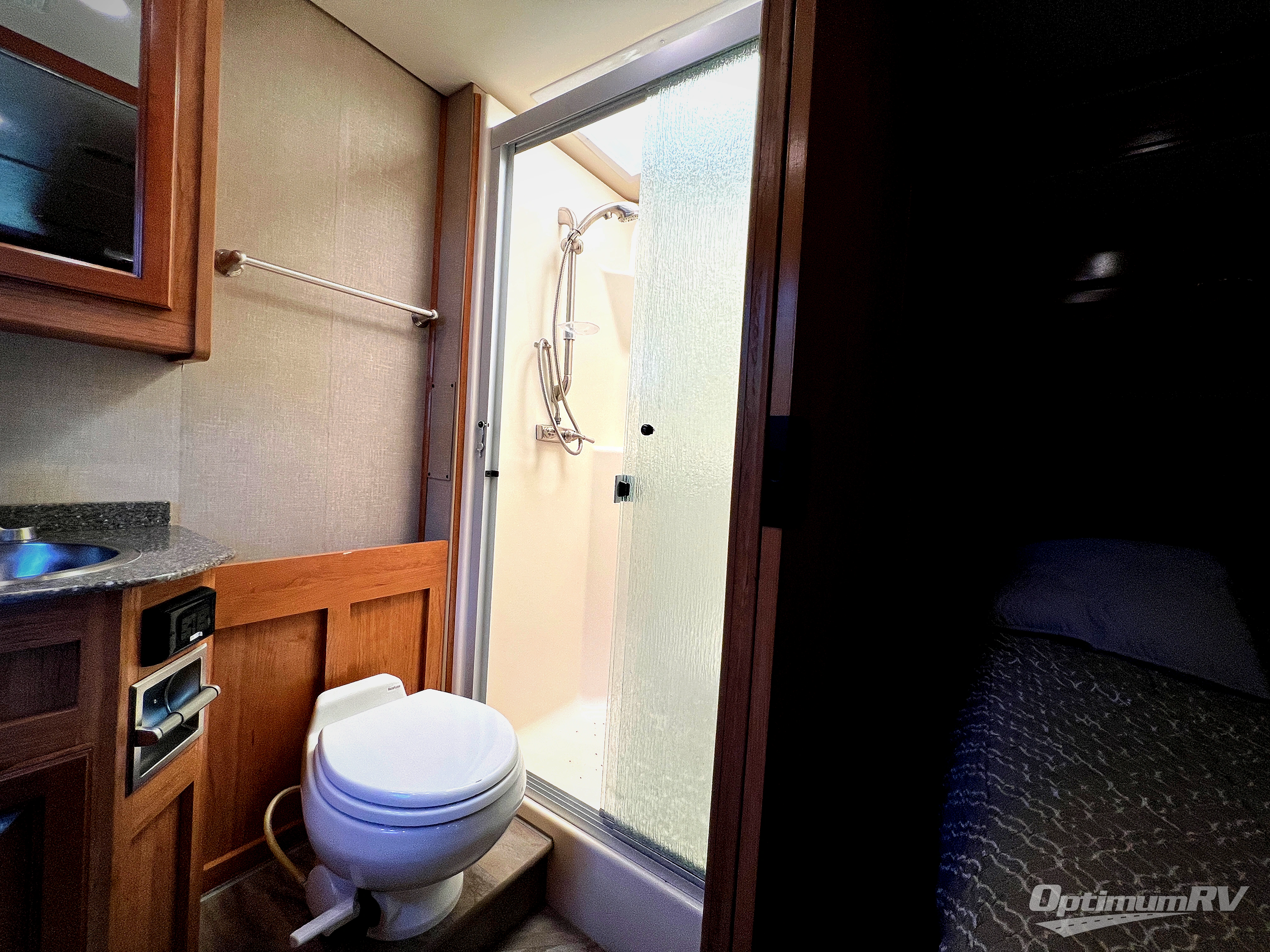 As you enter this motor home, you will find that the kitchen and living areas are spacious with a single slide and very open. The kitchen area has an angled double kitchen sink, three burner range, microwave, refrigerator, and pantry. On the opposite side there is a slide with a sofa sleeper, shelf above the sofa, and a dinette. Adjacent to the slide there is a 40" LED TV.