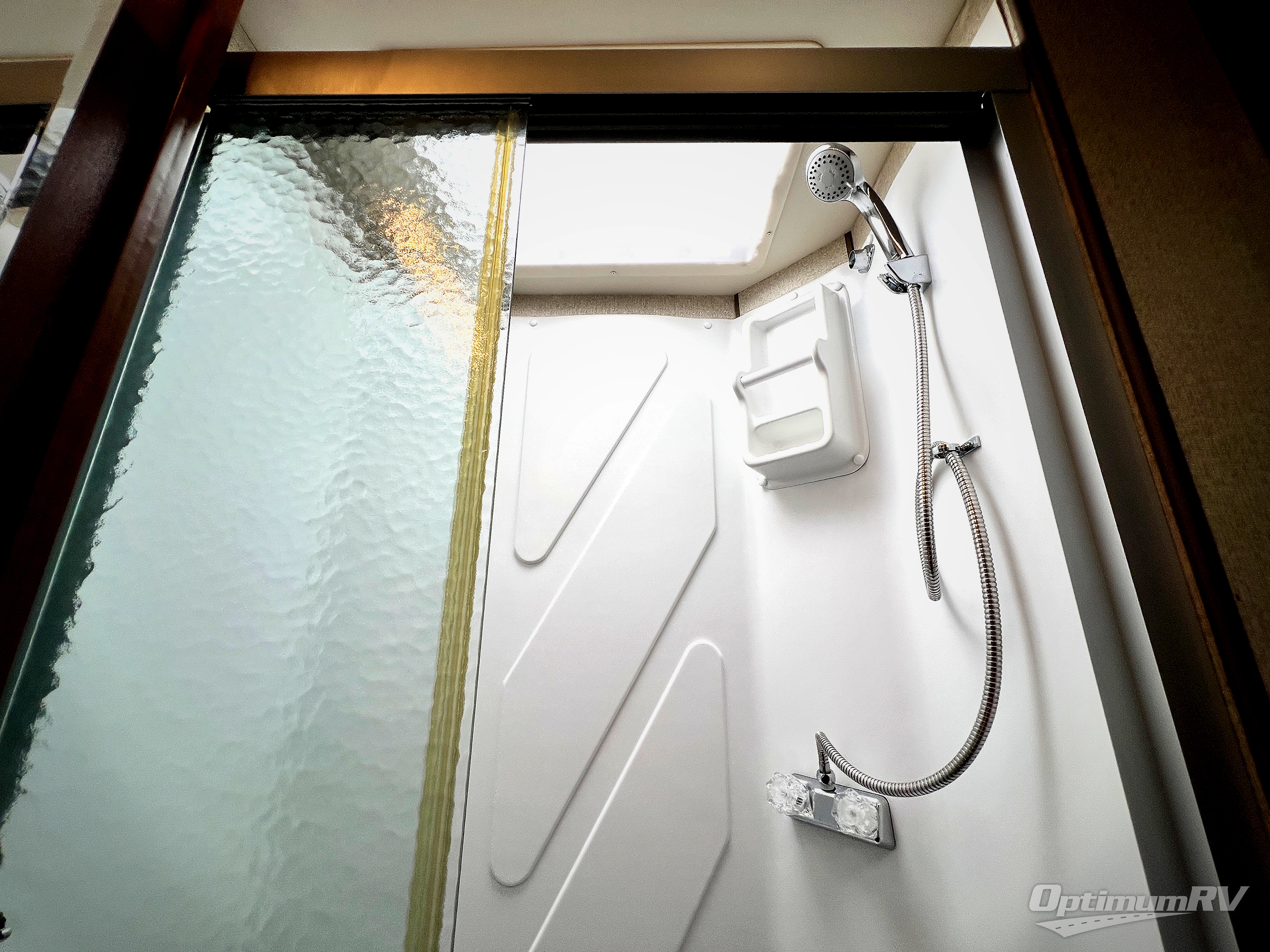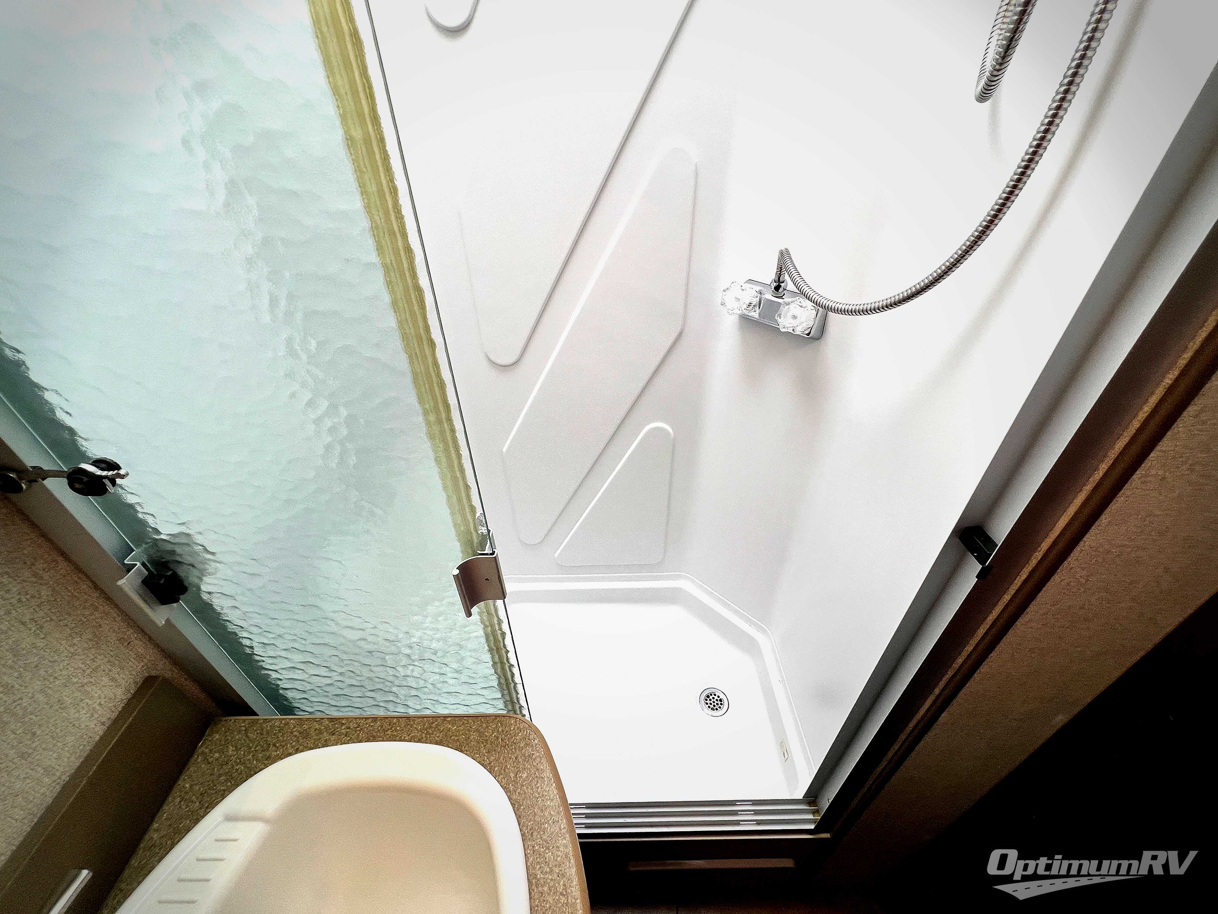 As you enter notice the 32" LED TV above the cab area for enjoyment. Look back to the rear of the coach and see plenty of seating to enjoy all of your meals at including three sets of seat belts on the u-shaped dinette. This slide out also features a refrigerator and wardrobe/pantry.
