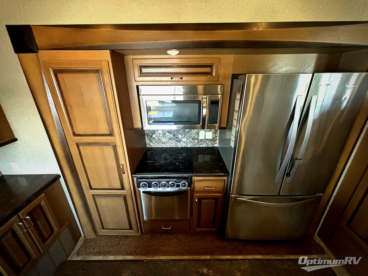 Enter the door furthest to the front and find yourself in a grand kitchen. This space offers a slide out dinette to the left of the door, and opposite a slide out refrigerator, three burner range with overhead microwave oven, and pantry. There is added counter space along the interior wall, and a center island offers even more counter space, plus it is the location of a double kitchen sink. You will also find a half wall filled with more storage space that divides the kitchen from the front living room area up a couple of steps.