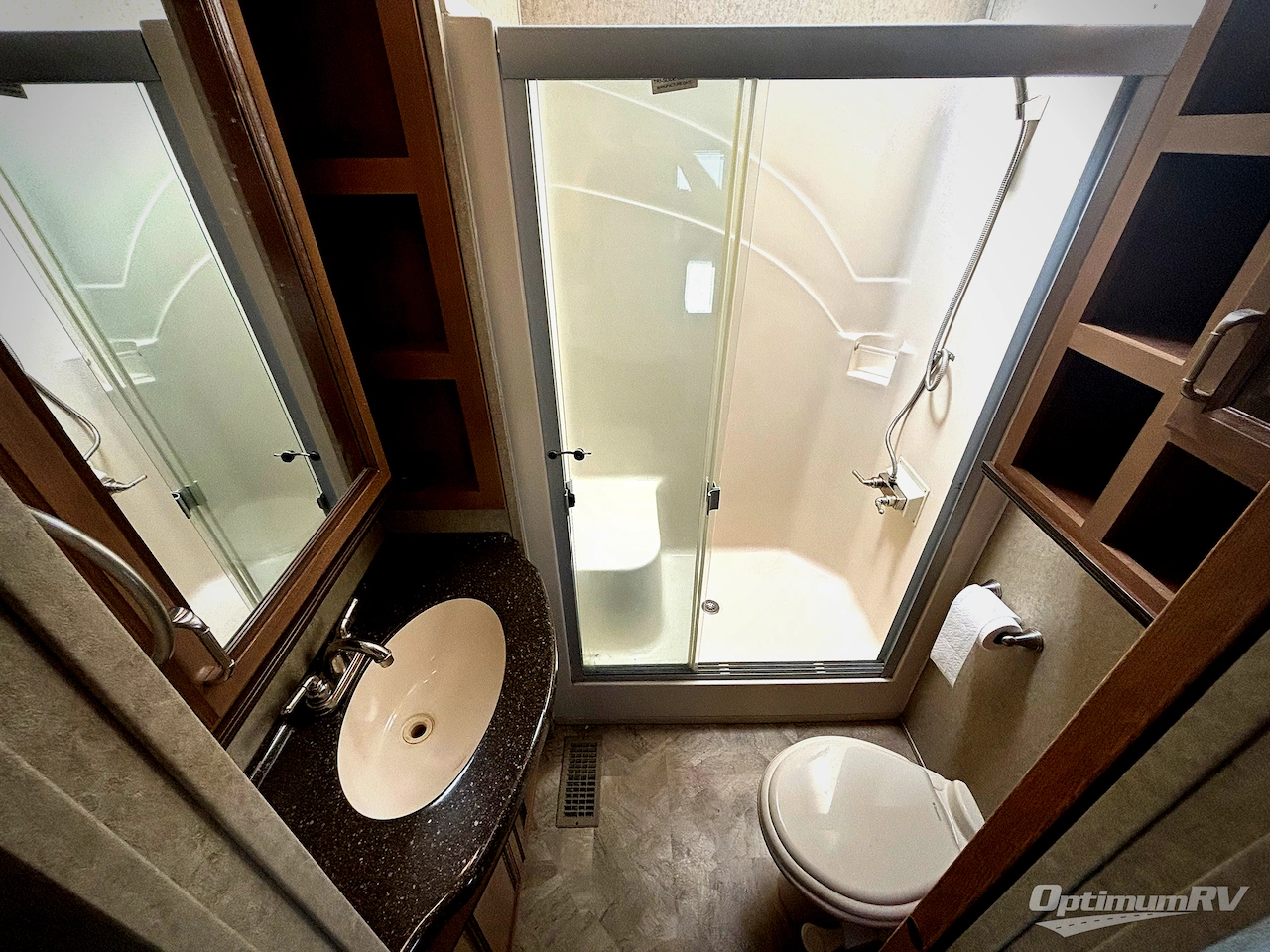 Back through the kitchen to the rear of this Hathaway Edition Cedar Creek model you will find a complete bath along the road side. Here you can enjoy a shower with seat, a vanity with sink including overhead medicine cabinet, and toilet. There is also a convenient second entry door opposite the bathroom entry which makes it super handy when spending time outside.