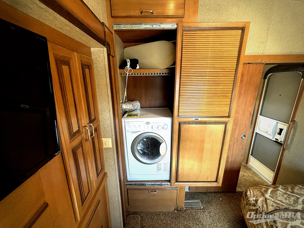 A sliding door at the end of the hall takes you into the rear master bedroom where again you will find a spacious room thanks to dual opposing slide. Along the curb side a slide out queen or king bed option, bedside shelves, and an overhead storage cabinet for your things. Opposite enjoy slide out wardrobes with a TV in the center, and a space for a washer/dryer in the corner along the outer bathroom wall, plus so much more!
