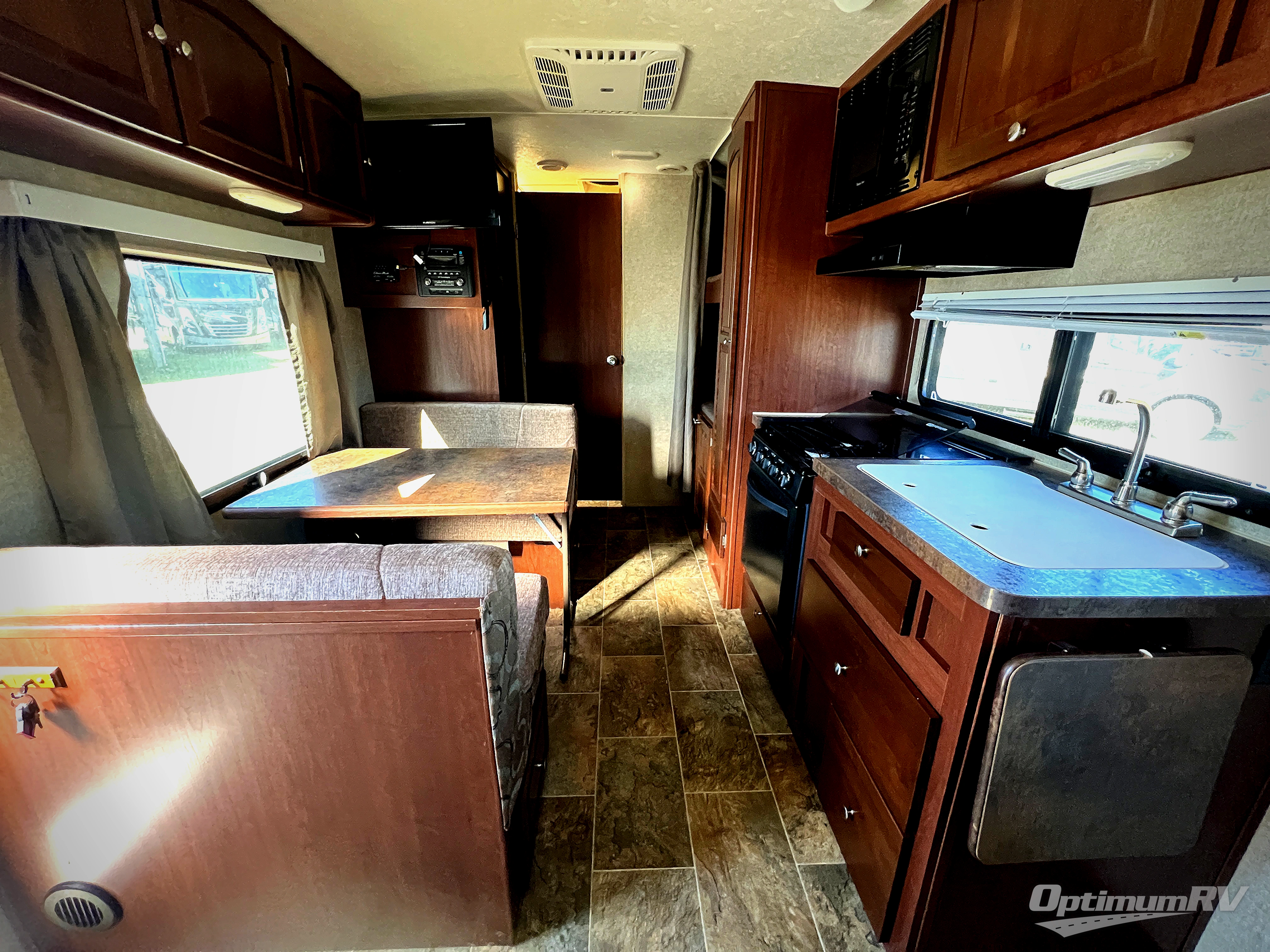 As you enter the travel trailer, to the left is a dinette with an entertainment center above. Next to the dinette you will find a refrigerator. On the other side of the travel trailer there is a three burner range, microwave, double kitchen sink, and counter extension.