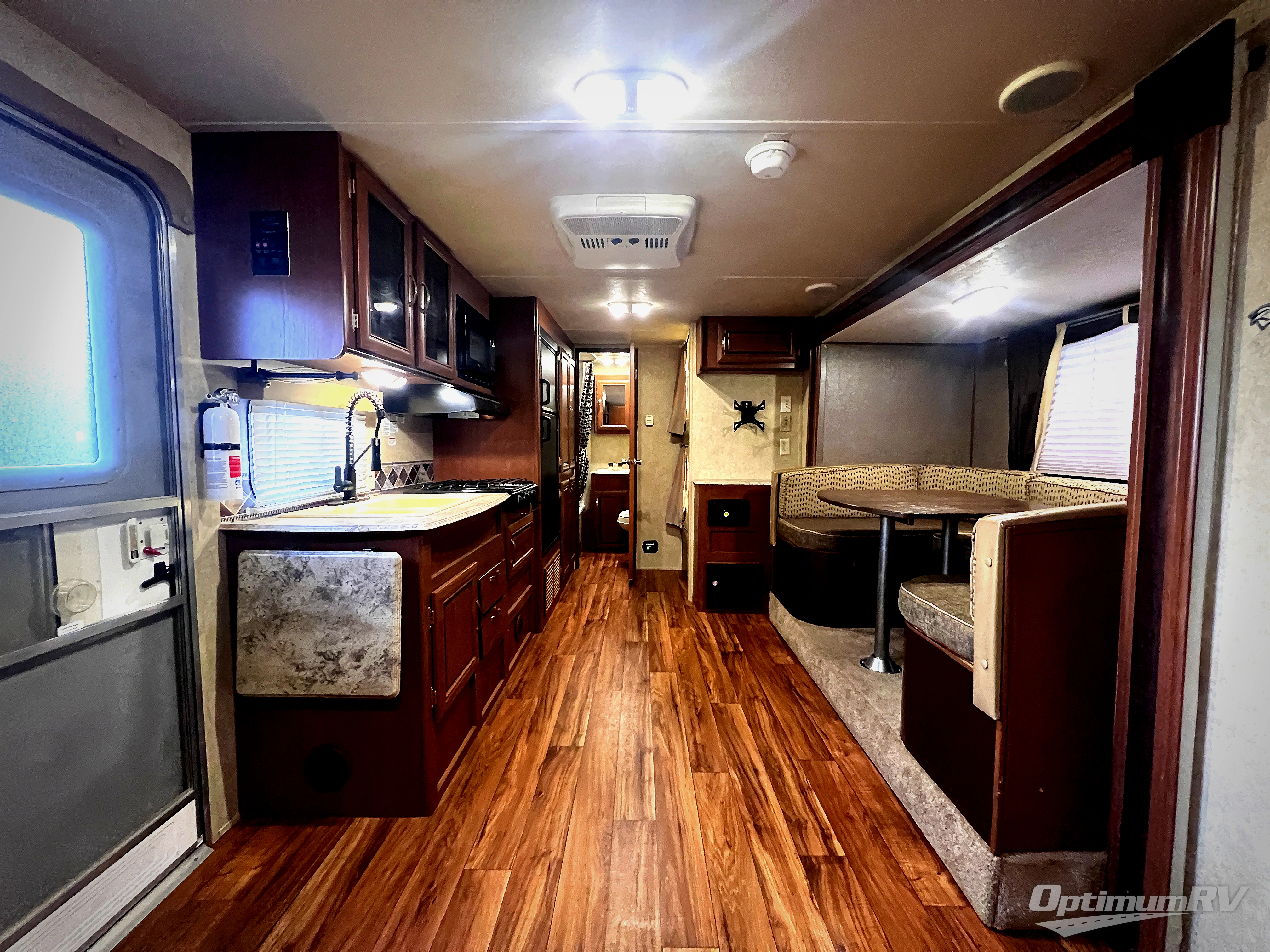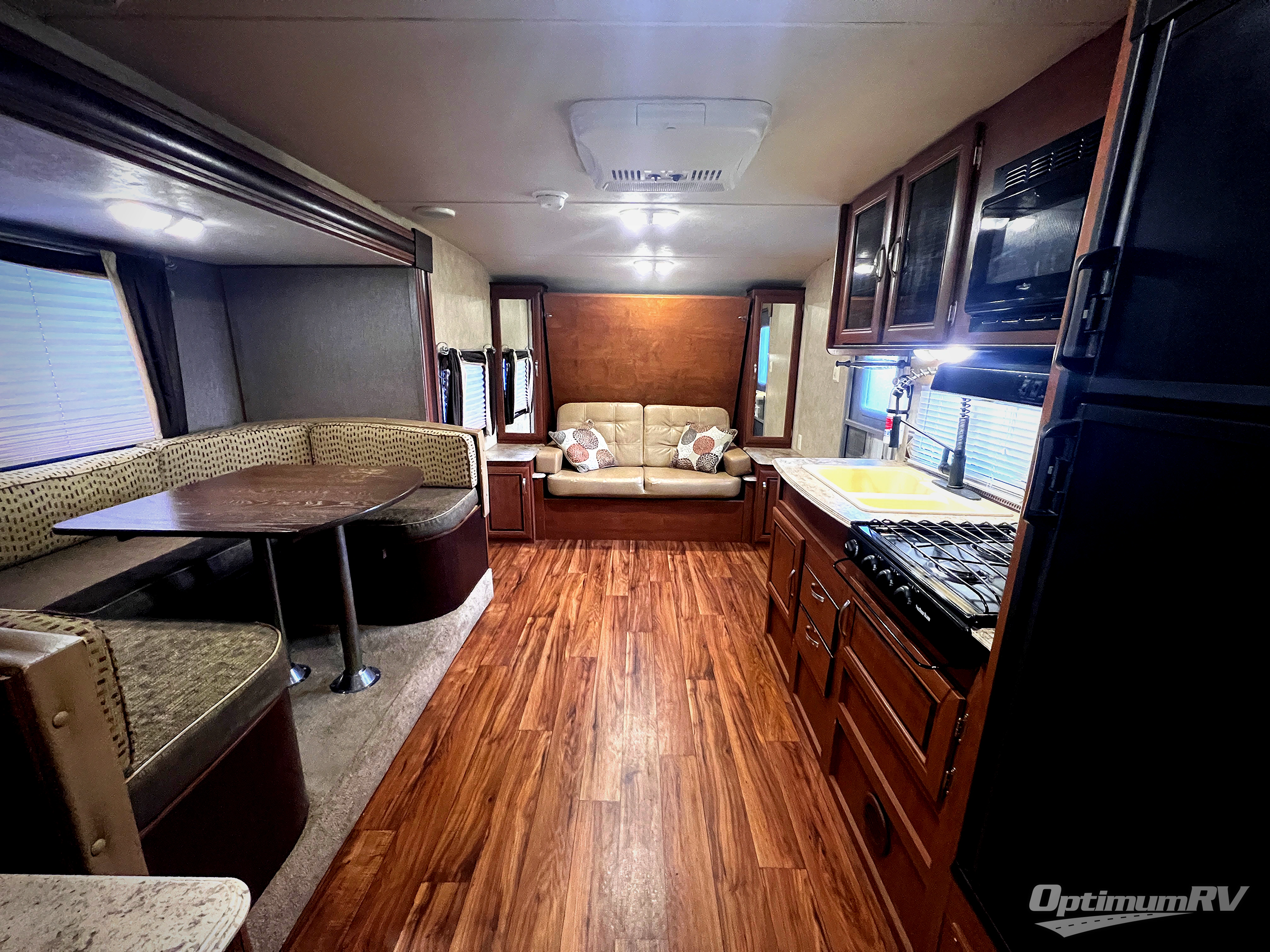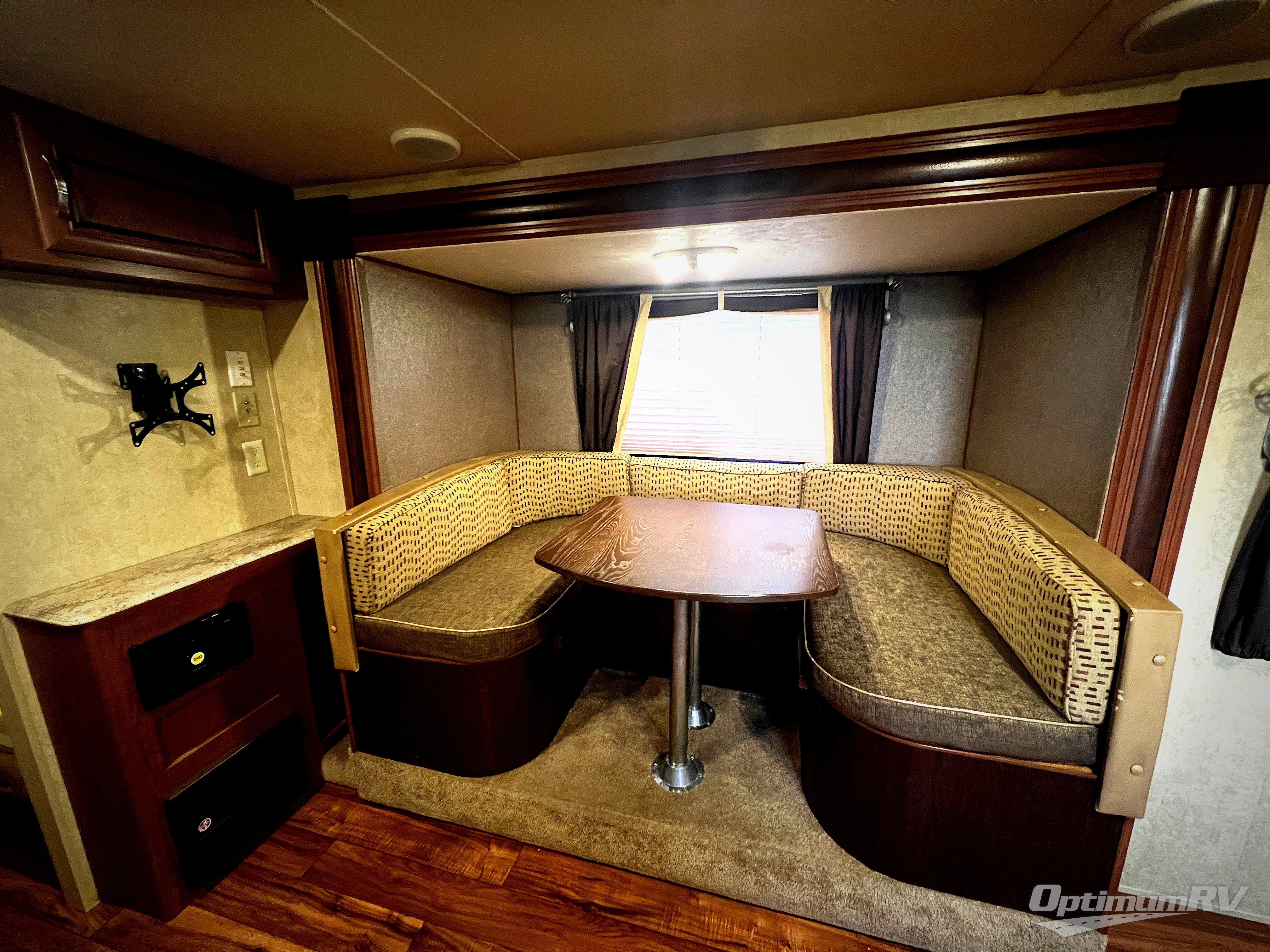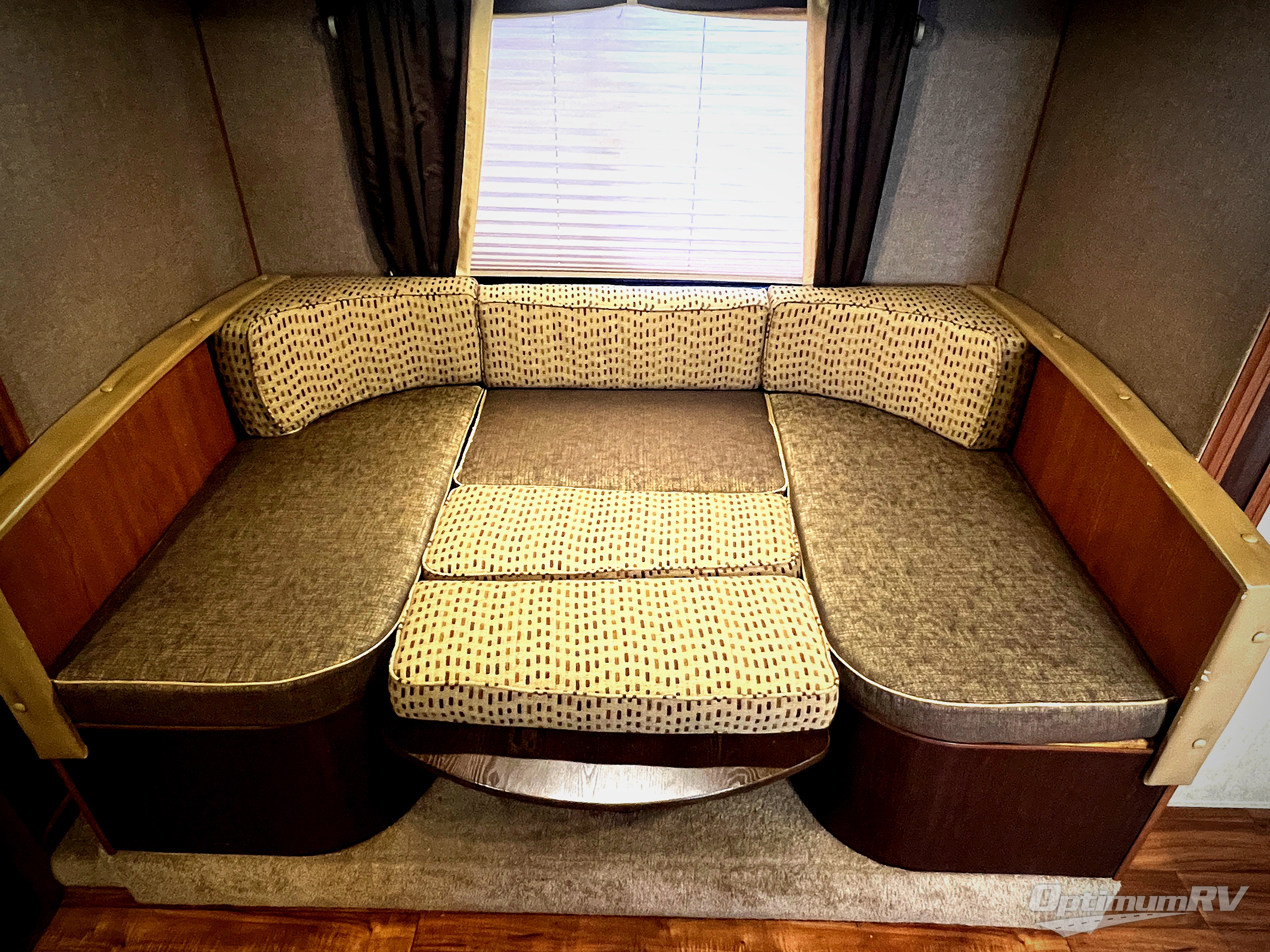 Step inside model 230BHXL and notice how open it is with the slide out u-shaped dinette fully extended opposite the door. There is a nearby entertainment center for viewing.