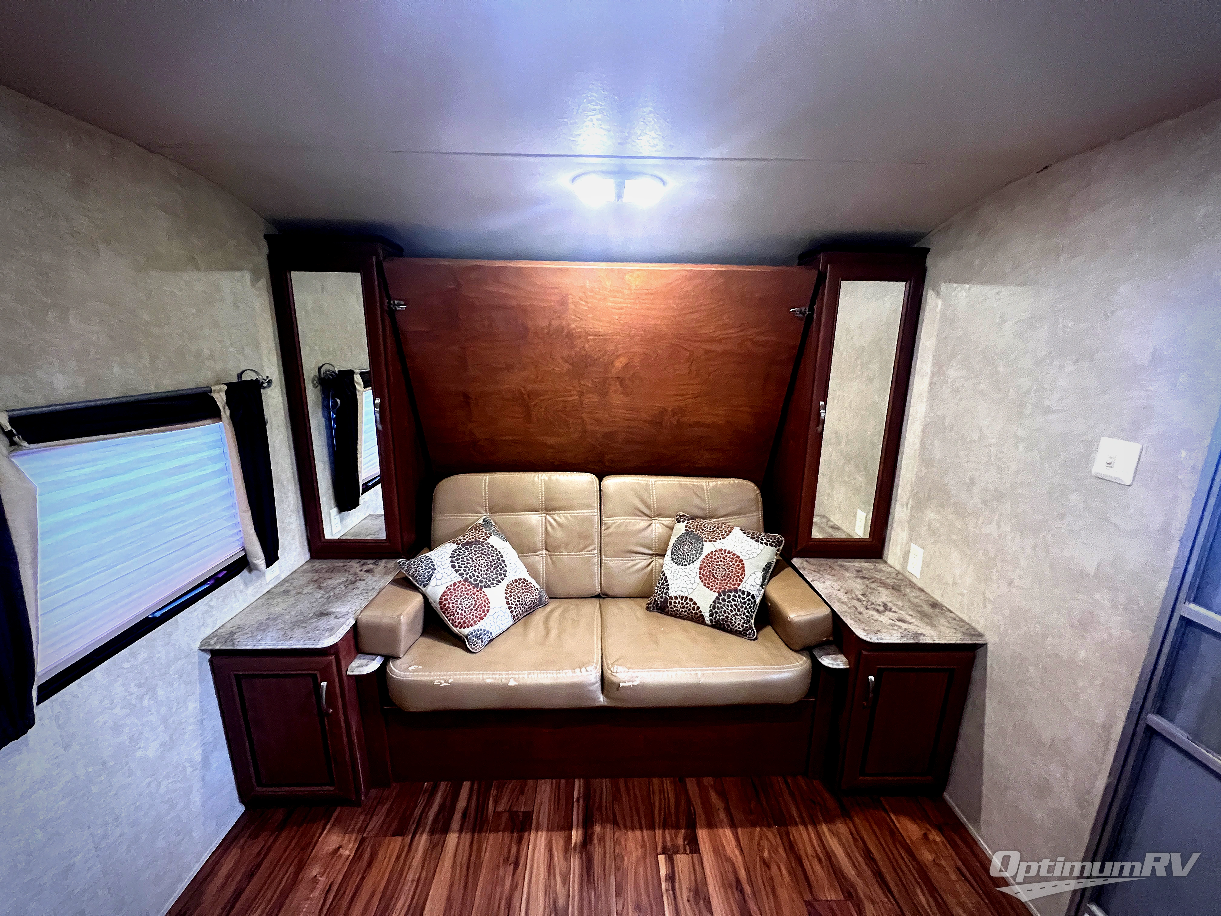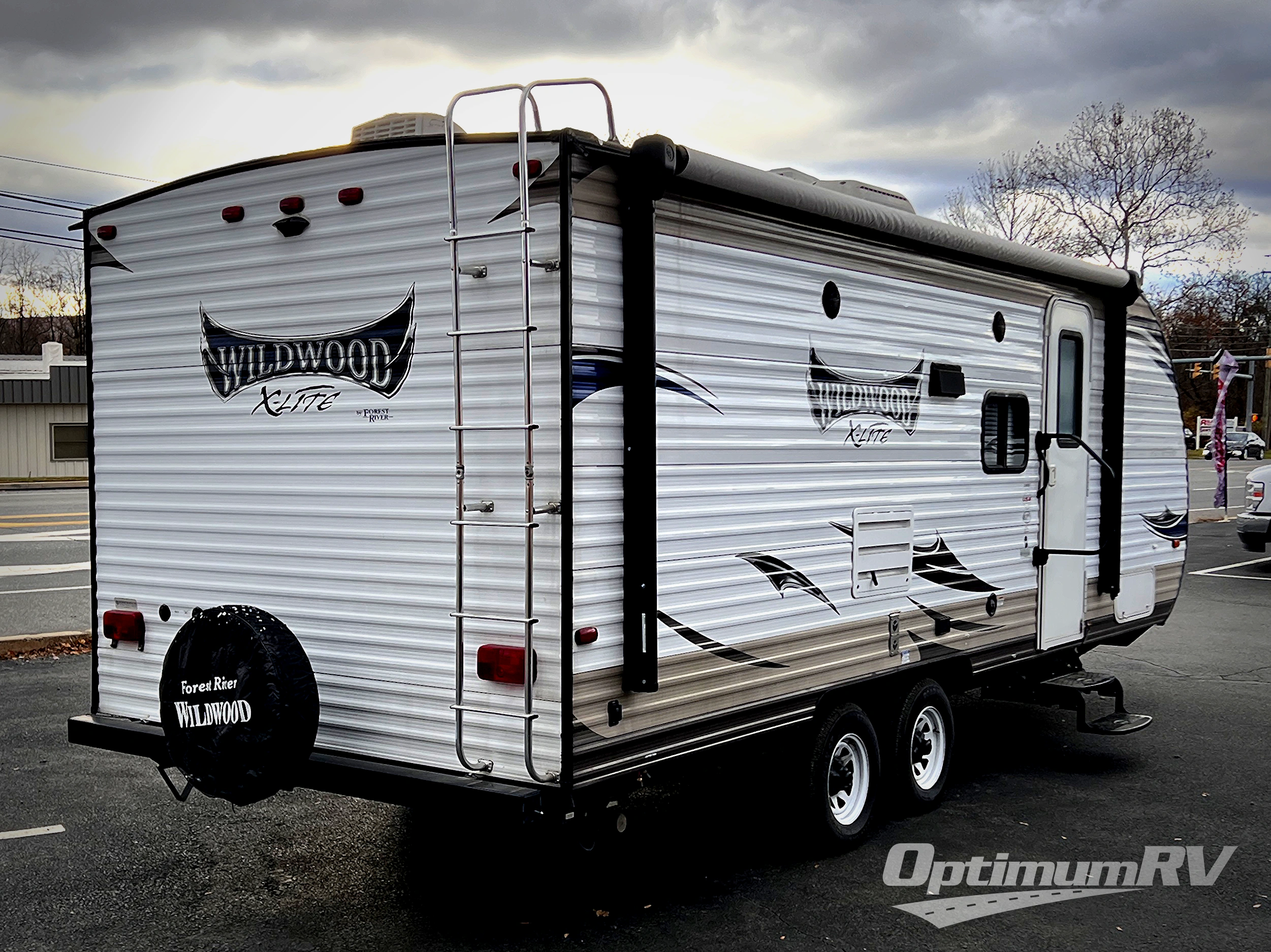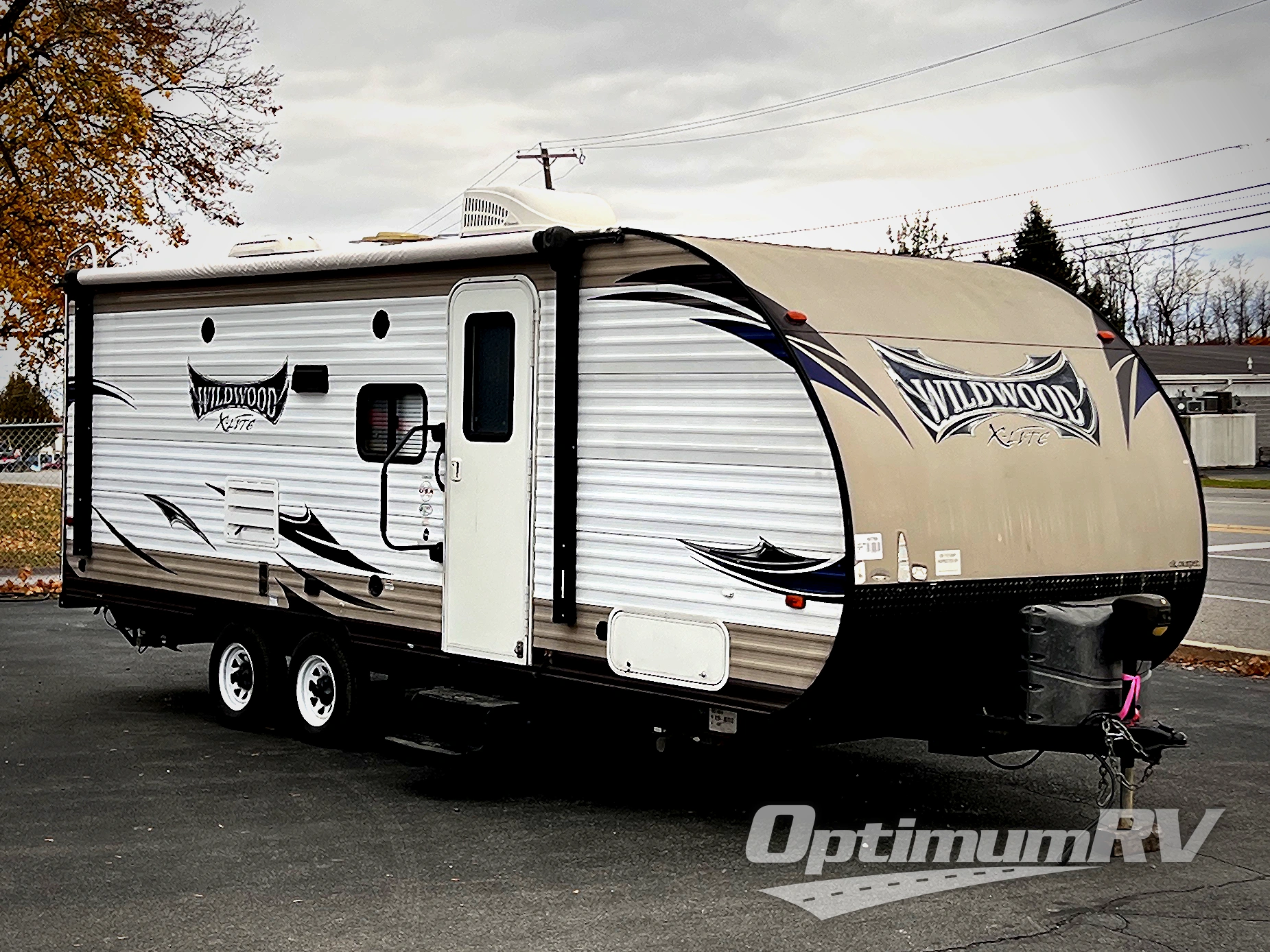 This Forest River Wildwood X-Lite travel trailer features a queen Murphy bed, a set of bunks, and a single slide out for added space inside.