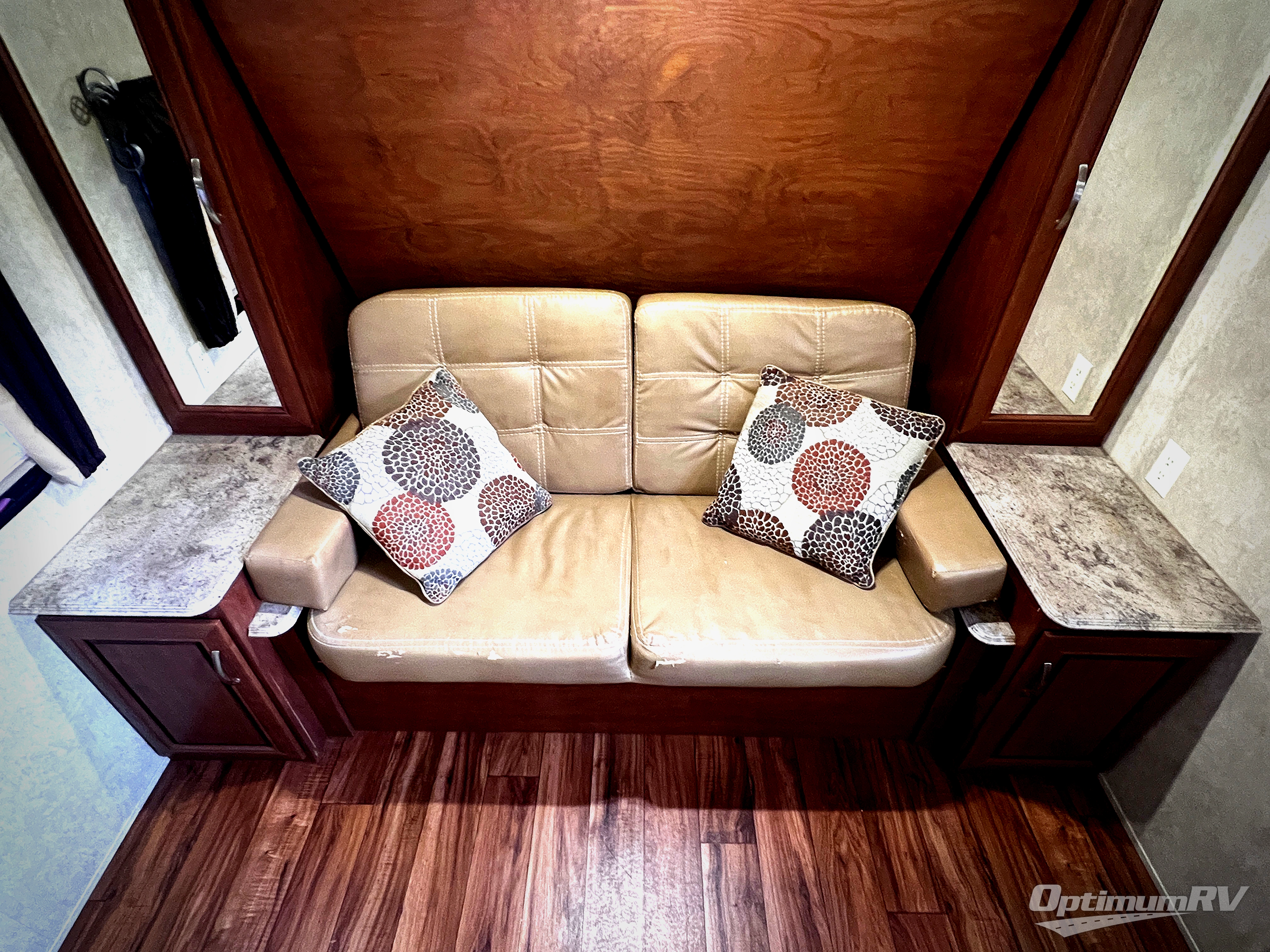 Up front to the right of the entrance is a dual living space with queen Murphy bed at night including wardrobes for storage, and a 56" sofa with two end tables during the daytime hours.