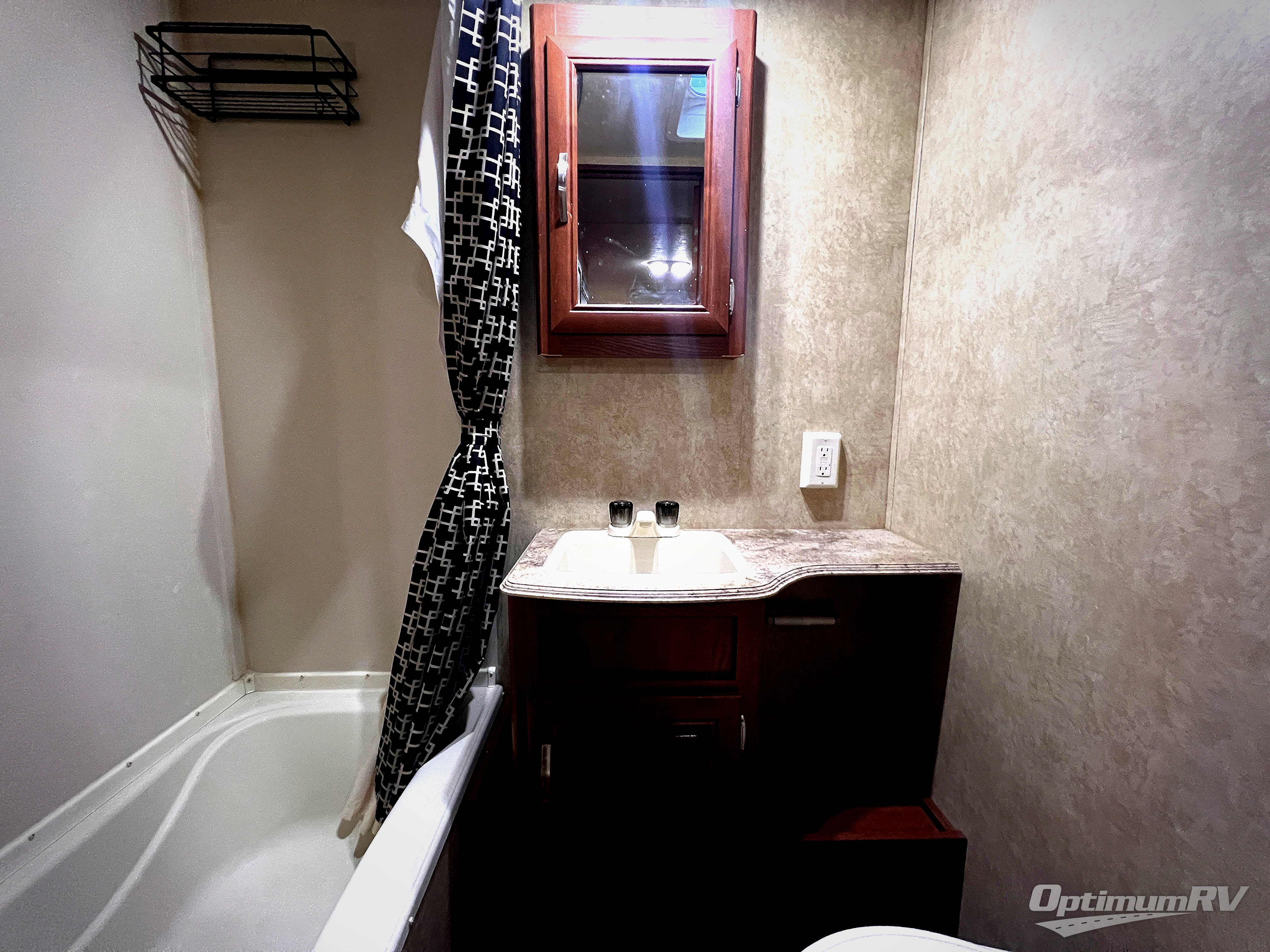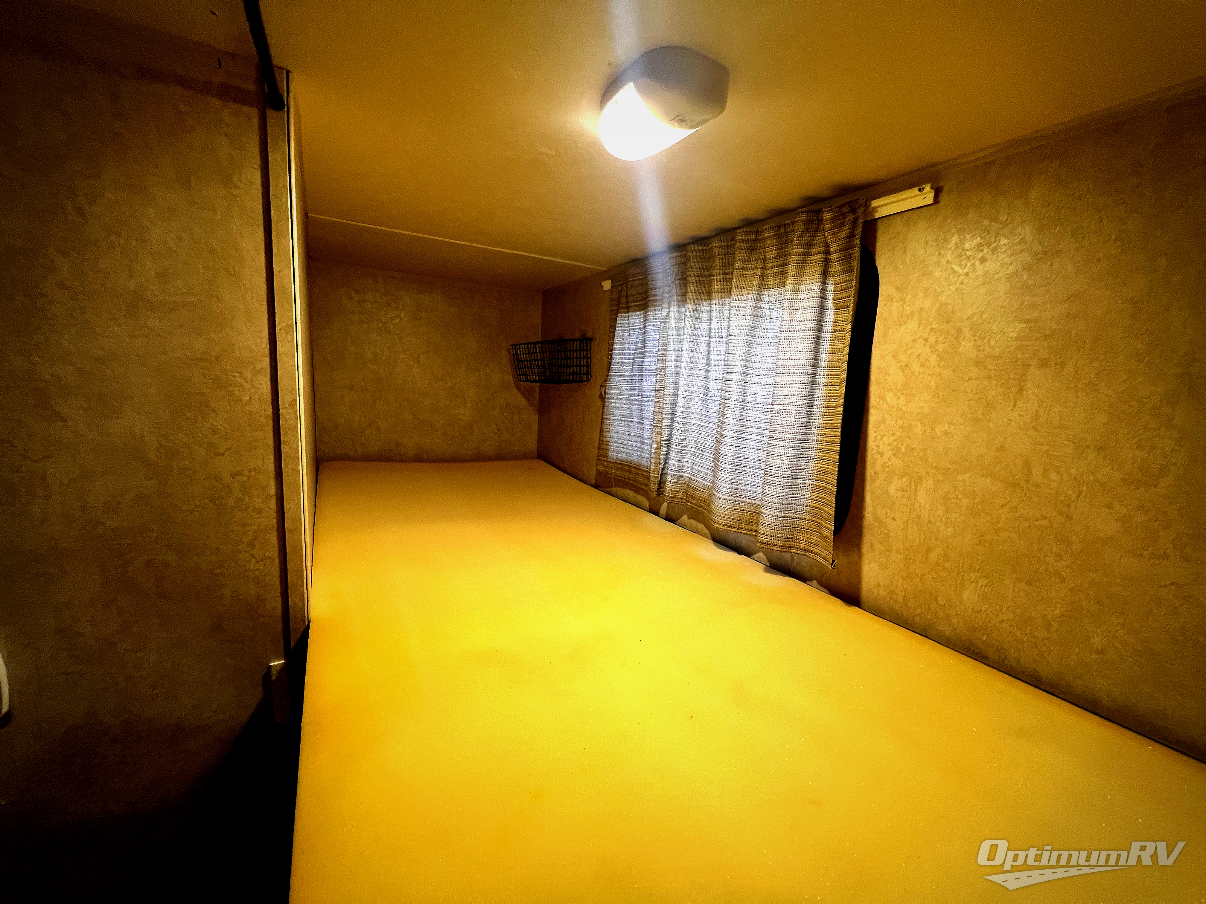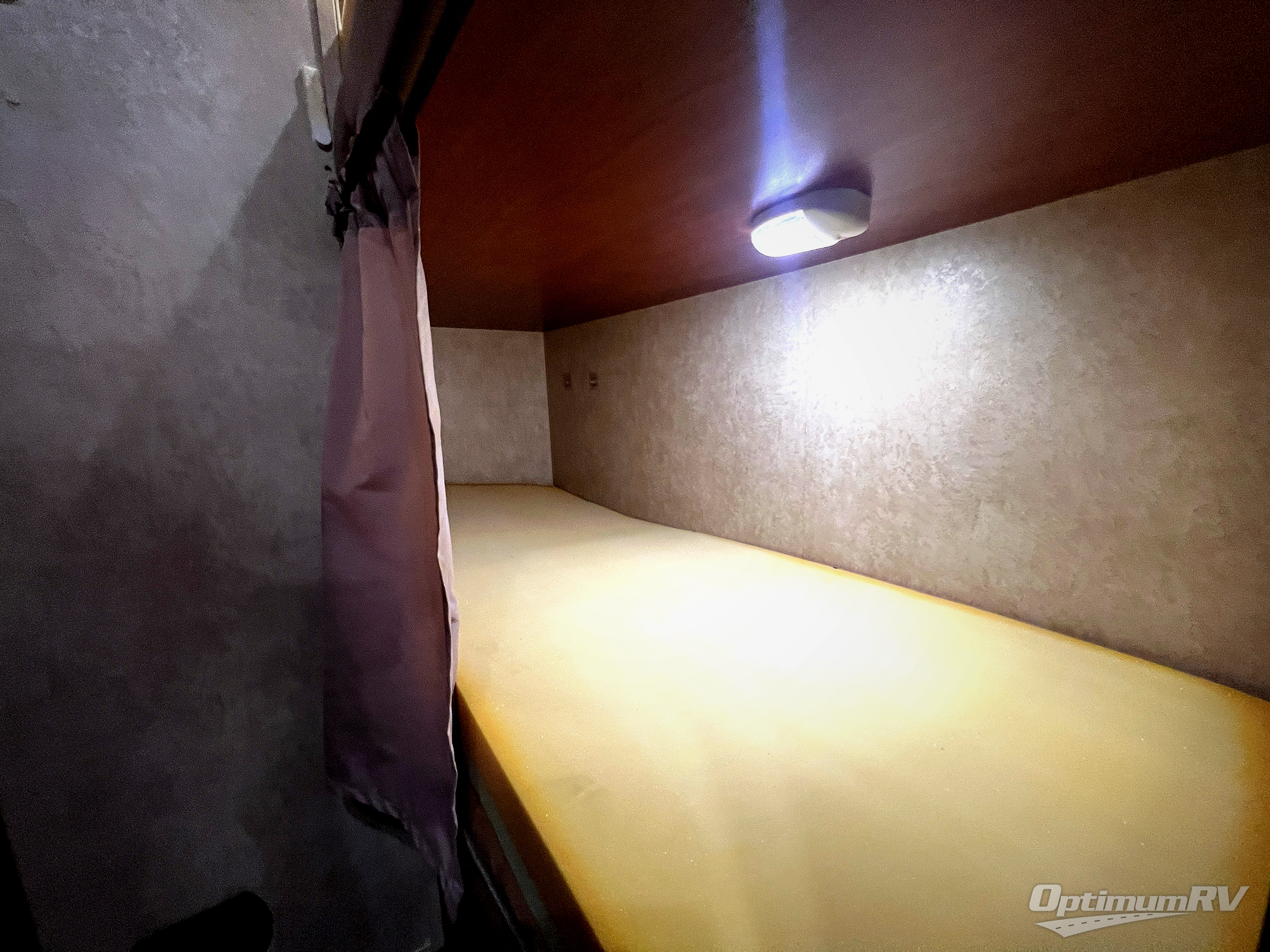 The rear corner offers a set of bunks that the kids will certainly enjoy, plus the convenient bathroom right next door that features a tub/shower, toilet, and vanity with sink. There is also a wardrobe for storage just outside the bathroom door.