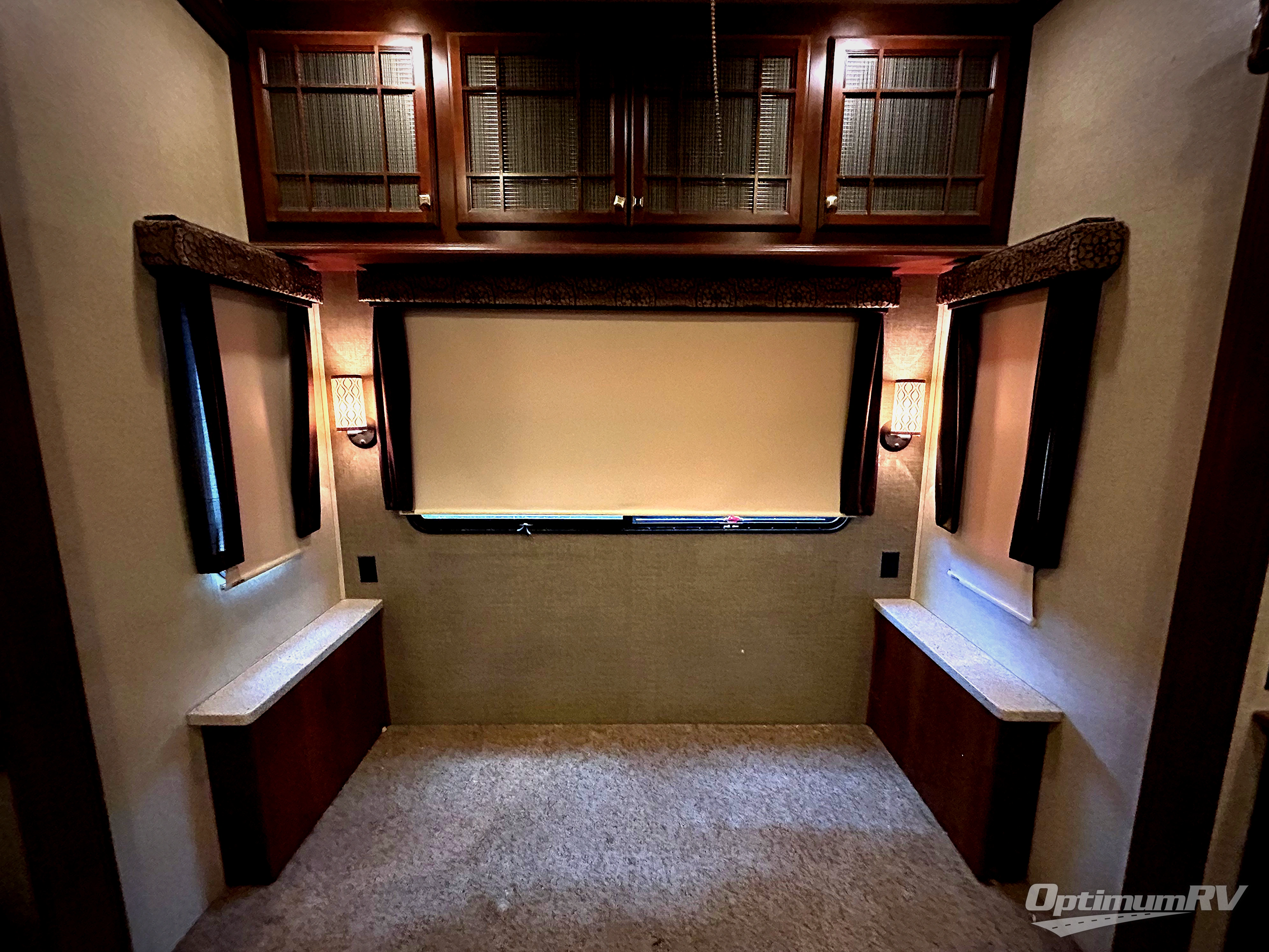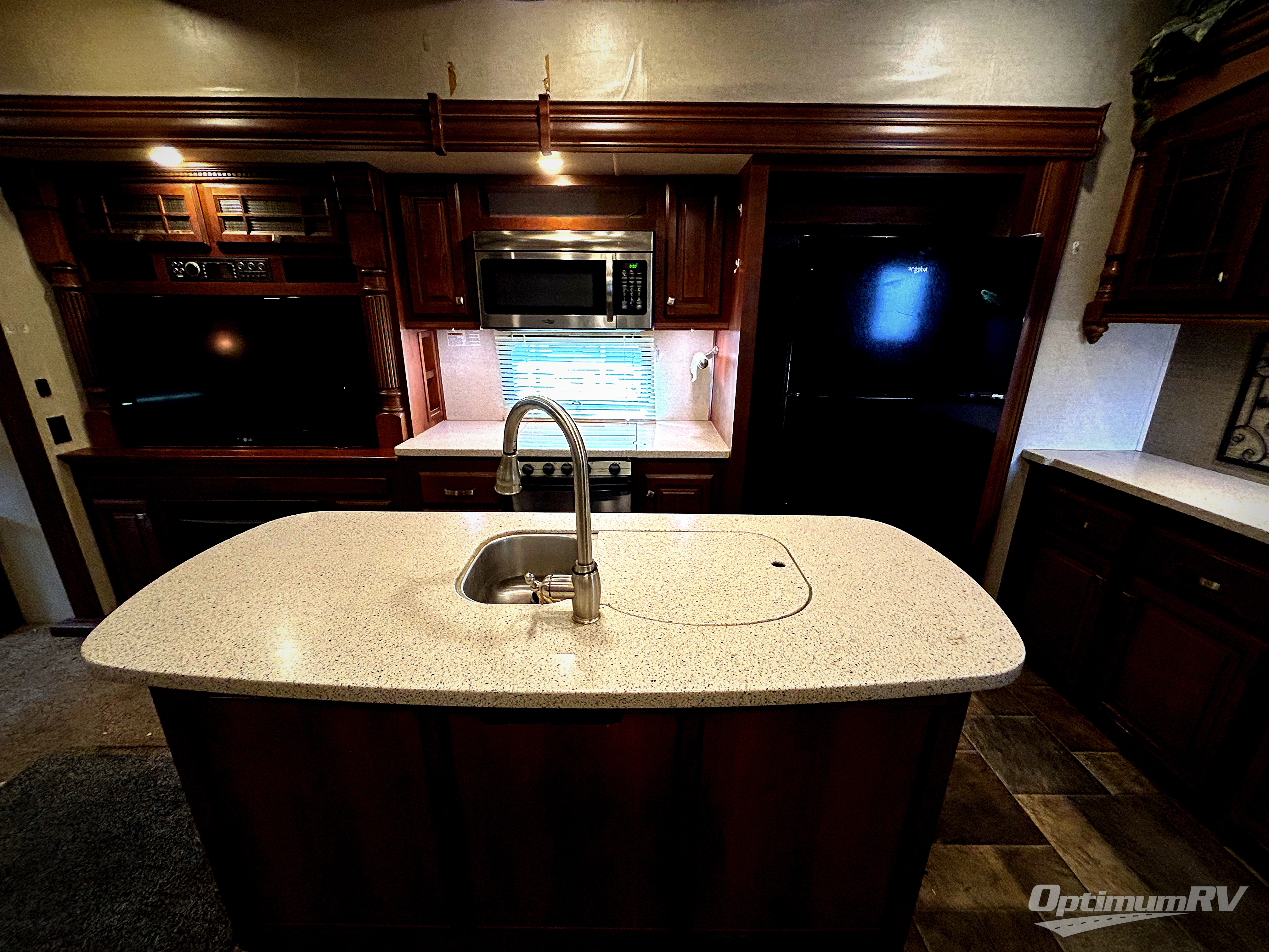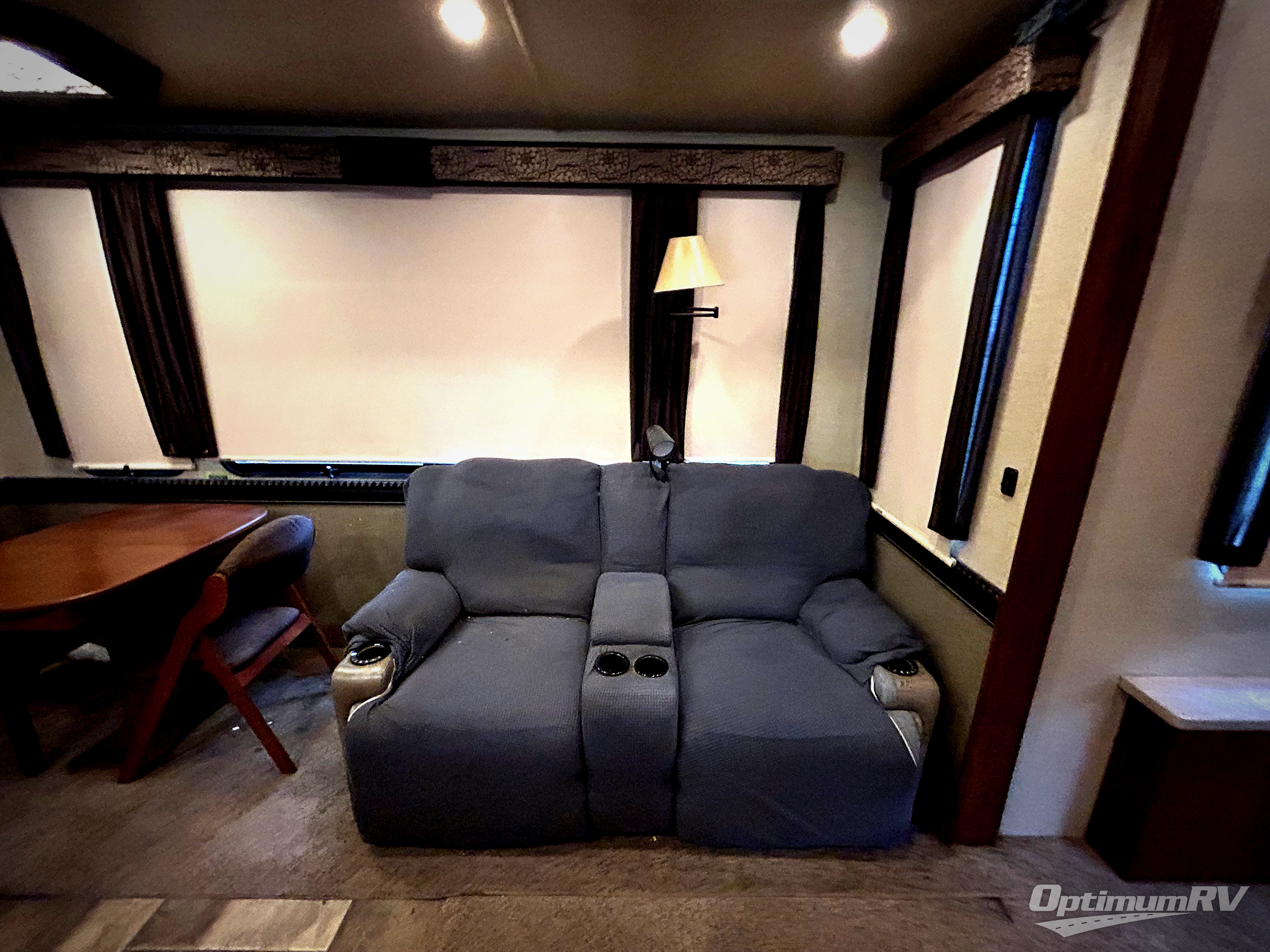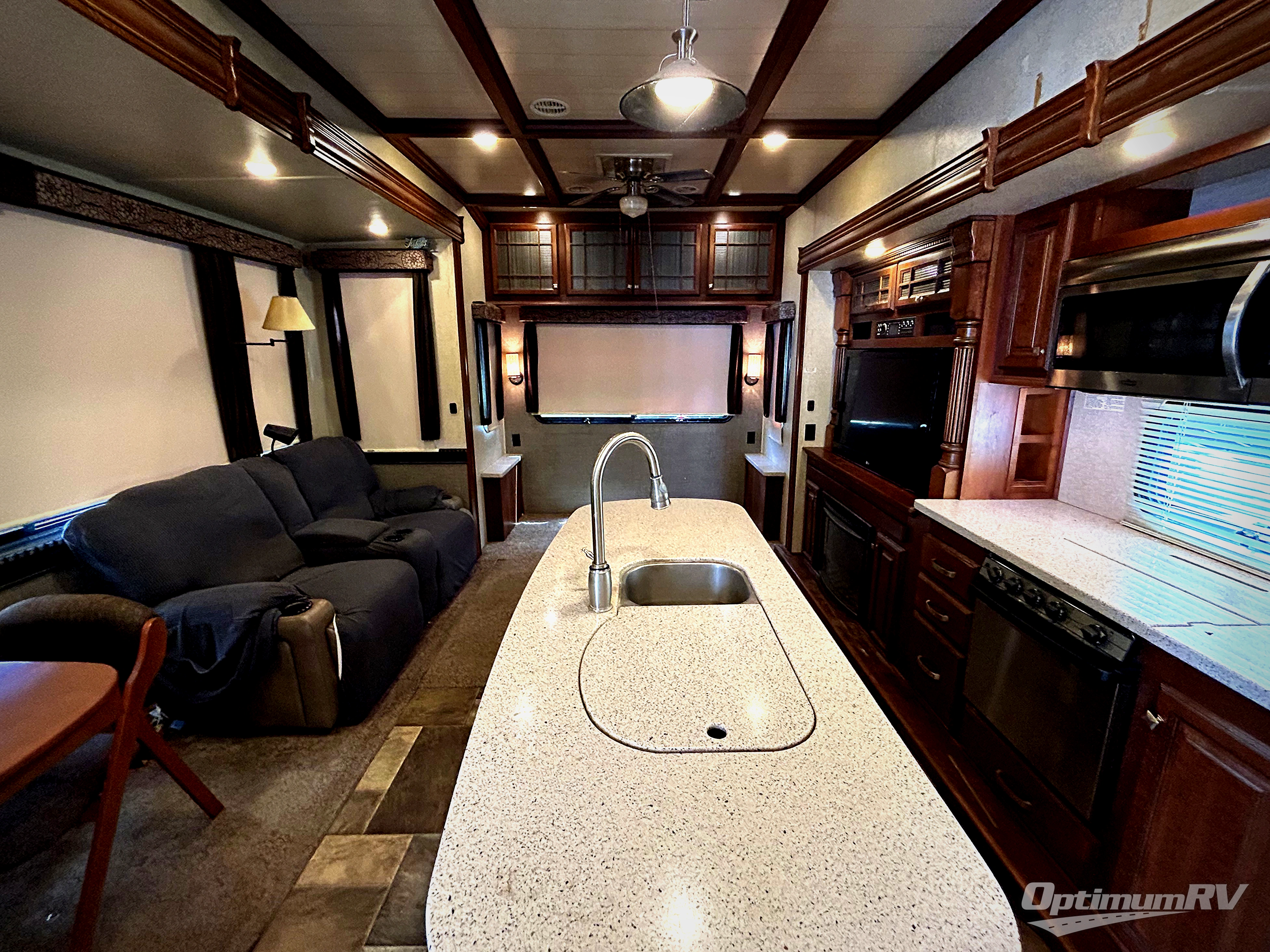 Step in and see how comfortable your next camping trip would be. There is a dining table for two within a slide out that also contains two swivel glider recliners as well. Along the rear wall find more seating with a sofa including end tables on either side. Adjacent to the sofa enjoy an entertainment center with flat screen TV that slides out, along with a pull-out desk, plus overhead storage. This slide also features the kitchen appliances which includes a double door refrigerator and a three burner range. There is also a kitchen island with double sink, and added counter space along the interior wall.