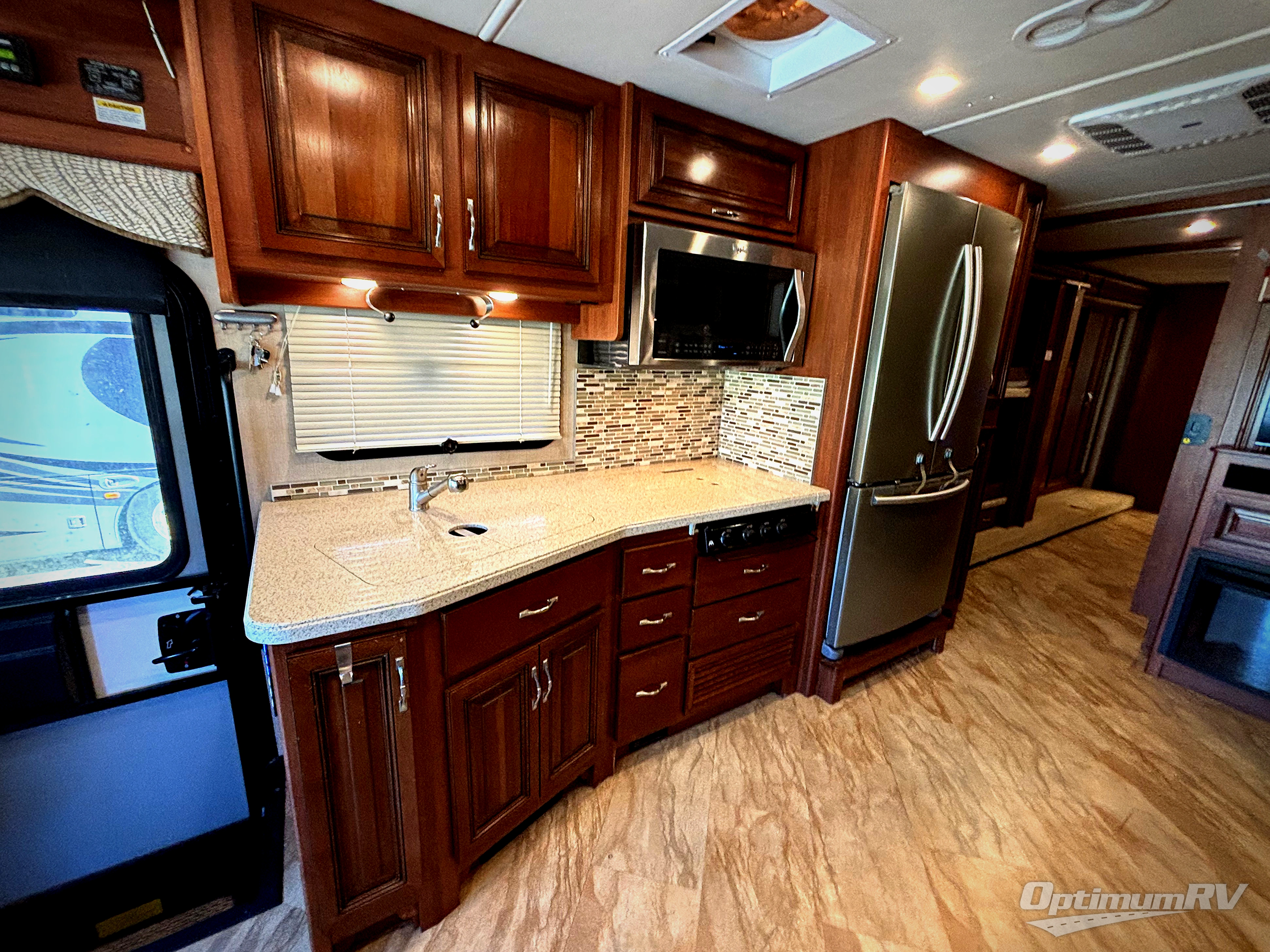 Along the curb side you will find a kitchen area that allows you to easily cook and prepare food along your journey. You will find a double sink, a three burner range with overhead microwave oven, refrigerator, and food pantry. There are also ample overhead cabinets for all of your dishes and things needed.