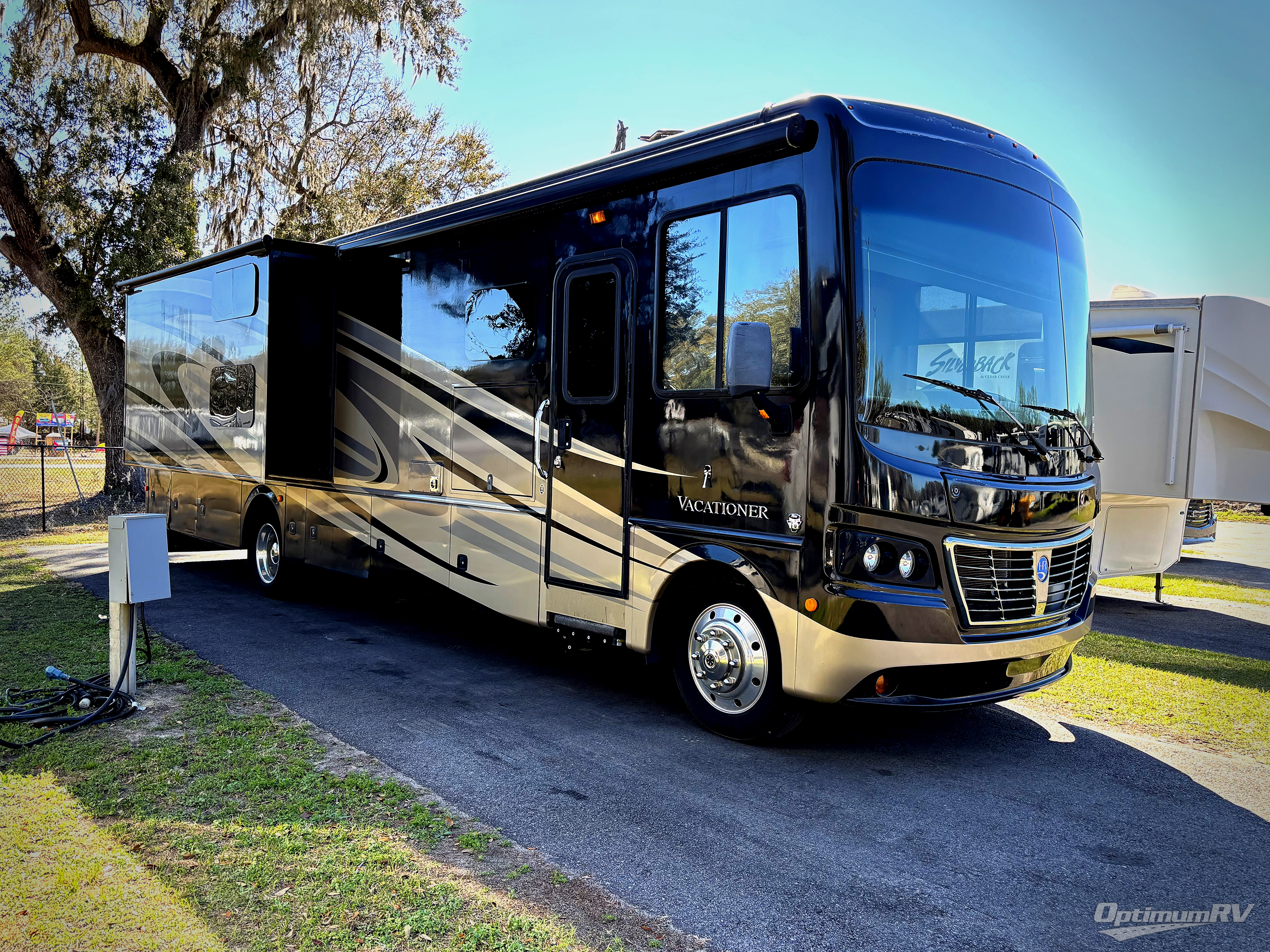 Plenty of room for the whole family can be found in this Vacationer class A gas coach by Holiday Rambler. Model 37BH features triple slides, bunks for the kiddos, and one and a half baths!